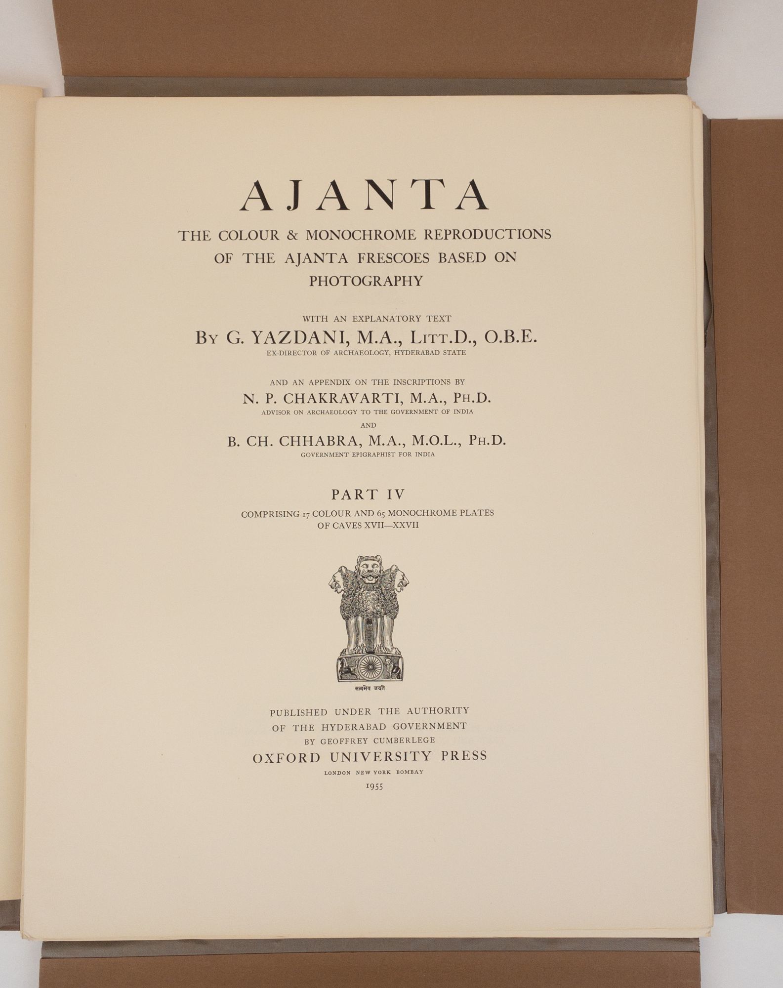 London: Oxford University Press, 1955. Loose folio. Folio, In Very Good condition. 13 pages, 82 plates (17 of which are in color). Housed in brown cloth folio case with gilt titling to front board. Case with light plus shelf wear and markings. Light bumping to edges and corners. Text and plates with light age-toning. Part IV only of a four-volume set, this volume covers Caves XVII-XXVII. SH Consignment.