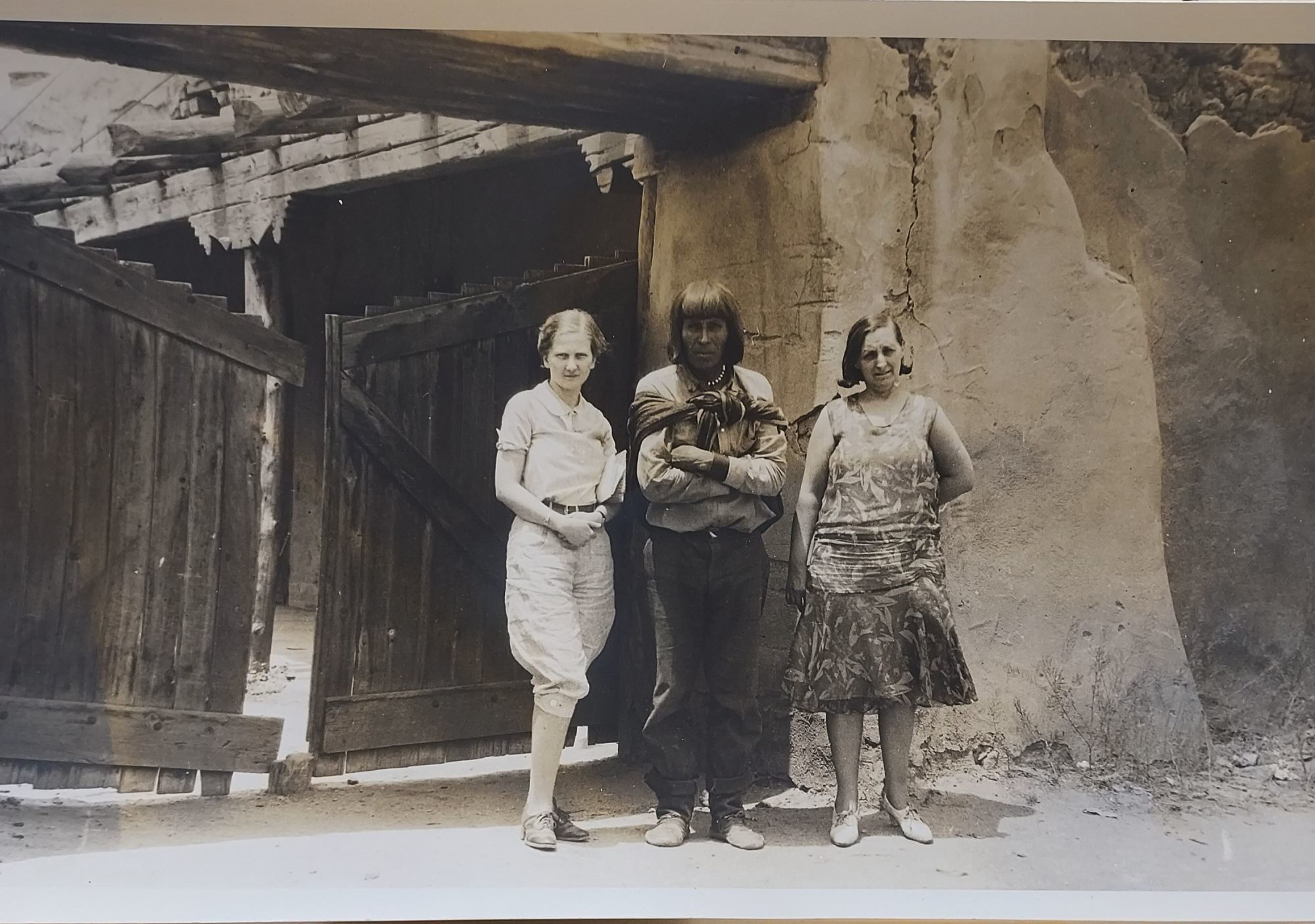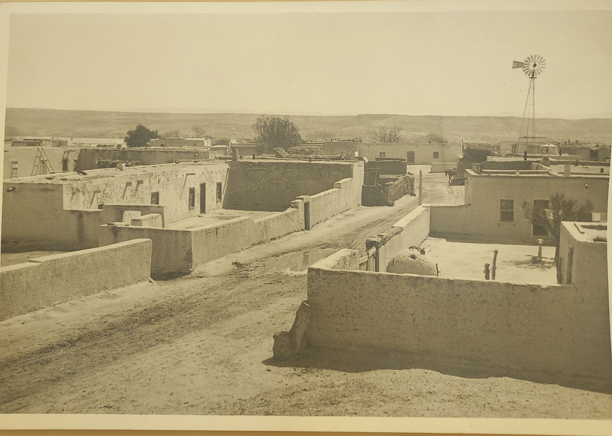 1930. Photograph. Three large format black and white photographs. Each approximately 14 x 8 1/2". Photographer unknown. "Indian Village of Isleta, N. Mex." written in pen on the reverse of the village photograph. A bit curled at the edges. Isleta is Spanish for "little island". Isleta lies in the Rio Grande Valley of the Albuquerque Basin on the west bank of the Rio Grande.