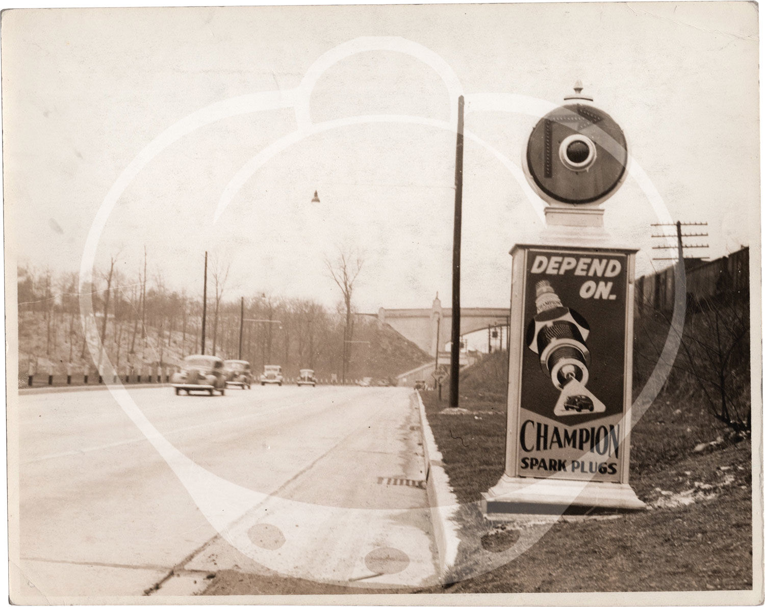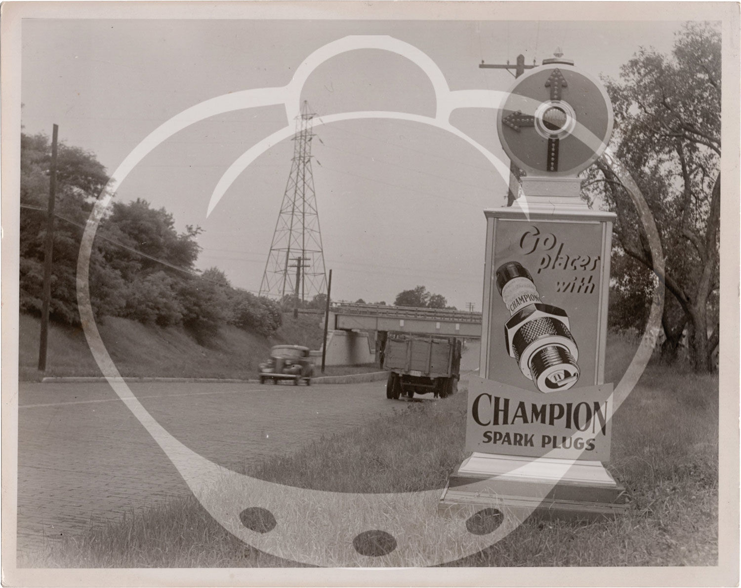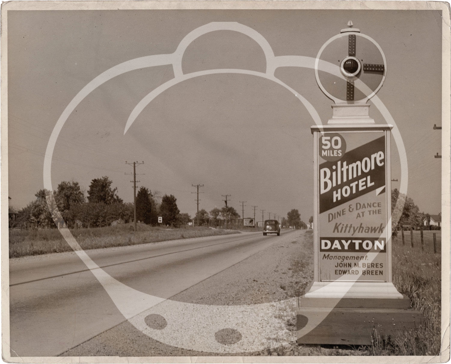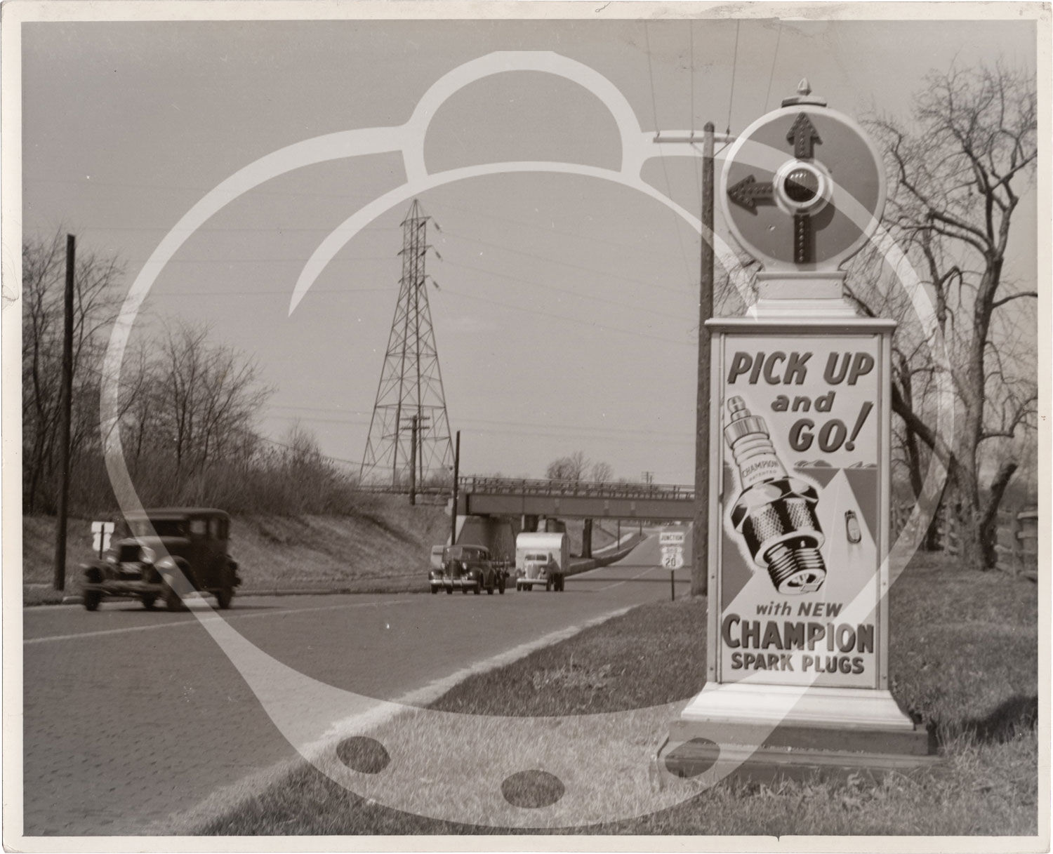 The collection contains thirteen photographs of alert signs advertising Champion spark plugs, seven advertising hotels (the Biltmore in Dayton, Hotel Sinton in Cincinnati, Hotel Adelphia in Philadelphia, Hotel Schenley in Pittsburgh, Hotel Webster Hall in Detroit, and two for Hotel Elizabeth Carteret in Elizabeth, New Jersey), three advertising radio stations (WJW and WADC of Akron and WSPD of Toledo), and three for various automobile and travel-related businesses.
