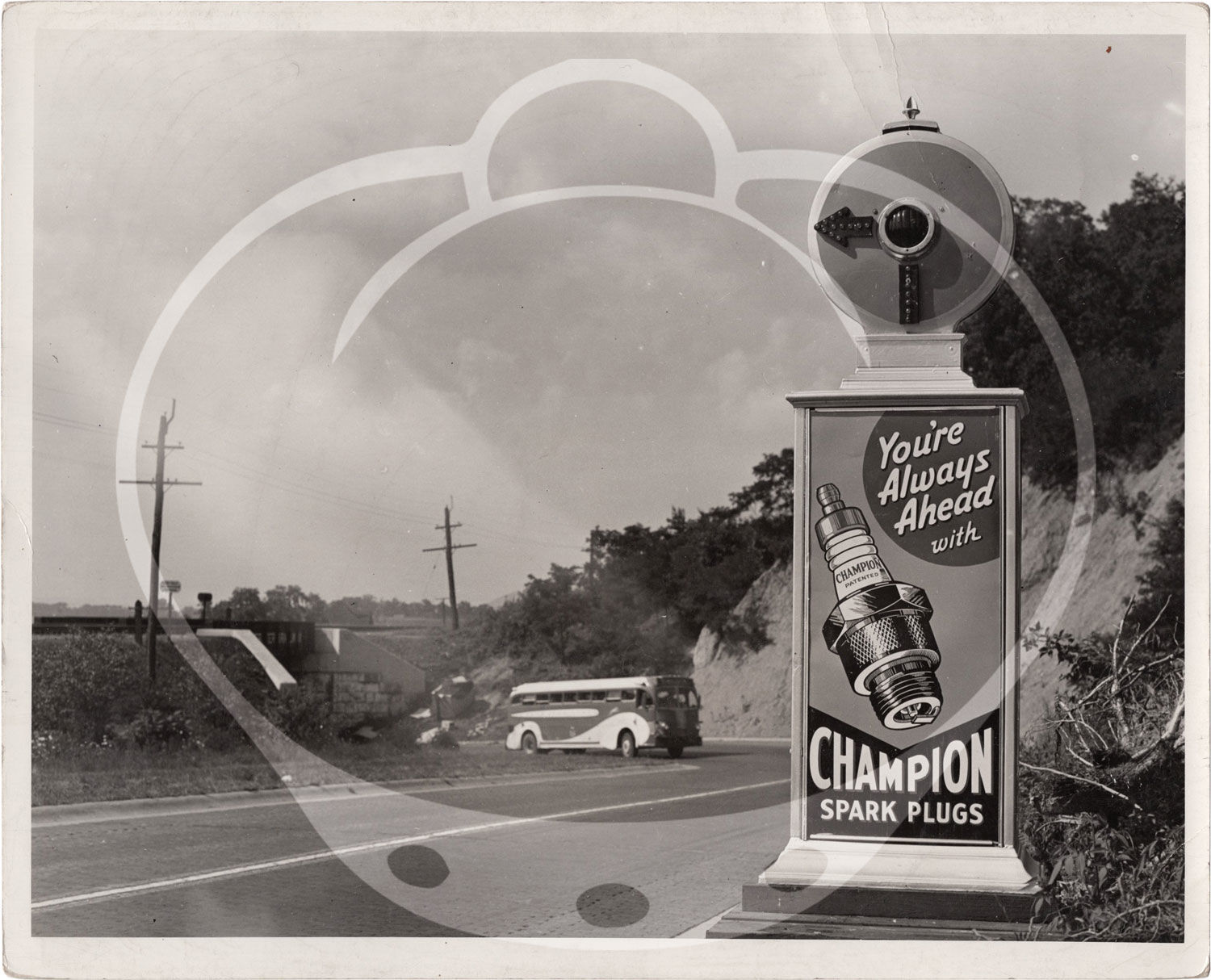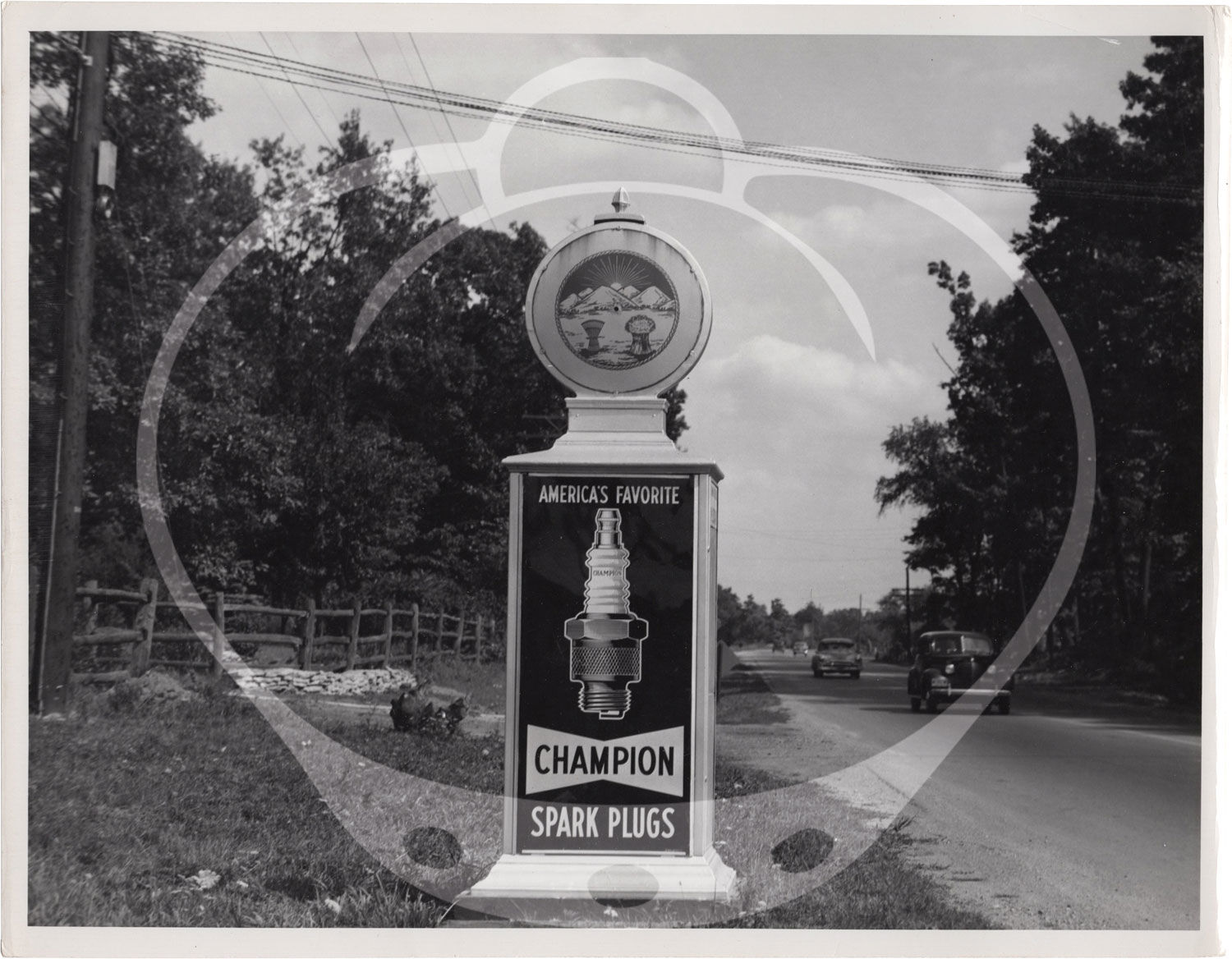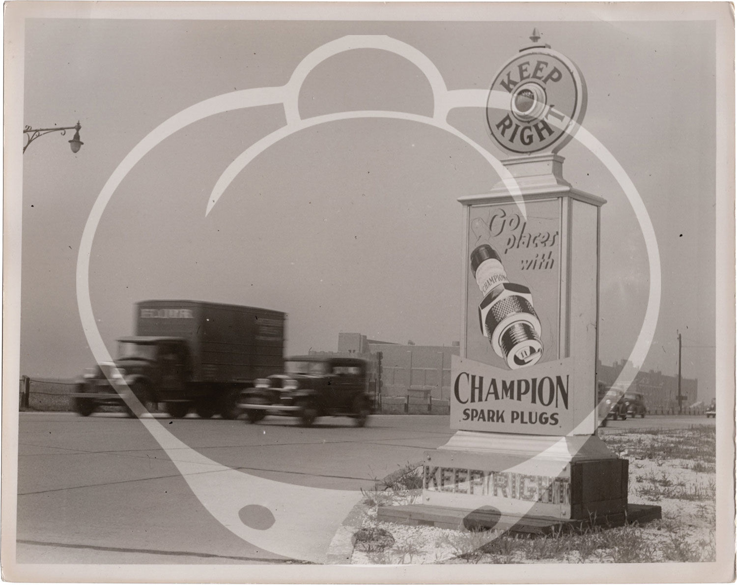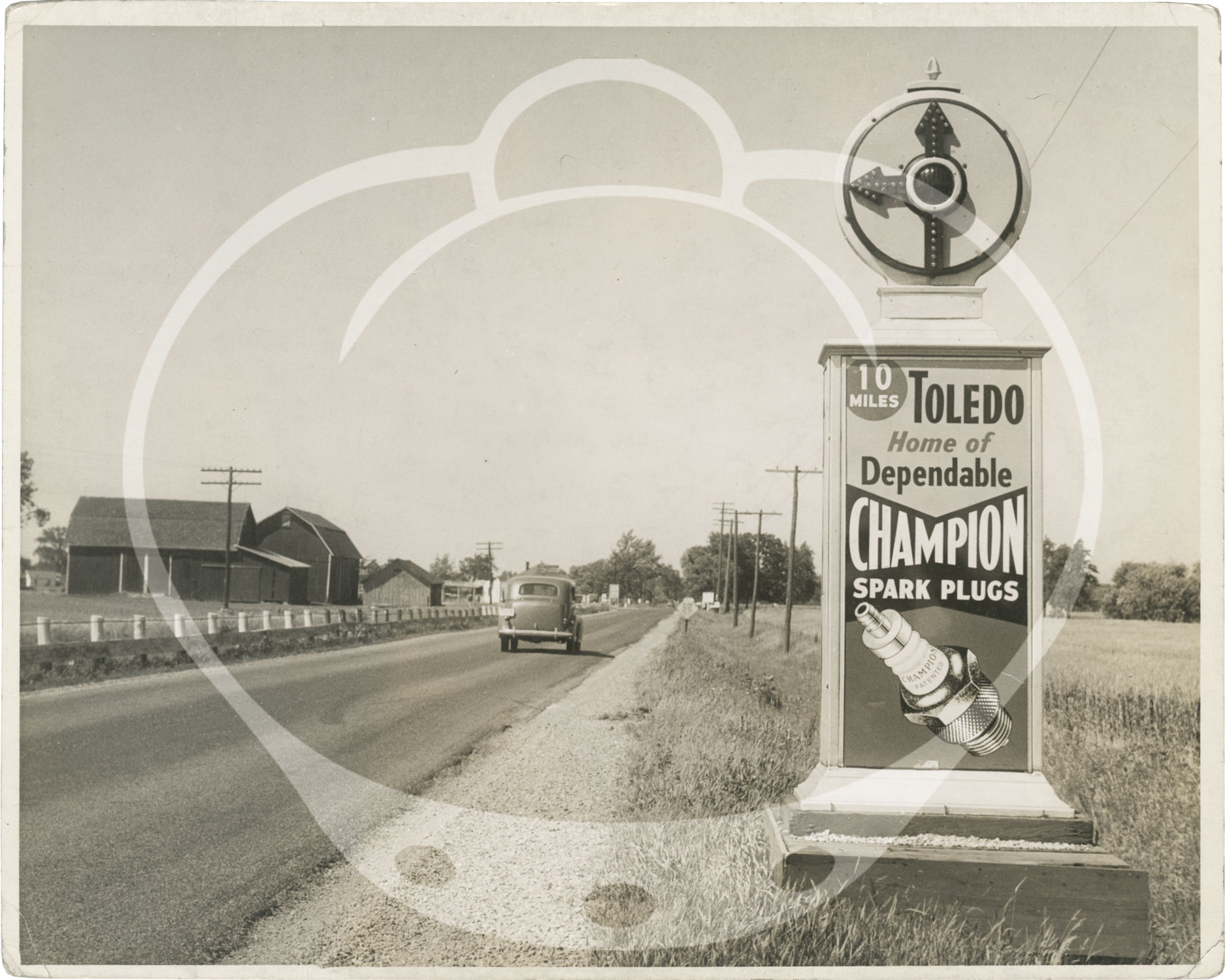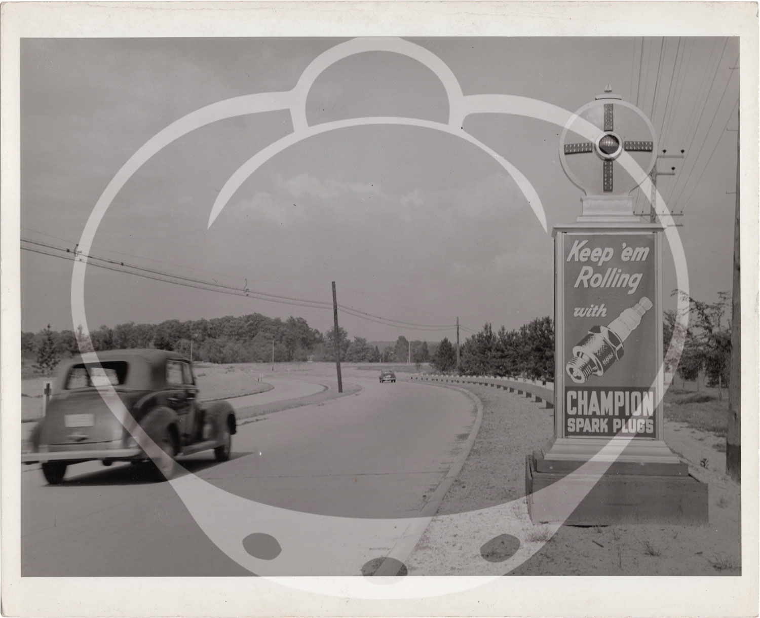 The collection contains thirteen photographs of alert signs advertising Champion spark plugs, seven advertising hotels (the Biltmore in Dayton, Hotel Sinton in Cincinnati, Hotel Adelphia in Philadelphia, Hotel Schenley in Pittsburgh, Hotel Webster Hall in Detroit, and two for Hotel Elizabeth Carteret in Elizabeth, New Jersey), three advertising radio stations (WJW and WADC of Akron and WSPD of Toledo), and three for various automobile and travel-related businesses.