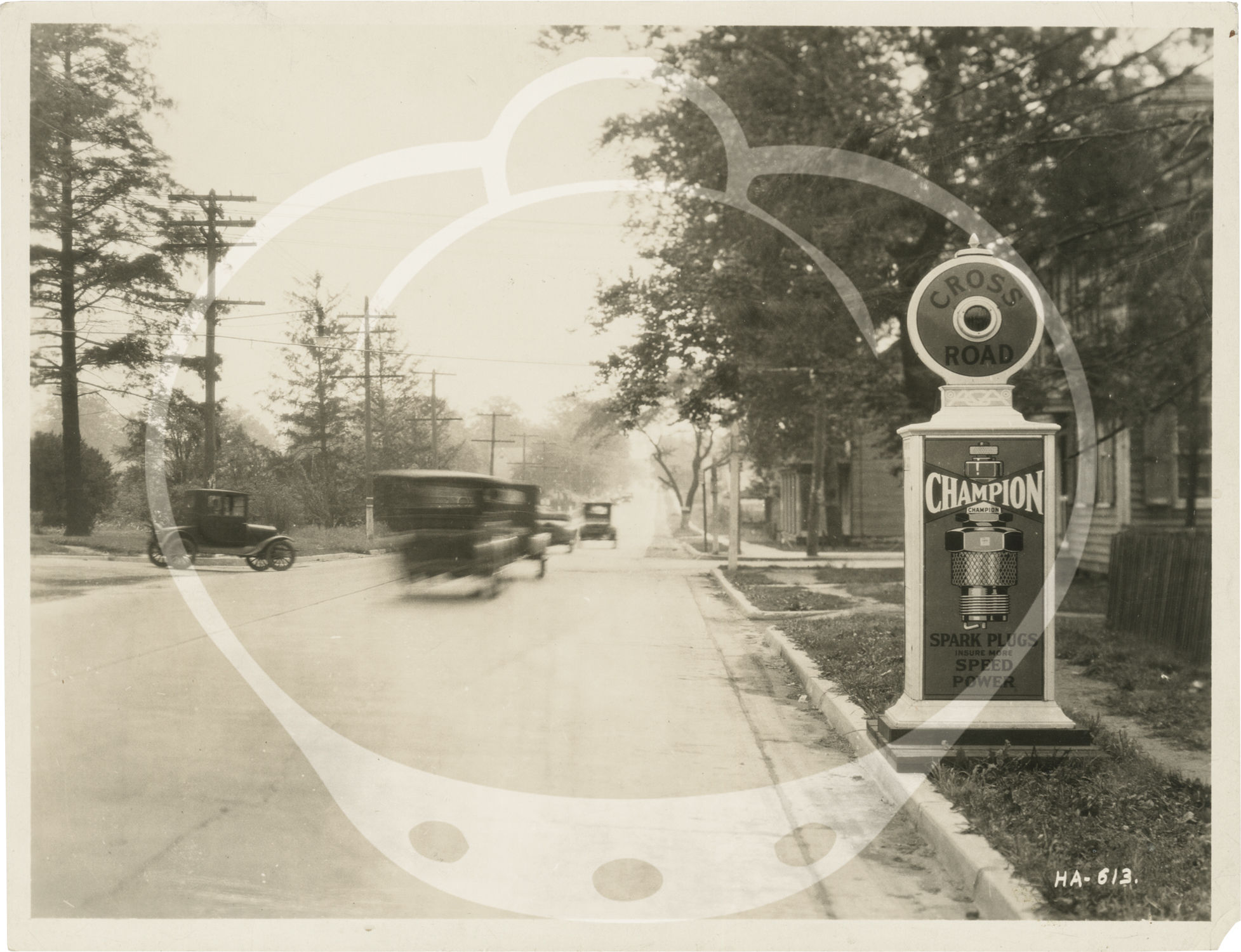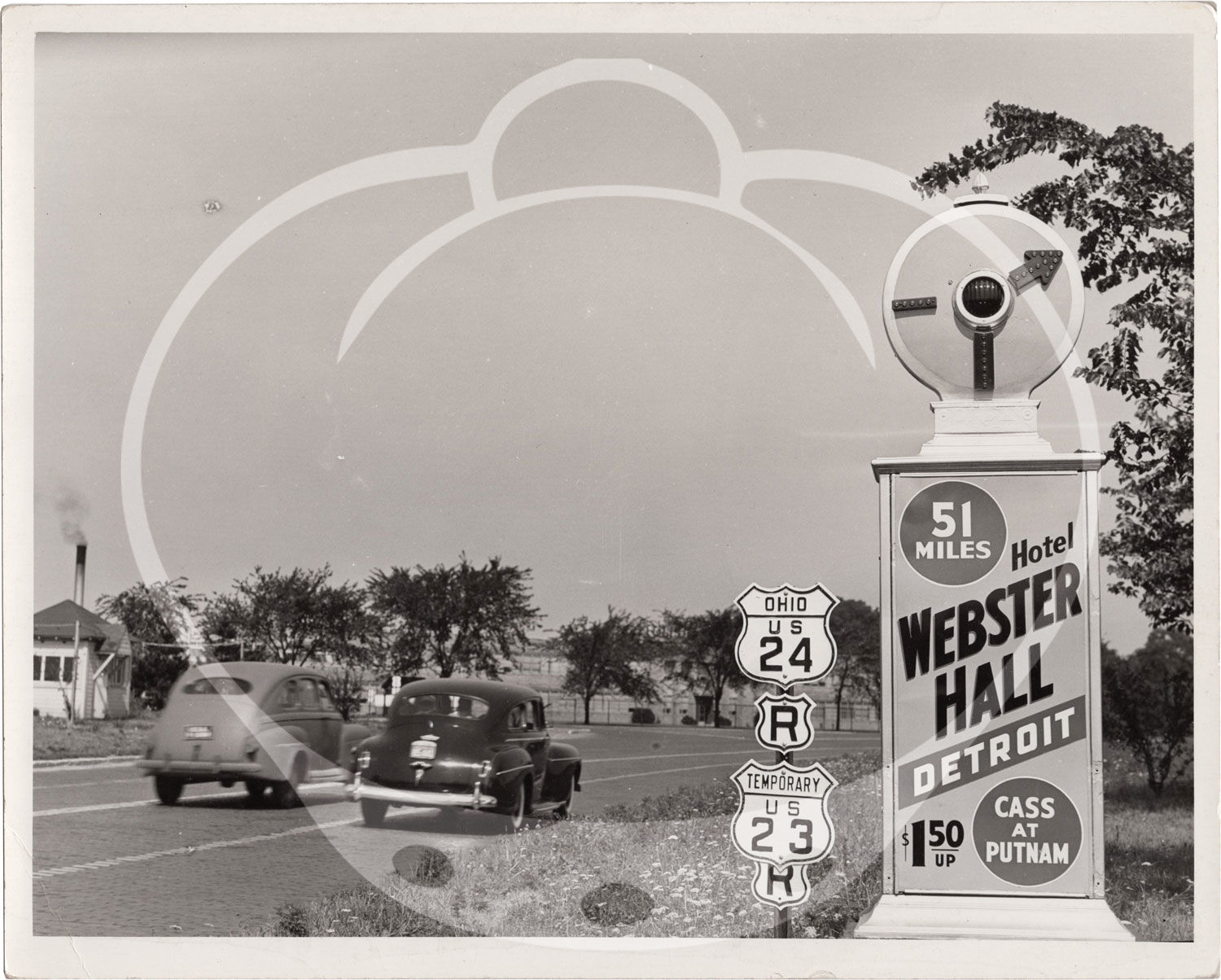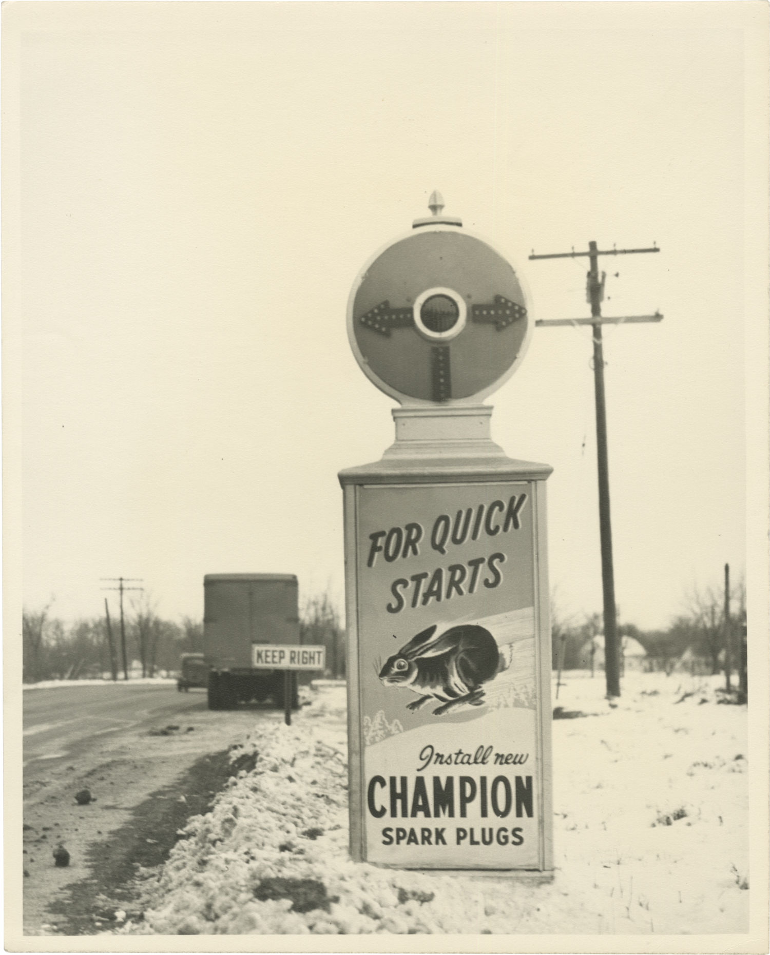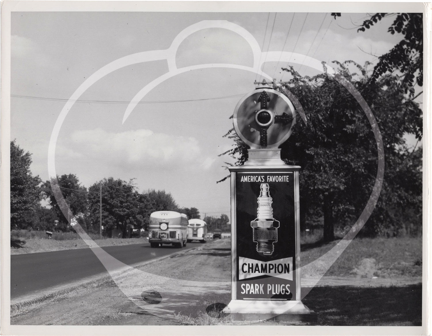 The collection contains thirteen photographs of alert signs advertising Champion spark plugs, seven advertising hotels (the Biltmore in Dayton, Hotel Sinton in Cincinnati, Hotel Adelphia in Philadelphia, Hotel Schenley in Pittsburgh, Hotel Webster Hall in Detroit, and two for Hotel Elizabeth Carteret in Elizabeth, New Jersey), three advertising radio stations (WJW and WADC of Akron and WSPD of Toledo), and three for various automobile and travel-related businesses.