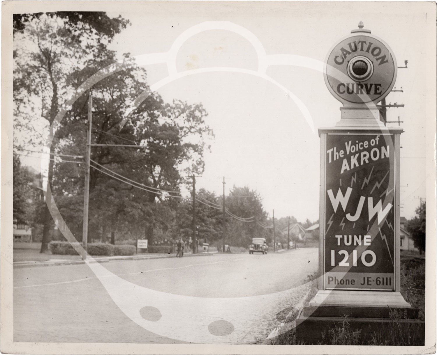 Ostensibly designed to warn drivers of forthcoming crossroads, turns, or junctions, the roadside alert signs presented here were perhaps more effective for the prime advertising real estate of their plinths. The circular "alert" section, containing text or symbols of approaching traffic changes and usually containing a center piece of reflective glass, was mounted to a large freestanding base, used for advertising automobile products, radio stations, local businesses, and travel locations.