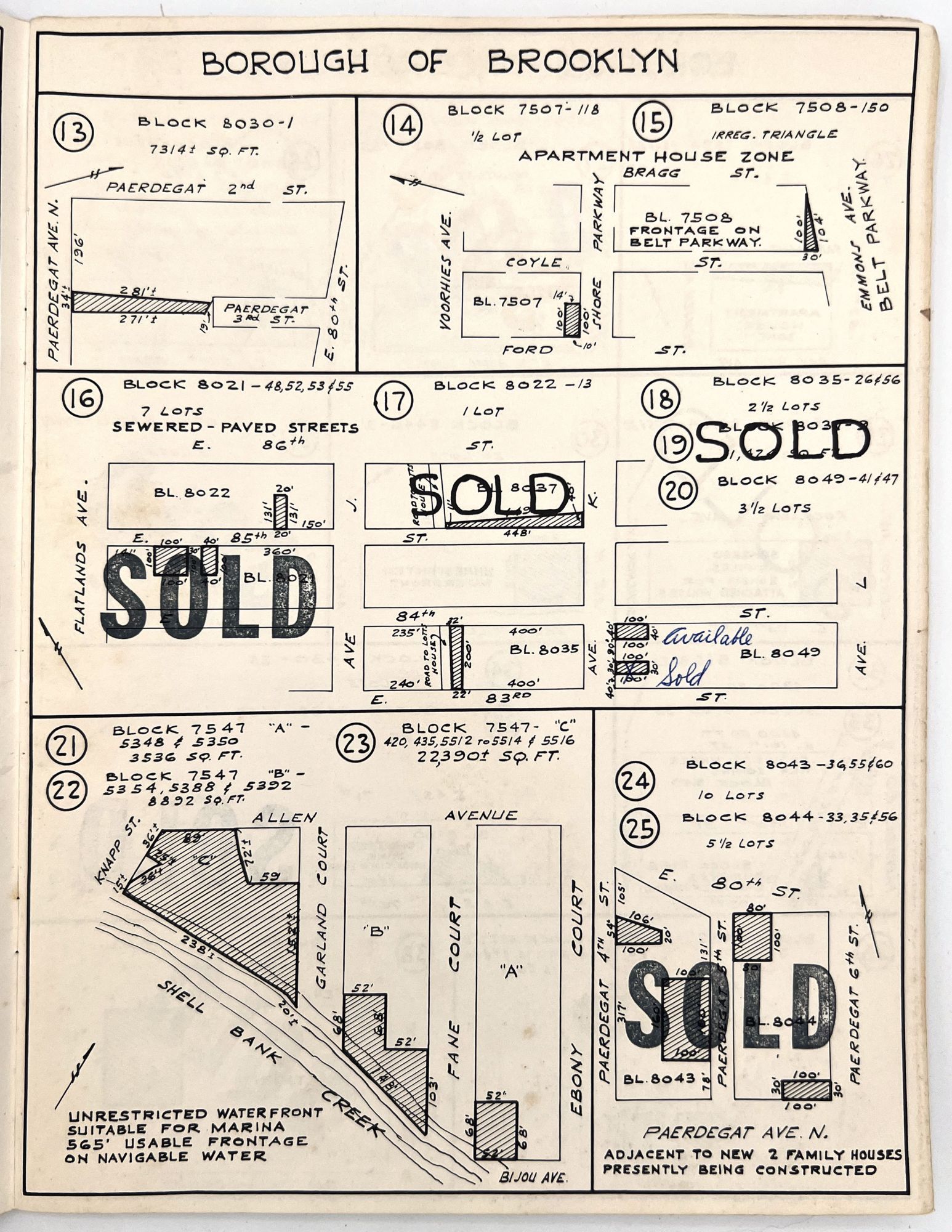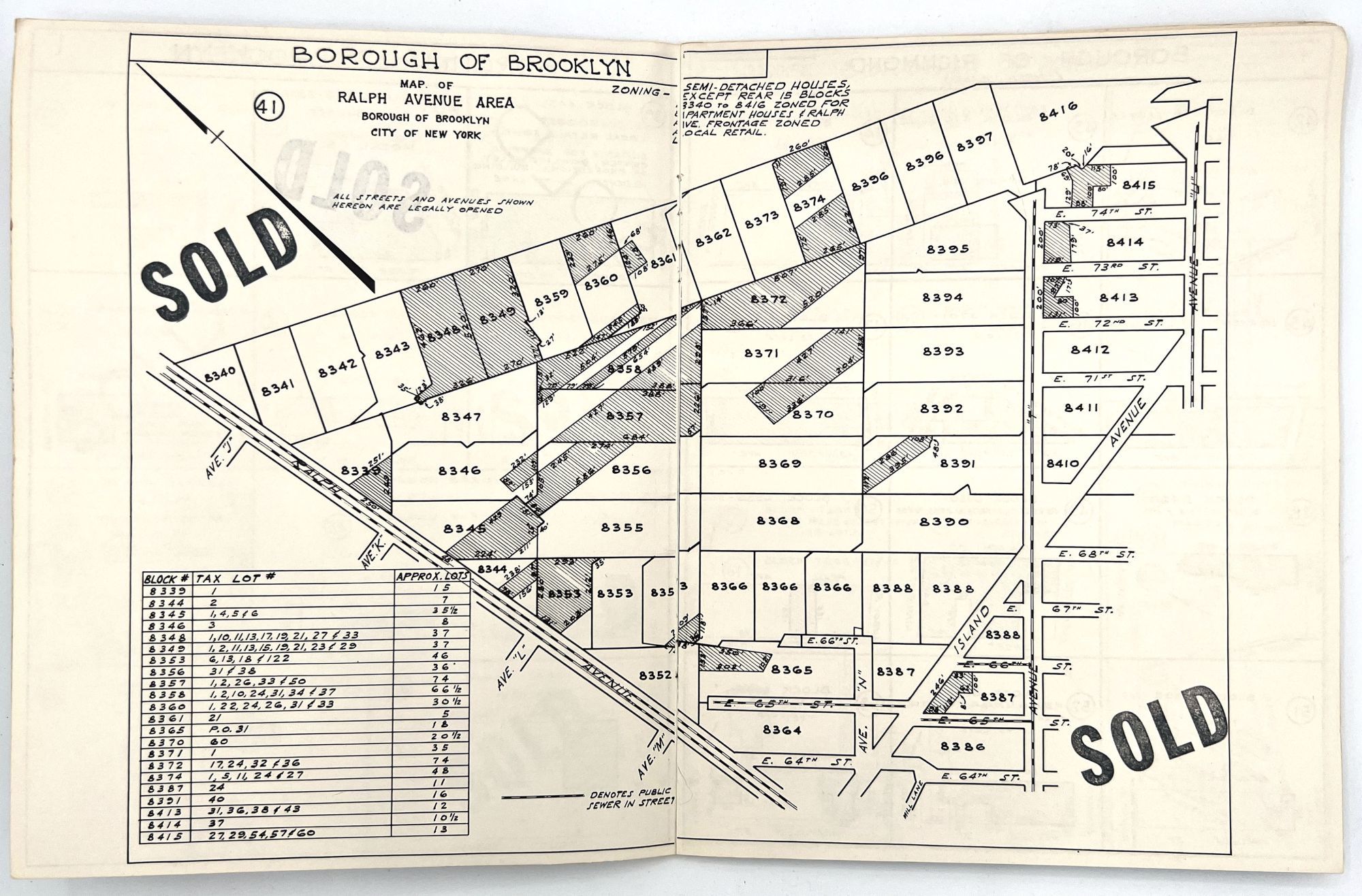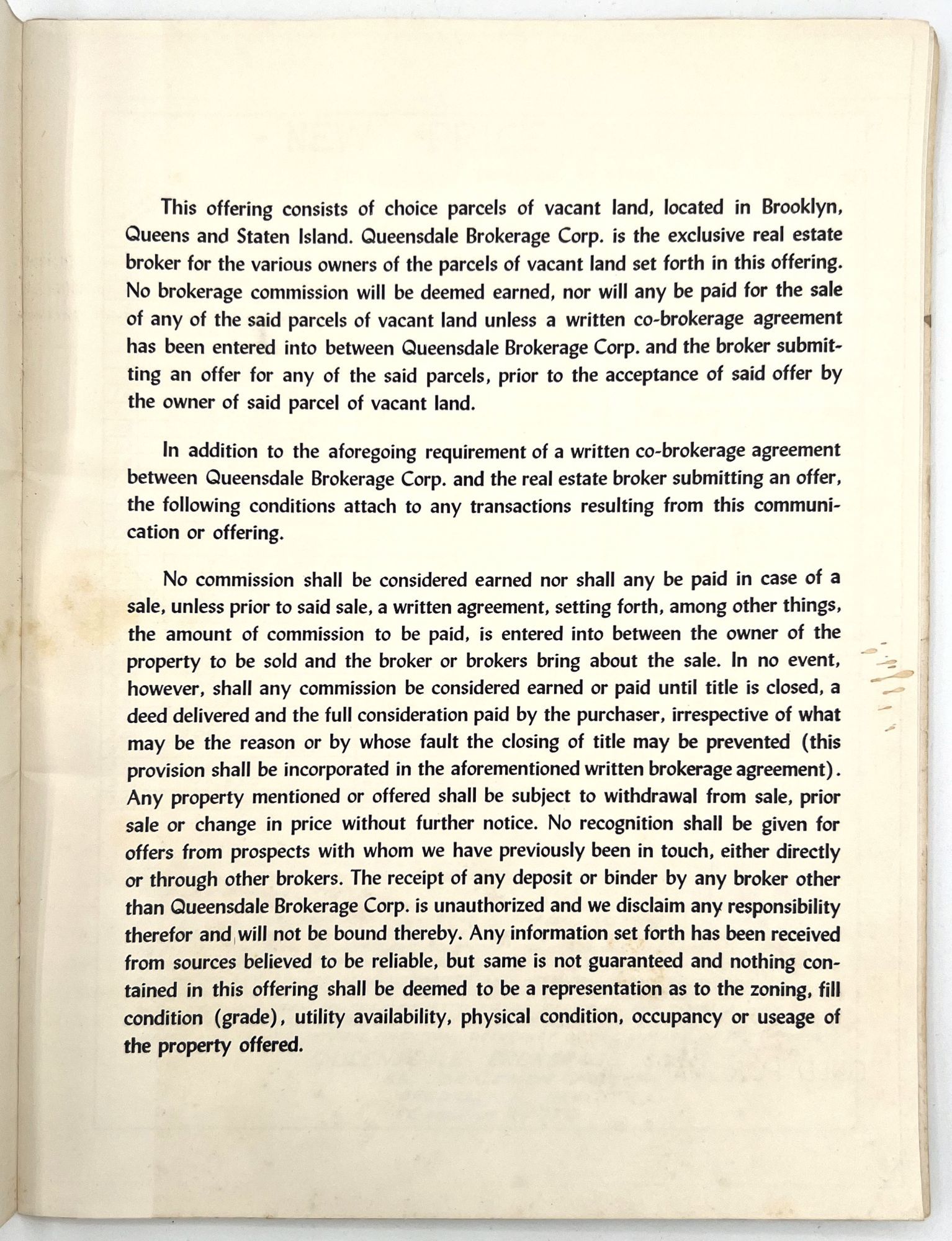Brooklyn, New York: Queensdale Brokerage Corp, 1962. Very good. Wrappers somewhat dust soiled, the occasional minor water stain or nick. Extremities a little worn.. A listing "of choice parcels of vacant land, located in Brooklyn, Queens and Staten Island" for sale by the Queensdale Brokerage Corp. Includes maps of the areas, with some parcels marked as "sold", as well as a price sheet with lot numbers and terms of sale. Folio (11" by 8.5"), pp. [22], with maps in-text. Stapled in original wrappers printed in teal, yellow, and black with illustrated map of Brooklyn, Queens, and Staten Island.