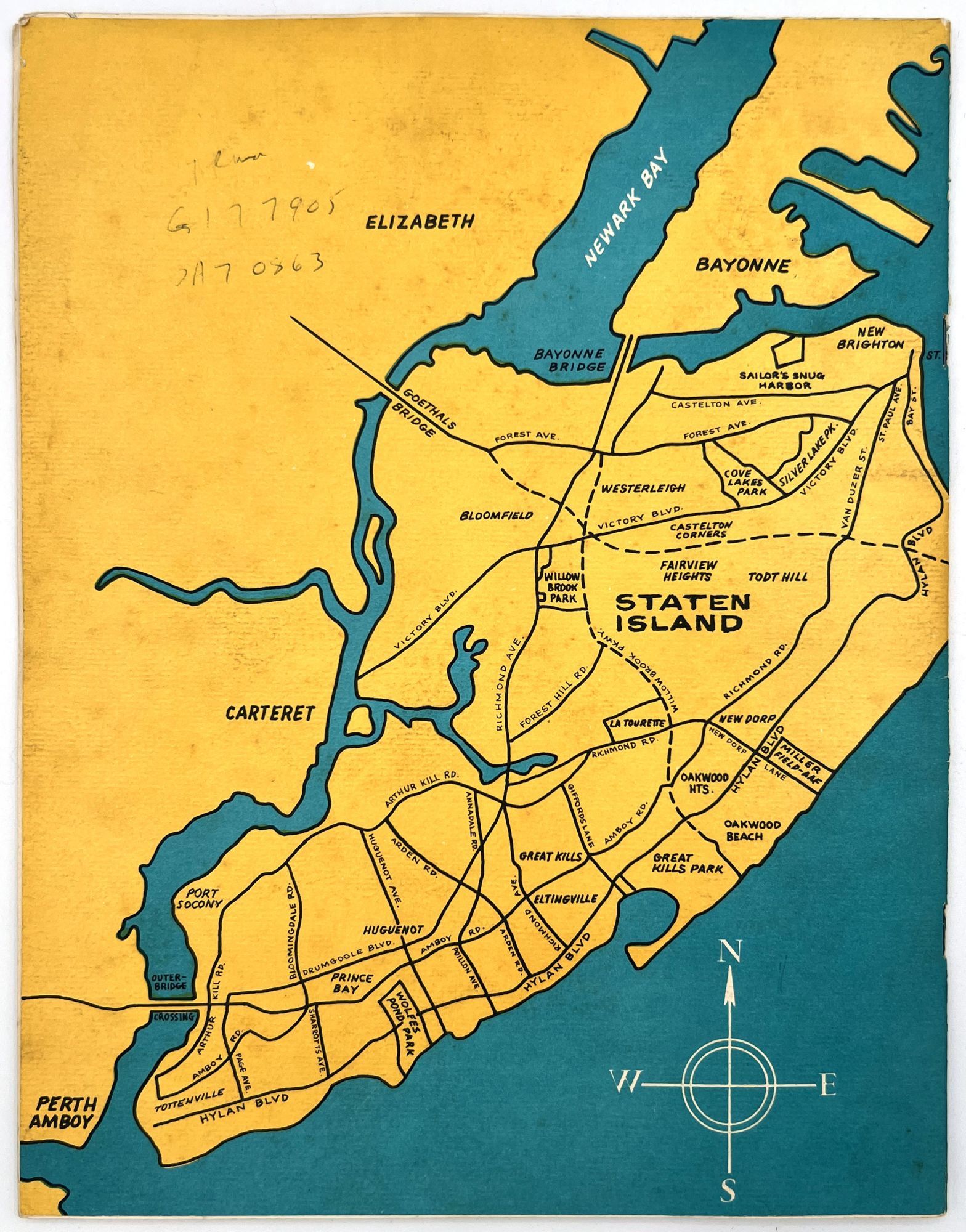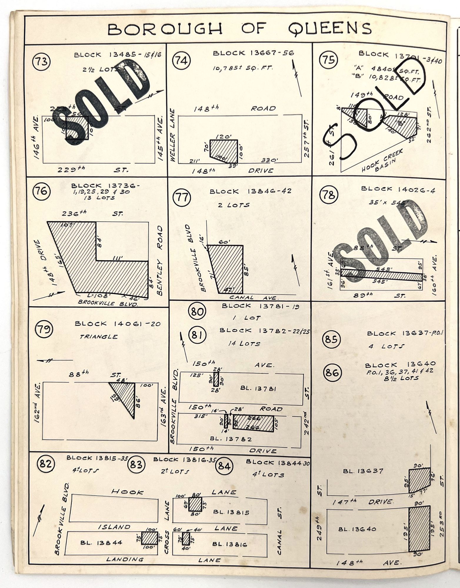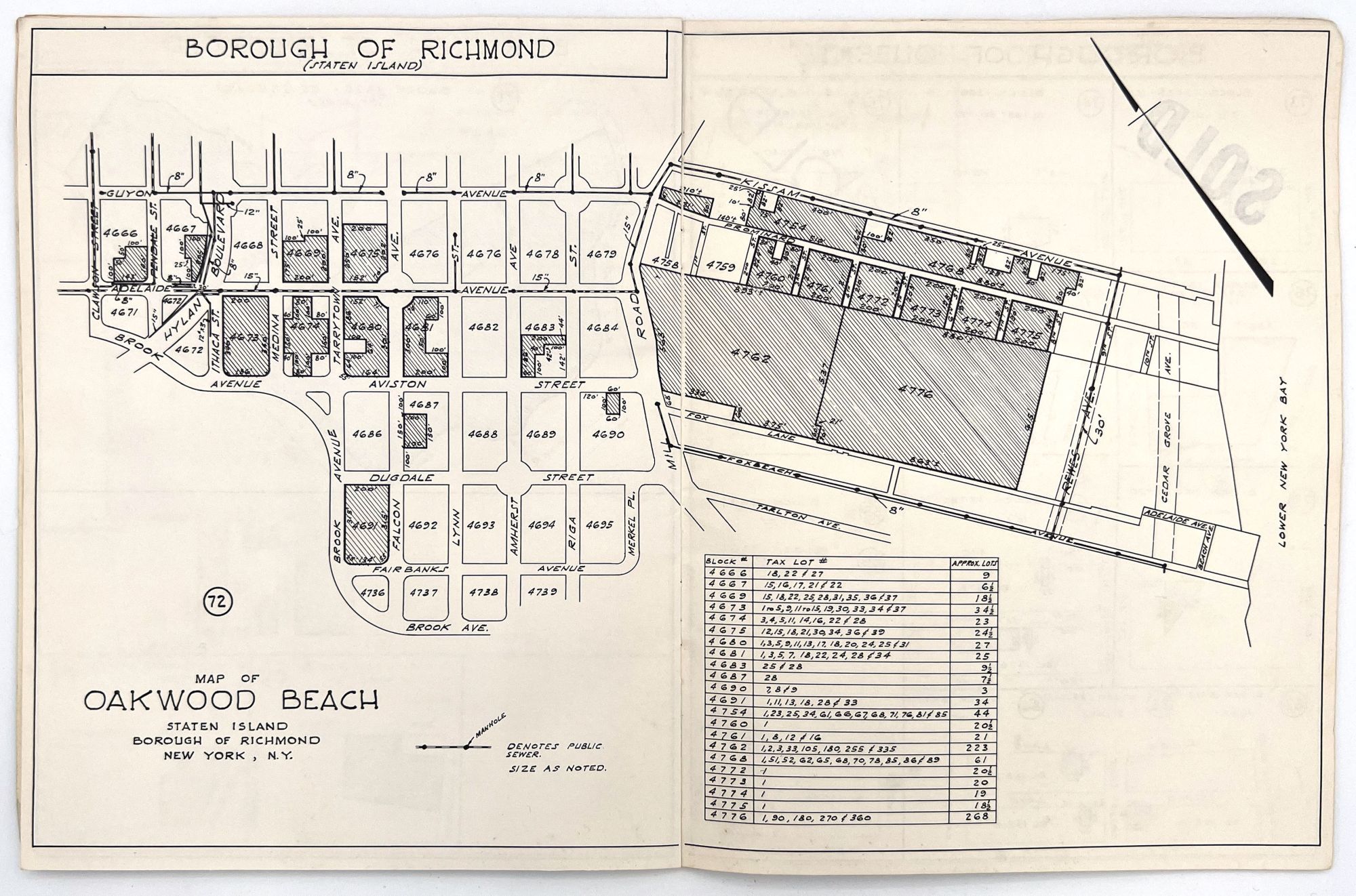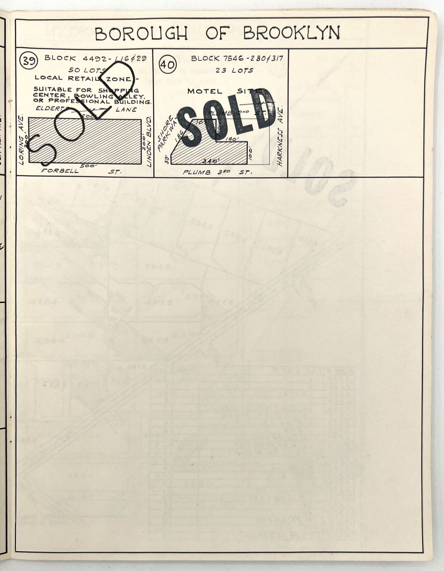 Brooklyn, New York: Queensdale Brokerage Corp, 1962. Very good. Wrappers somewhat dust soiled, the occasional minor water stain or nick. Extremities a little worn.. A listing "of choice parcels of vacant land, located in Brooklyn, Queens and Staten Island" for sale by the Queensdale Brokerage Corp. Includes maps of the areas, with some parcels marked as "sold", as well as a price sheet with lot numbers and terms of sale. Folio (11" by 8.5"), pp. [22], with maps in-text. Stapled in original wrappers printed in teal, yellow, and black with illustrated map of Brooklyn, Queens, and Staten Island.