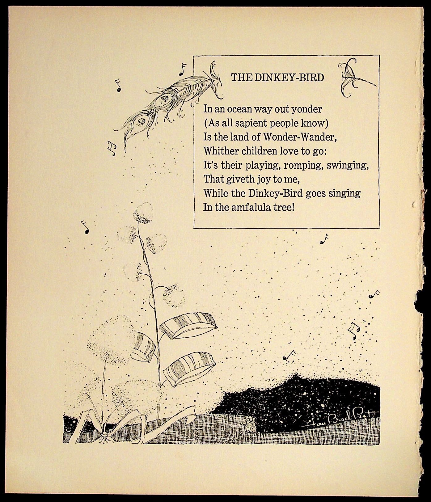 Full color illustration. Includes an additional page with a verse "The Dinkey Bird." Suitable for framing. Size: about 11.5 x 10 inches. Print/120922.