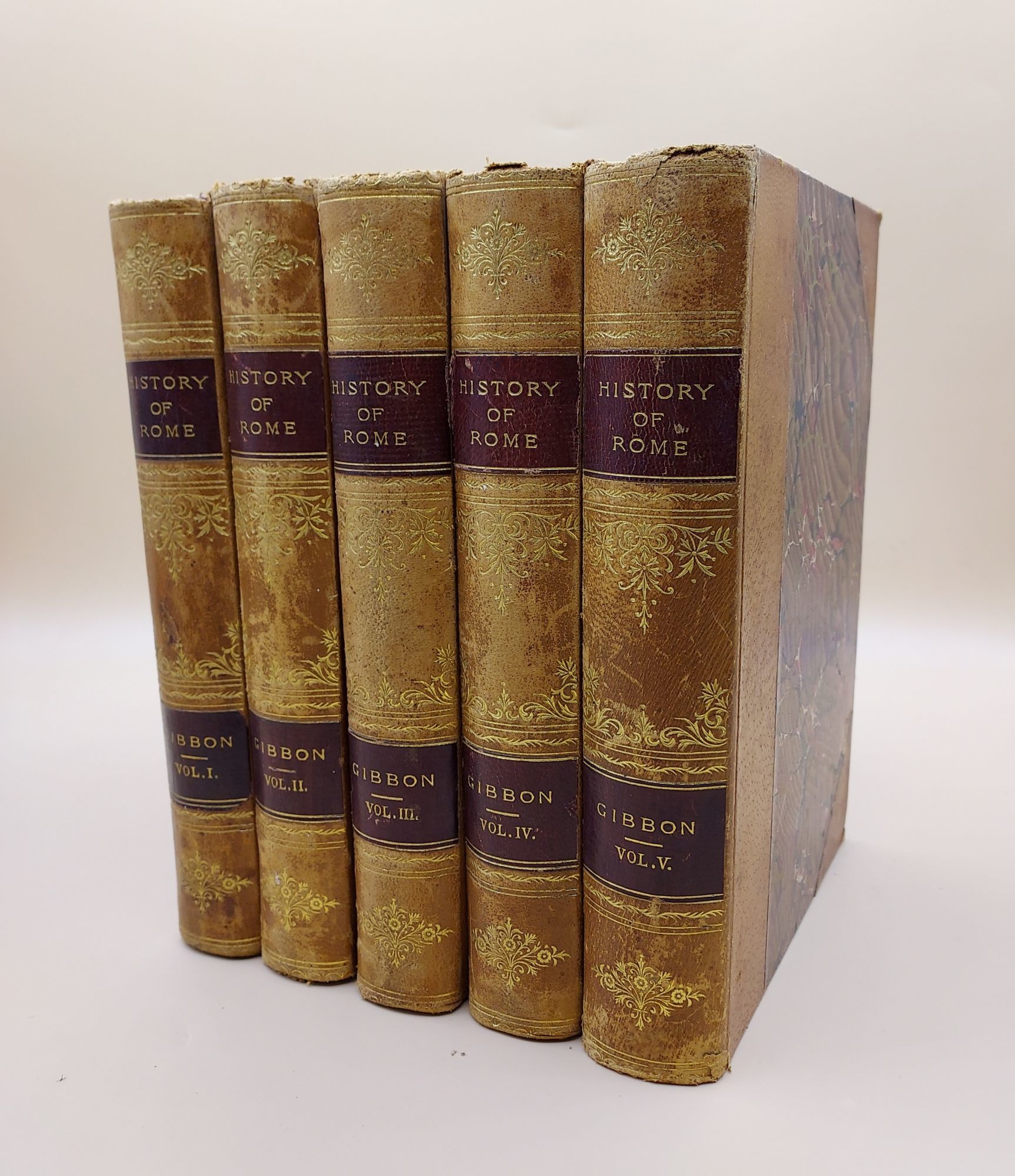 New York: American Publishers Corporation, 1880. A New Edition. Leather bound. Very good. 626; 631; 622; 662; 899pp. Duodecimo [19 cm] 3/4 brown leather with marbled paper over boards, leather spine labels, and gilt stamped floral designs on the spine. Top edge gilt. Marbled endpapers. The extremities are moderately rubbed, and the spine ends are occasionally a little chipped. The text blocks of a couple of the volumes are cracked at the beginning, however overall the set is very sturdy. An attractive set of Gibbon's monumental work, originally published in 6 volumes between 1776 and 1788.