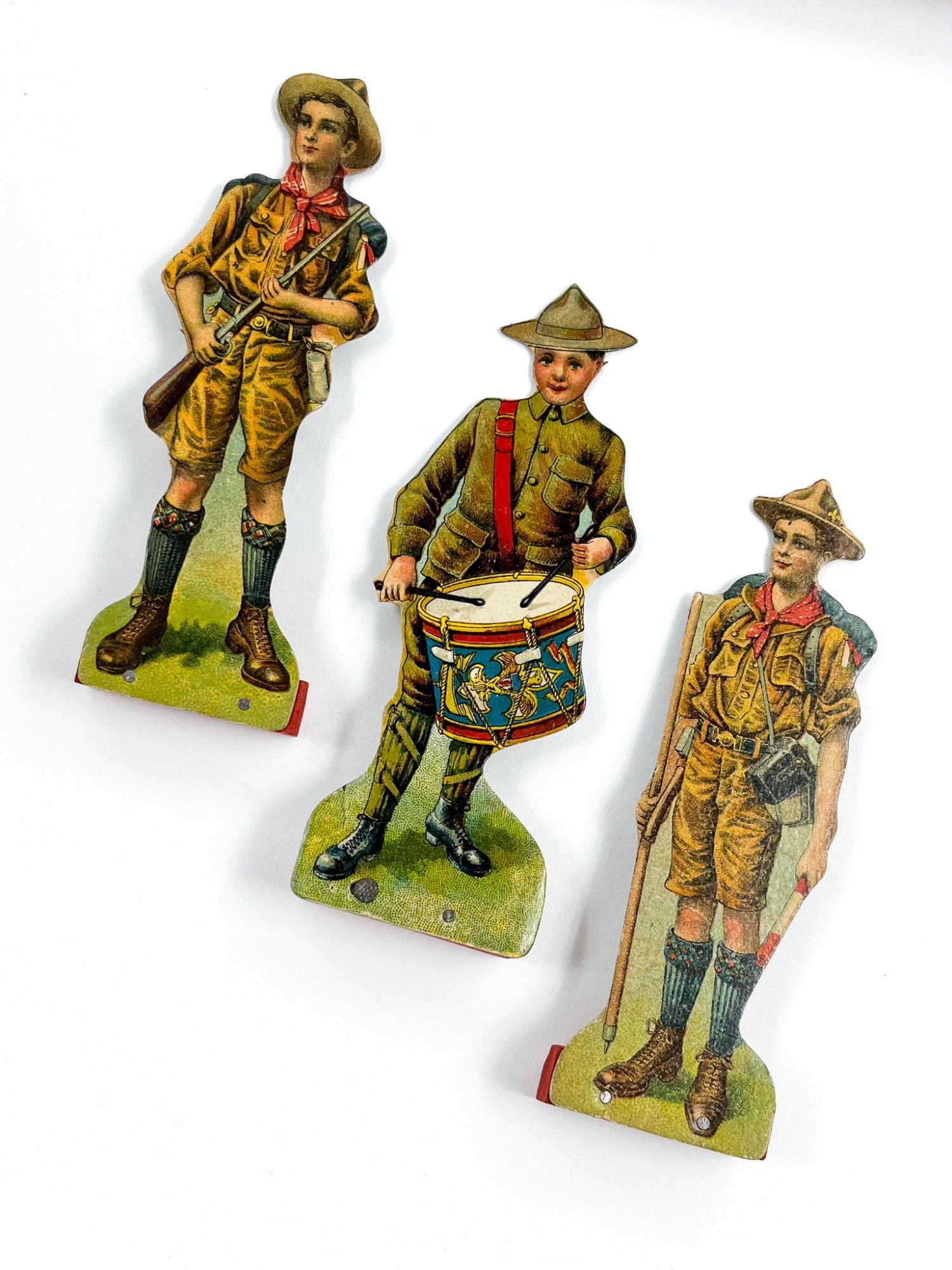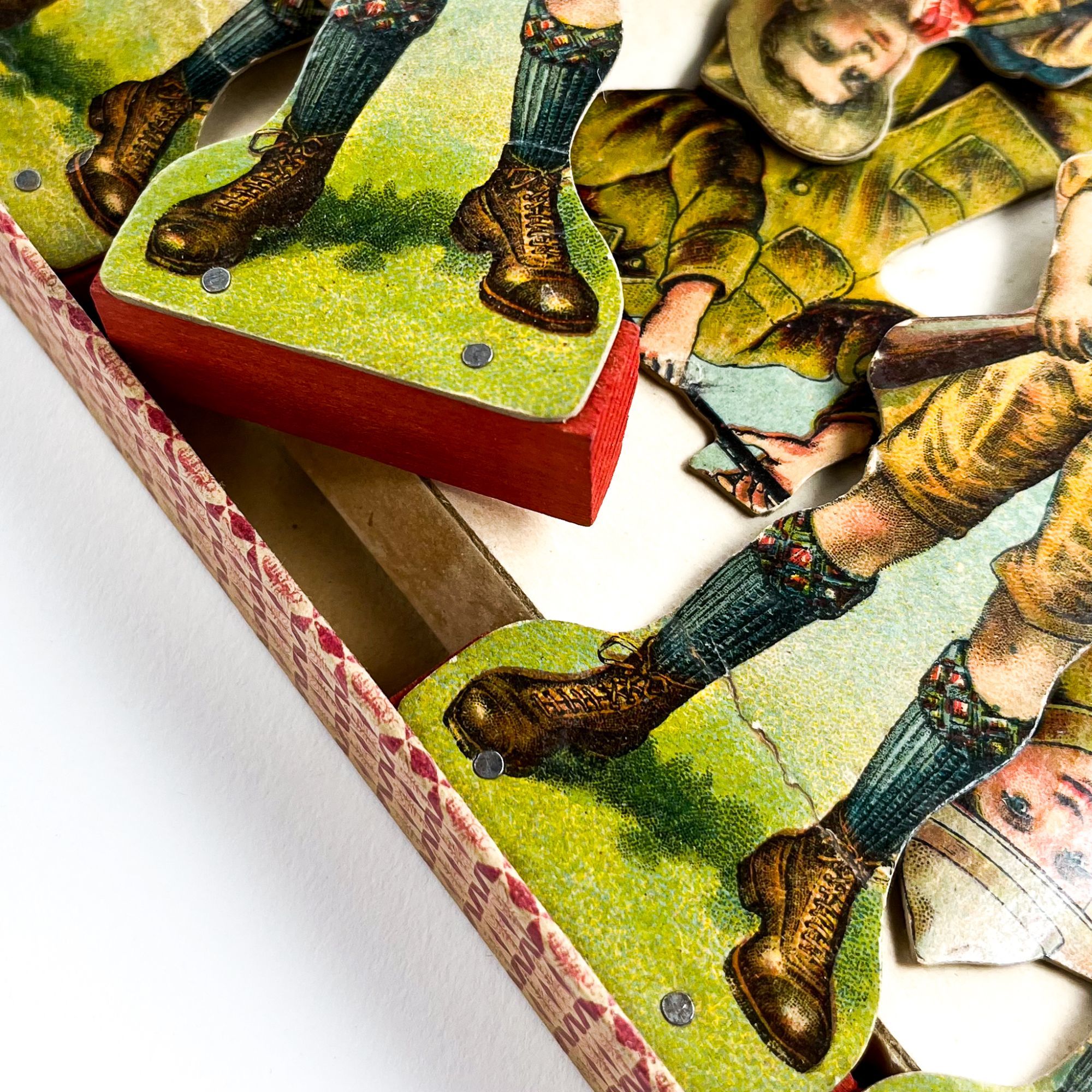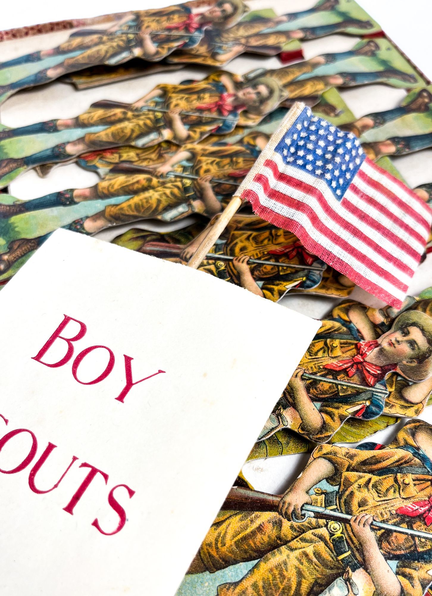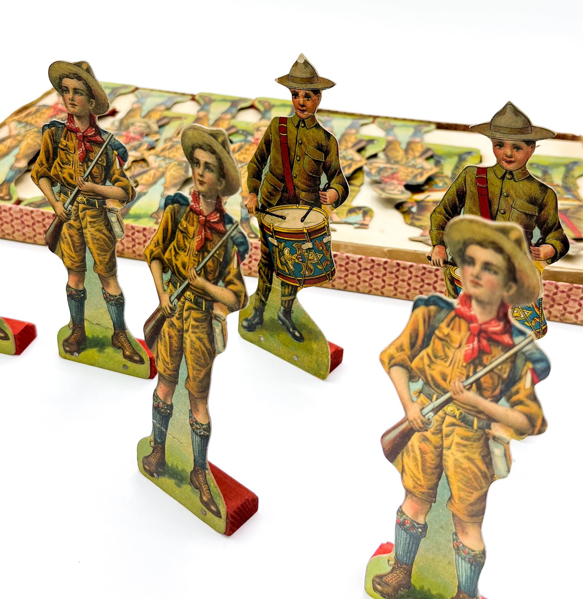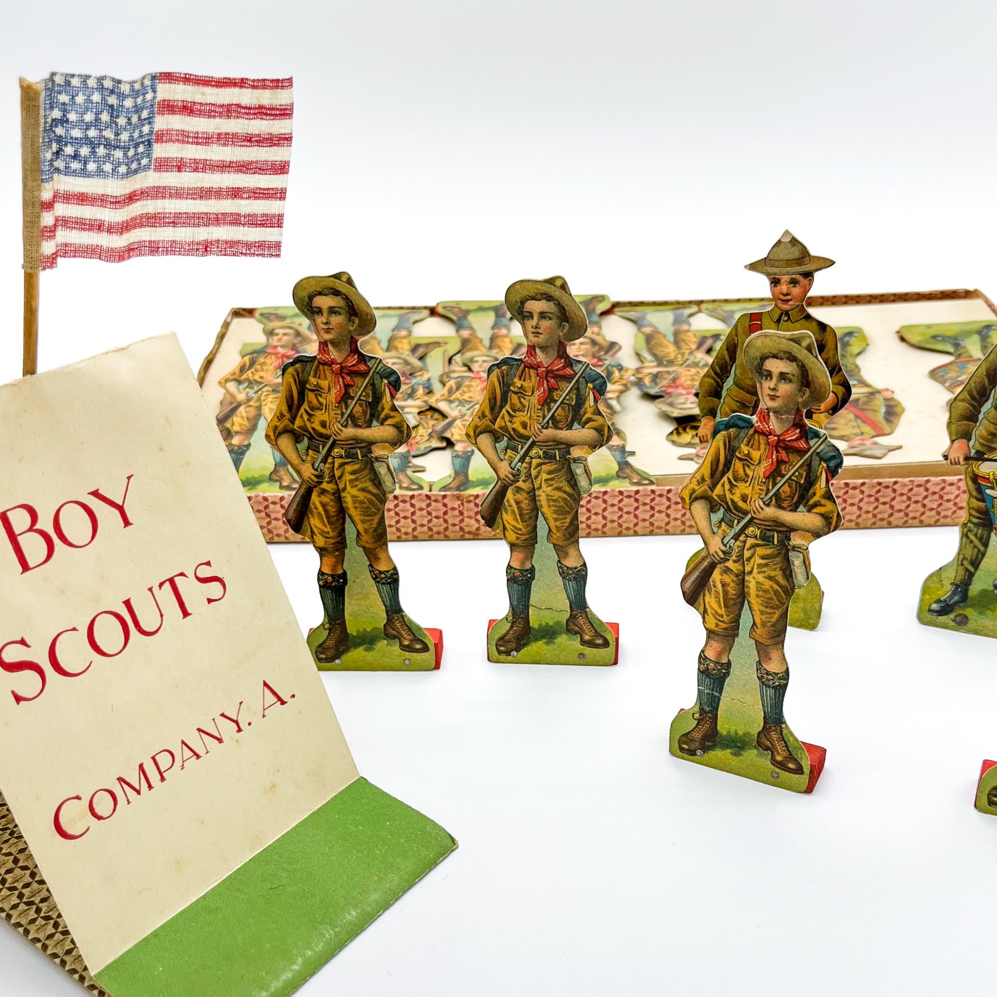 New York: McLoughlin Bros, 1915. Near fine in very good box.. Complete set of 22 Boy Scout paper toys and a pop-up tent, executed in McLoughlin's signature vibrant chromolithography. THE BOY SCOUTS IN CAMP showcases classic McLoughlin style and illustrates the social mindset of pre-WWI America. Though the set lacks a date, we find a listing for it in a McLoughlin catalogue from 1915, under the category of "Soldier Games" alongside sets of "Skirmishers" and "War, with Rapid Fire Guns." This proximity is significant: as WWI raged in Europe and vocal contingents lobbied for America to join the fray, the Boy Scouts were framed as "little soldiers at home" ("Marketing the War on the Home Front") and modeled their uniforms and discipline on military standards. The blurry line between Scout and soldier is literal in THE BOY SCOUTS IN CAMP: though the pipers and drummers in this collection appear to be very young, their uniforms more closely resemble those of Doughboys than Scouts, indicating that McLoughlin may have repurposed the figure designs from a more explicitly military set. This set is not often found complete in such nice condition. 8.75'' x 16.5'' (box); 5.75'' x 1.75'' (boys). 22 chromolithograph dolls on stiff card with red wooden bases: 14 boys with rifles, two leader boys, two doughboy pipers, four doughboy drummers. One pop-up "tent" with American flag made of cloth. In original box with chromolithograph pictorial lid. Lid with light wear and mild toning, a few infills; tray with careful tape reinforcements to corners. A few figures with cracking near ankles, still sound. Bright.