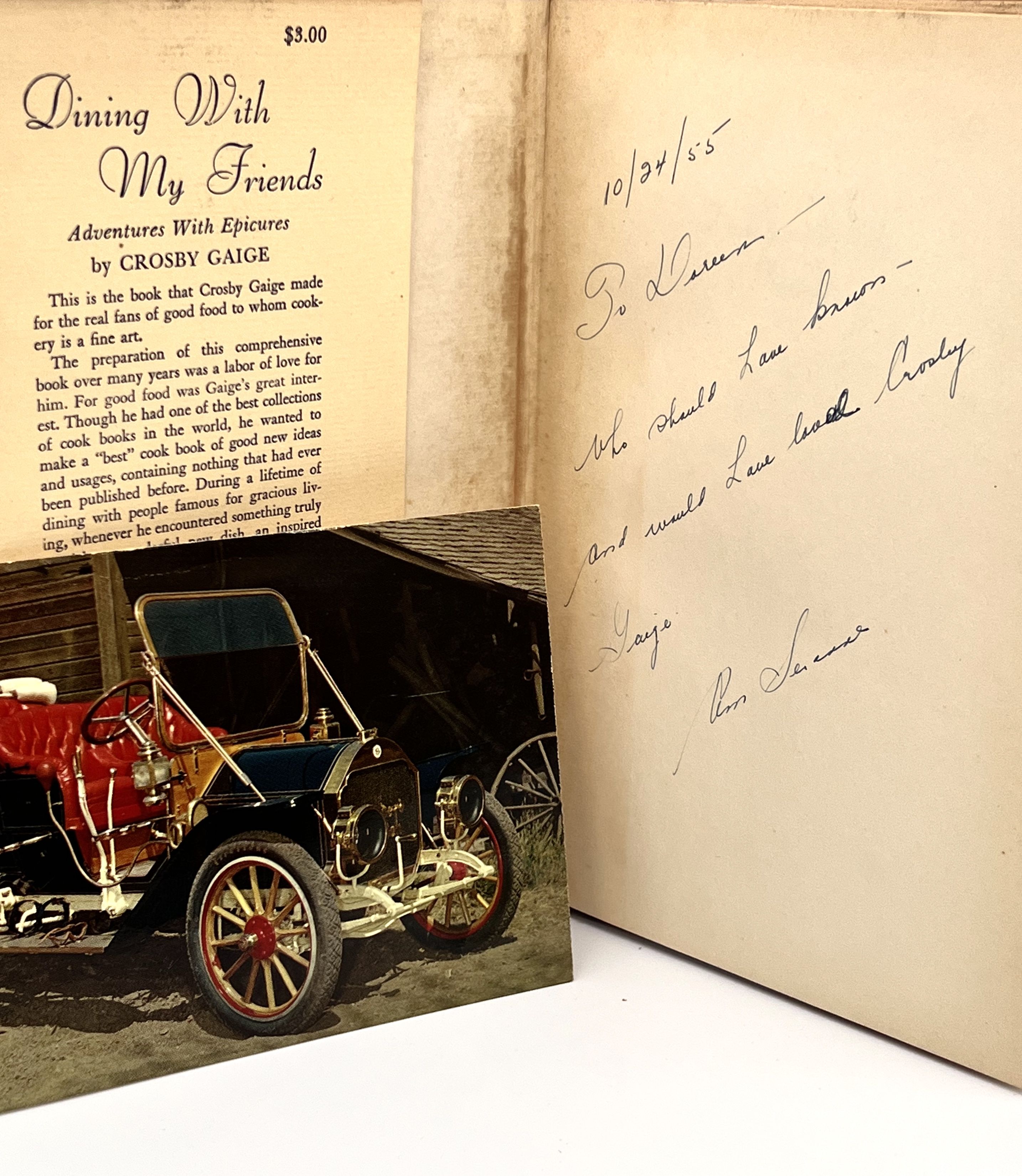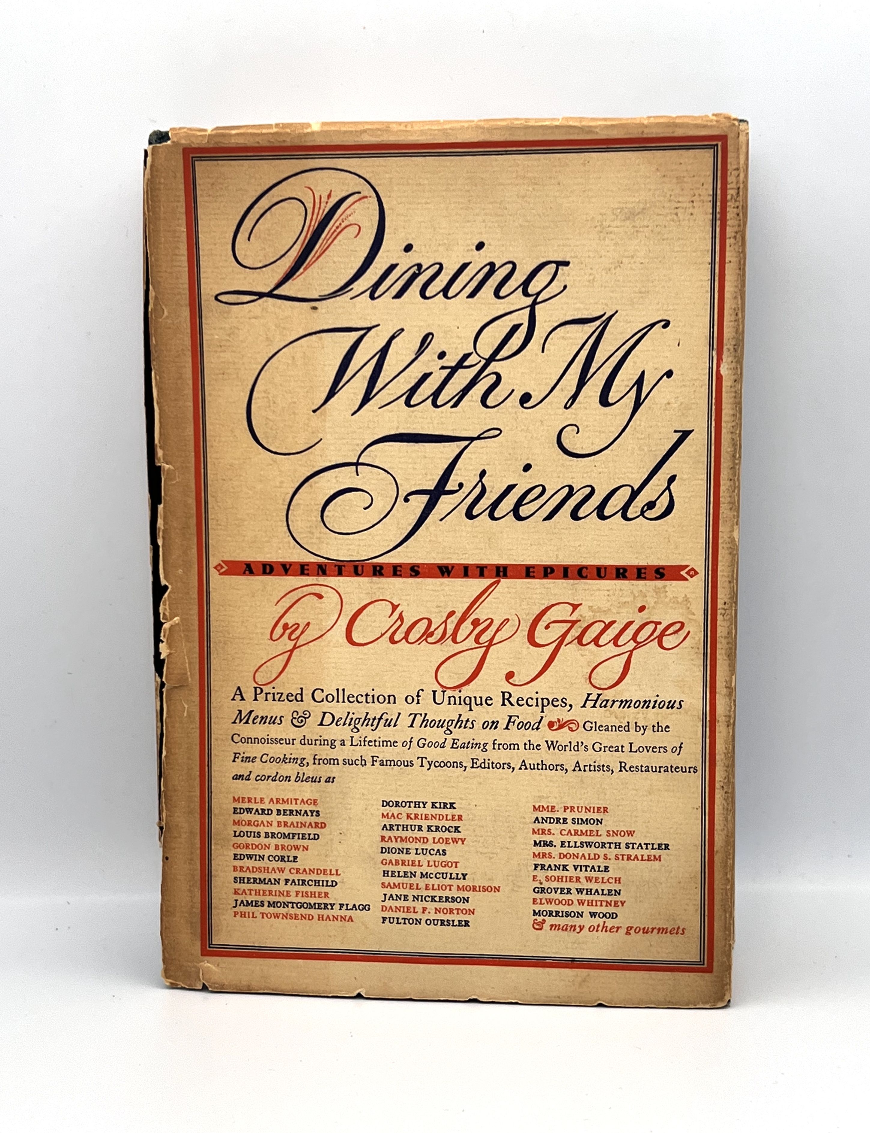 New York: Crown Publishers, 1949. First Edition. Hardcover. Boards. Very good, in fair dust wrapper. 292 pages. 21.5 x 14.5. cm. This copy was a gift from Ann Seranne, a food consultatnt and former editor at Gourmet magazine to Doreen Feng Bedell, the best-selling cookbook author of The Joy of Chinese Cooking. Signed on the front free end paper: 10/24/55 To Doreen - Who should have known - and would have loved Crosby Gaige Anne Seranne. A post card is laid in addressed to Doreen Badell. Seranne, a good friend of Gaige's was featured in this book on page 207-210. Gaige, a theatrical producer, writer, printer and binder, cattle breeder, and most notably gourmet and cook, presents his favorite meals, including menus, recipes and the famous people he dined with. Luminaries such as Merle Armitage, James Montgomery Flagg, Andre Simon, add their treasured recipes - an all around who's who of the artists, editors, and captains of industry during the 1920's through the 1940's. Clean copy. Dust wrapper chipped with major tears and splits.