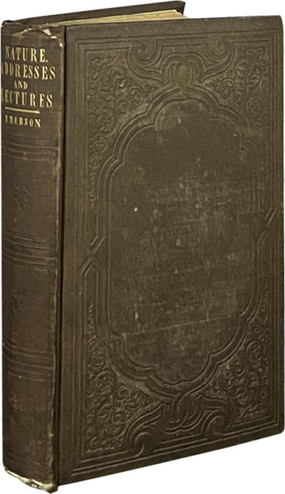 Boston: James Munroe and Company, 1849. First Edition. Hardcover. Very Good. Very Good. Brown binding, lightly soiled, rubbed and with some fraying at the spine edges. Square and firmly bound, Square, bound with eight pages of ads in the front, binding mostly firm but with some loose signature near the middle of the text. A collection of ten of Emerson's essays and lectures, including "Nature," "The American Scholar," "The Transcendentalist," among others.