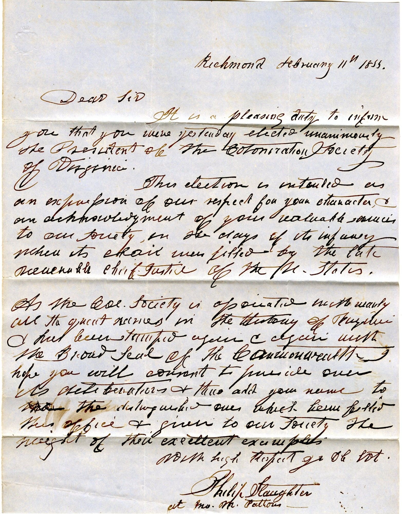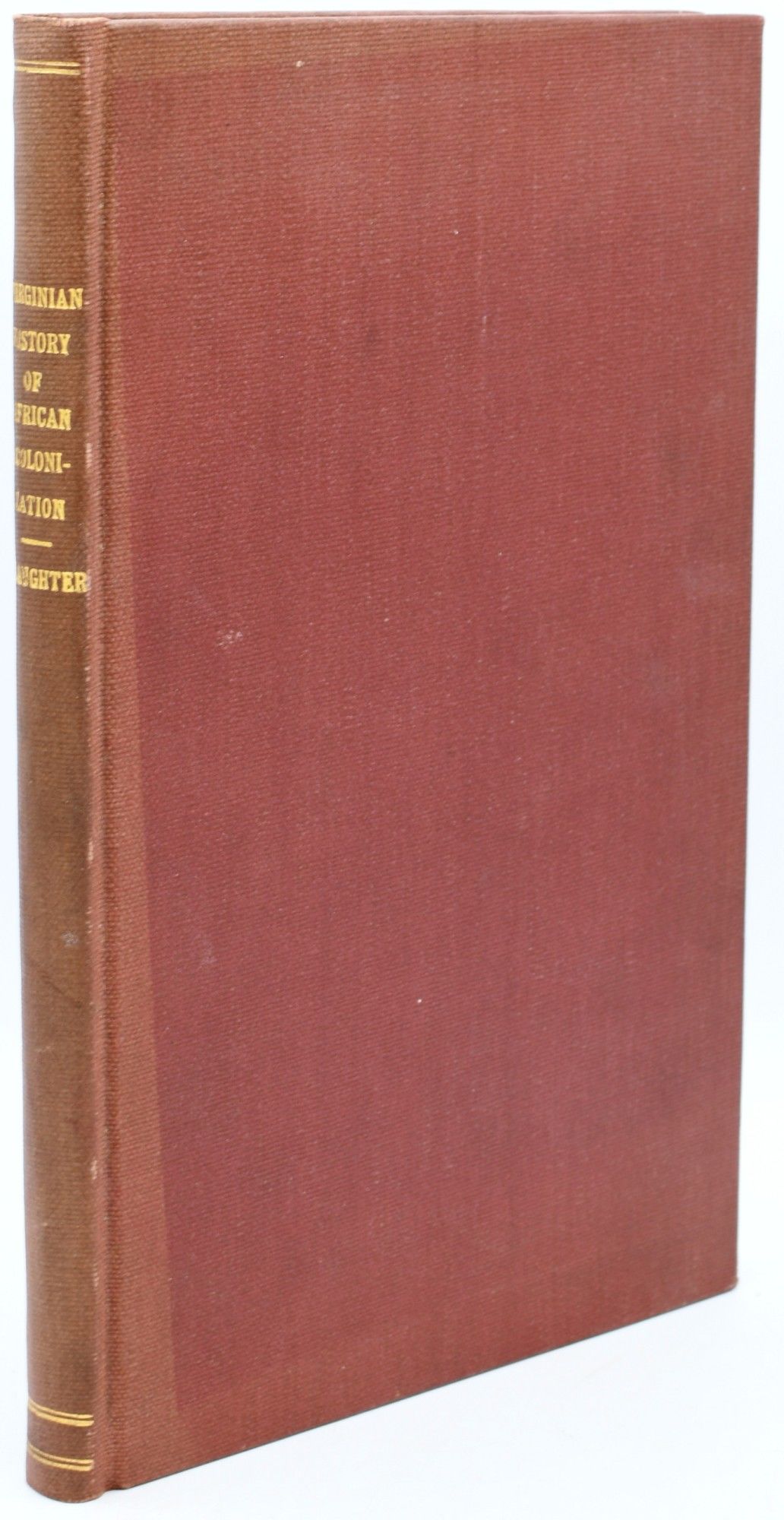 Richmond: MacFarlane & Fergusson, 1855. First Edition. Hard Cover. Very Good binding. Quarto; a later rebound copy (with the binder's label Meister & Smethie of Richmond) , with the original wrappers bound in; xxx, [1], 2- 116 pages; with wrappers bound in (the front wrapper with titling printed on the recto, and images of Monrovia and the President's House in Monrovia; the rear wrapper with a view of "The Reception of President Roberts, On His Return from England" on the recto and, on the rear wrapper, views of Cape Palmas and "Edina, Bassa and Fishtown" on the verso.~~With an interesting autograph letter from Philip Slaughter to Col. John Rutherfoord informing him of his election as President of the Colonization Society of Virginia: "Richmond, February 11, 1855. | Dear Sir |~It is a pleasing duty to inform you that you were yesterday elected unanimously the President of the Colonization Society of Virginia. ... an acknowledgment of your valuable services to our society in the days of its infancy its chair was filled by the late venerable Chief Justice of the U. States. ... with high respect ... Philip Slaughter at Mr. M. Pattons"~~The election of Col Rutherfood is noted in the pamphlet as having happened at the 1855 meeting (see p. 105).~~One has to surmise that this copy of the pamphlet belonged to Col. Rutherfoord. An important association, with quite a nice letter. (Sabin 81710; Howes S 550; Haynes 16925). Very Good binding.