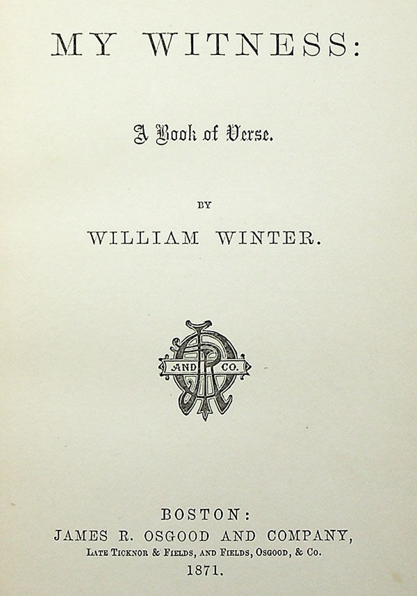A book of verse by the prominent Greenwich Village wit, theatre critic and literary editor. Winter was a central figure in the bohemian culture of Greenwich Village in the 1860s and 70s, at the center of the group of writers and critics who congregated at Pfaff's Beer Hall at Broadway and Bleecker Street. BAL 23009 (notes edition size of 1020 copies, including 65 copies in deluxe bindings).