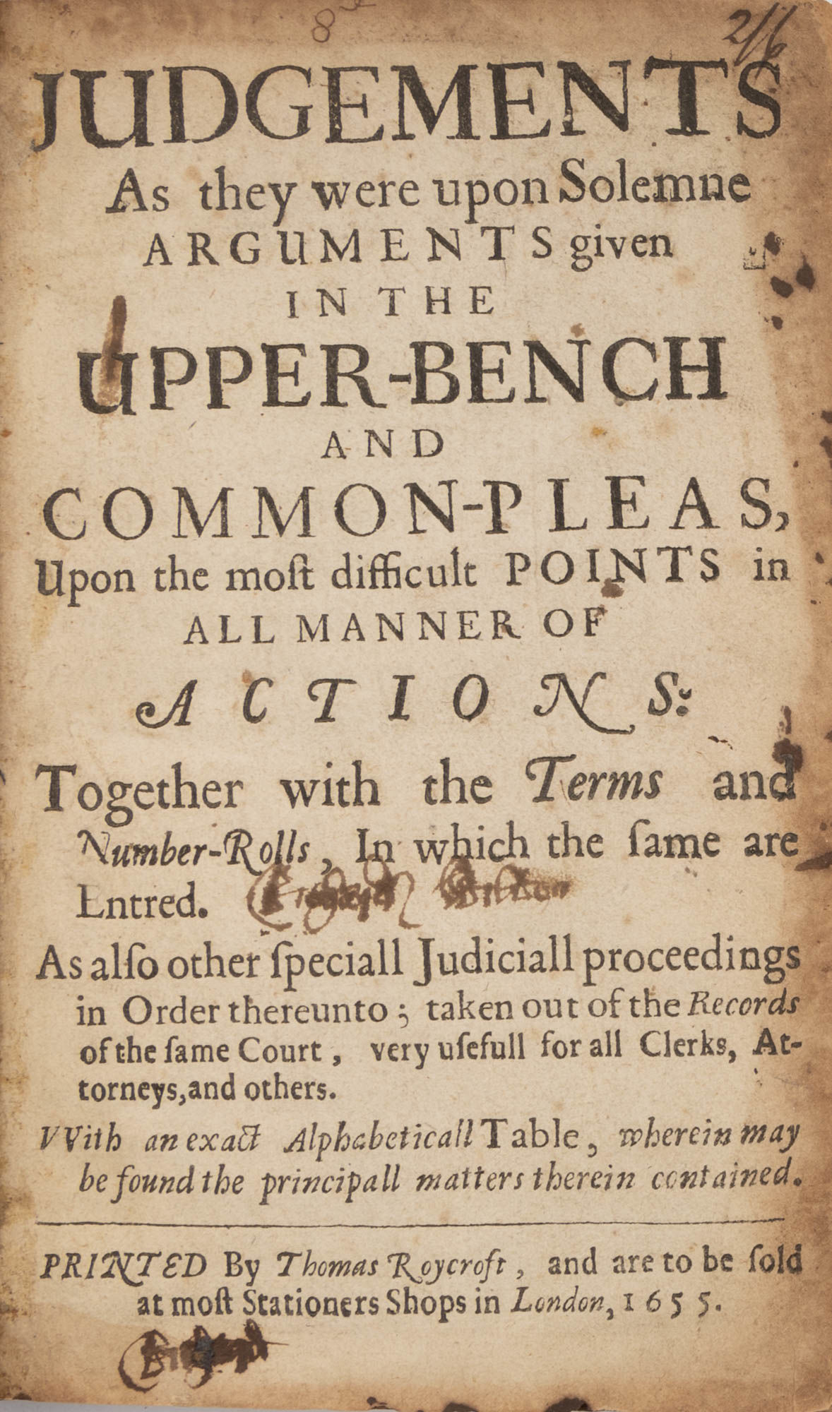 1655. Jefferson Owned a Copy of this Digest [Great Britain]. [Court of Common Pleas]. [Court of King's Bench]. Judgements as They Were Upon Solemne Arguments Given in the Upper-Bench and Common-pleas, Upon the Most Difficult Points in All Manner of Actions: Together with the Terms and Number-Rolls, In Which the Same are Entred. As also Other Speciall Judiciall Proceedings in Order Thereunto; Taken Out of the Records of the Same Court, Very Usefull for All Clerks, Attorneys, And Others. With an Exact Alphabeticall Table, Wherein May be Found the Principall Matters Therein Contained. London: Printed by Thomas Roycroft, 1655. [iv], 235, 240-336, 339-344, [22] pp. Pagination irregular, text complete. Octavo (6-1/4" x 4"). Recent calf, retained early lettering piece, blind fillets and gilt publication date to spine, early hand-lettered title to fore-edge of text block, endpapers renewed. Light browning to interior, light foxing to a few leaves, offsetting to margins of preliminaries and final few leaves, a few minor marks to title page, which is lightly soiled. $750. * Only edition. Cited as "The First Book of Judgements," this is a collection of cases digested alphabetically by topic. Unusual for this type of book, it provides the term of the court and the number of the roll on which the judgement is listed, a feature that facilitated the citing of precedents. Jefferson owned a copy of this book. OCLC locates 11 copies in North American law libraries. Sowerby, Catalogue of the Library of Thomas Jefferson 1922. English Short-Title Catalogue R43325.