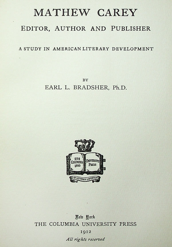 Mathew Carey: Editor, Author and Publisher. A Study in American Literary Development