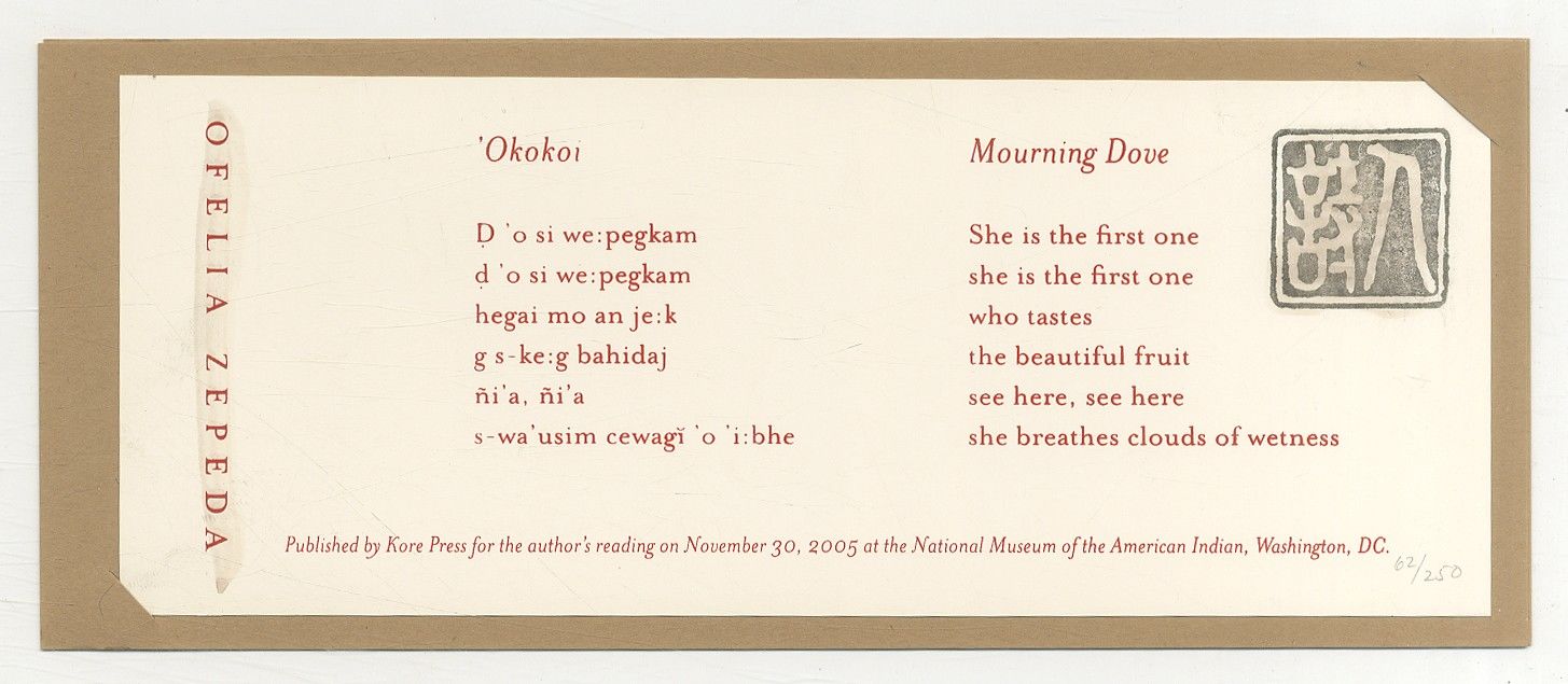 [Tucson, Arizona]: Kore Press, 2005. Unbound. Fine. Bookmark. Printed sheet measuring 8½" x 3¼" set into a tan unprinted 9¼" x 3¾" sheet at two corners. Accented with watercolor. Fine. One of 250 copies printed for the author's reading on November 30, 2005 at the National Museum of the American Indian, Washington, D.C.