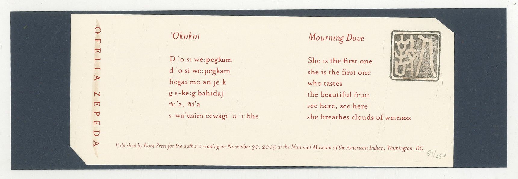 [Tucson, Arizona]: Kore Press, 2005. Unbound. Fine. Bookmark. Printed sheet measuring 8½" x 3¼" set into a navy unprinted 11" x 3½" sheet at two corners. Accented with watercolor. Fine. One of 250 copies printed for the author's reading on November 30, 2005 at the National Museum of the American Indian, Washington, D.C.