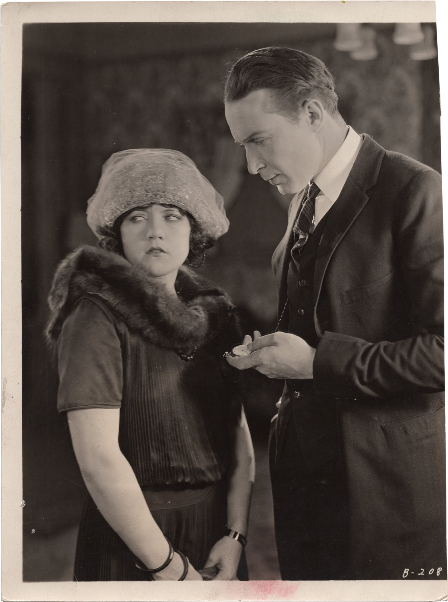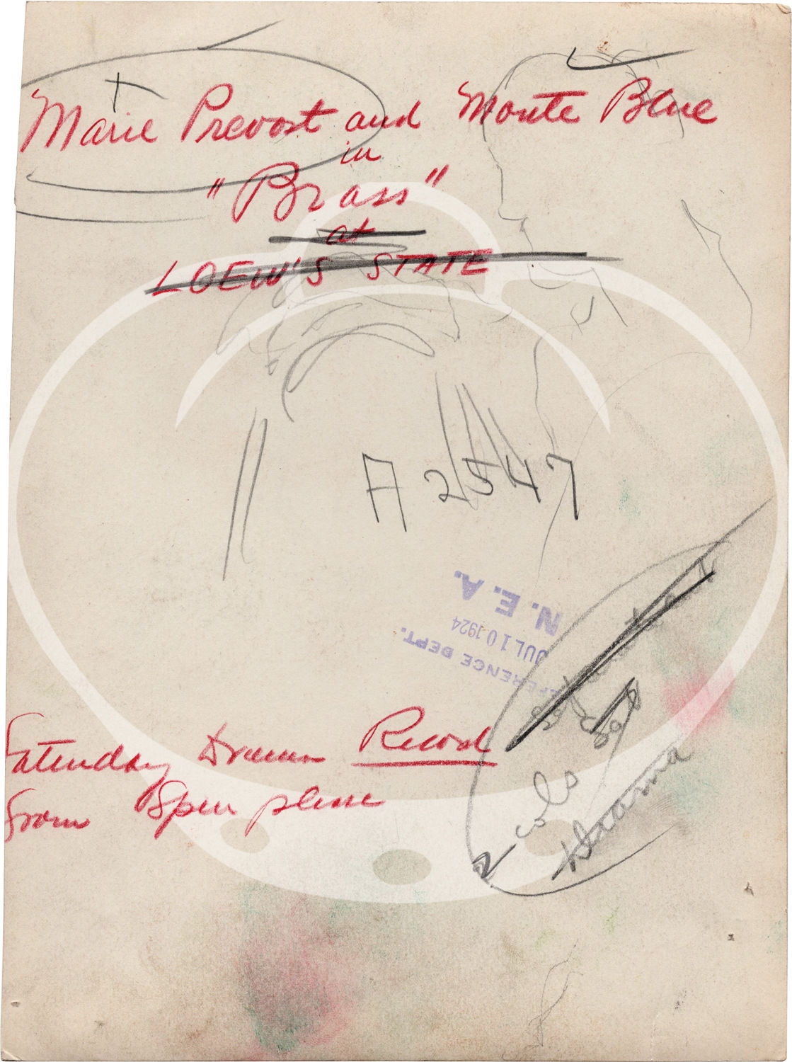 Burbank, CA: Warner Brothers, 1923. Vintage double weight reference photograph from the 1923 film, showing actors Monte Blue and Marie Prevost. With manuscript pencil annotations regarding layout and the stamp of the N.E.A. Reference Department dated JUL 10 1924 to the verso.