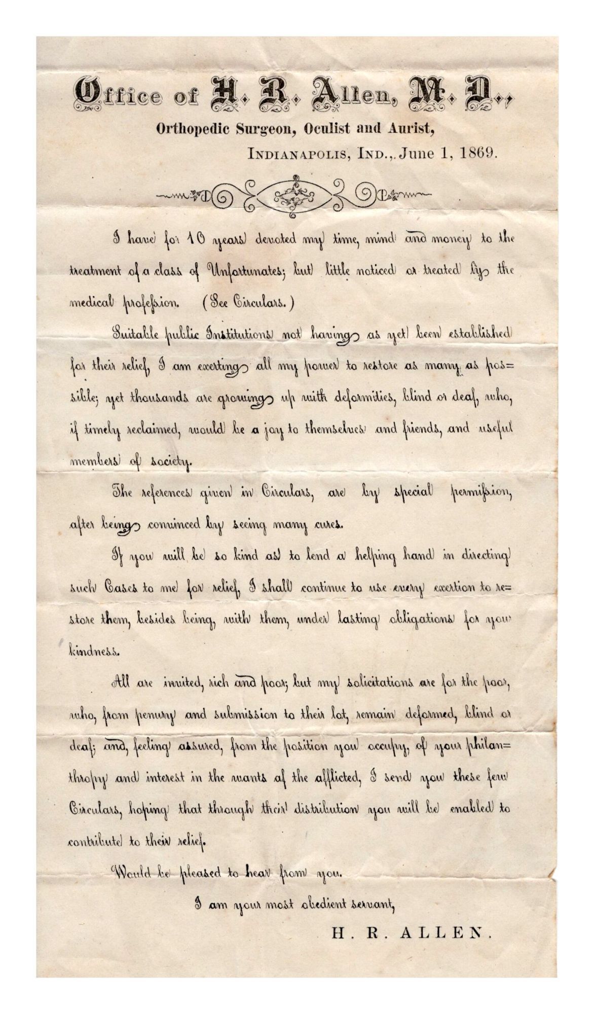 Indianapolis, IN, 1869. General wear. Letter folds.. A circular advertisement for the offices of H. R. Allen, an orthopedic surgeon, oculist and aurist who had a practice in Indianapolis, IN. The advertisement focuses on the solicitation of new patients, particularly the poor and asks the reader to "be so kind as to lend a helping hand in directing such cases to me for relief. I shall continue to use every exertion to restore them." There are also several references back to earlier produced circulars by Allen that presumably provided different or more information regarding the situation of the Indianapolis poor in need of medical care. Furthermore, Allen mentions several times the lack of a "suitable public institution" who can help meet the medical needs of the poor. It should be noted that in the same year as this circular, Allen would open the National Surgical Institute with Dr. Charles L. Wilson and Dr. W. P. Johnson. The exact date the institute is founded is unclear, but most sources suggest it was opened in June of 1869, so this circular might have been one of Allen's last as a doctor in a sole practice. Single page, single sided. Measures 8 1/2" x 4 1/4" Horace Russell Allen was born on October 21, 1834 to Joseph F. Allen (1805-1852) and Sally Davis (1815-1907) in Nelsonville, OH. He had six siblings: Emily Jane Allen Rankin (1833-1881), Mary Catherine Allen Minturn (1836-1873), Jonathan Allen (1838-1852), Elizabeth Eleanor Allen Bradrick (1841-1908), Reuben Davis Allen (1844-1863), and Sarah Minerva Allen Brink (1849-1938). He married Harriet Elizabeth Shepherd (1838-1917) on May 19, 1857 in Warren, IA, and had four children: Harriet Lulu Allen Wright (1963-1913), Mary Shepherd Allen Taylor (1867-1963), Dr. Horace Russell Frank Allen (1869-1945) and Eleanor "Nellie" Fox Allen Ayres(1873-1898). Horace first founded a medical institute in Charleston, IL in 1858. During the Civil War he served as a surgeon to the 123rd Illinois Regiment. He retired from the army in 1863 due to wounds incurred during his service. He resumed his practice in Charleston until 1869 when he moved to Indianapolis and in June of that year founded the National Surgical Institute with Dr. Charles L. Wilson and Dr. W. P. Johnson. The institute served both the rich and the poor, often never refusing patients, though it specialized in the treatment of physical deformities such as spina bifida, club feet, and rheumatoid arthritis. For a time the institute was a success, even going on to establish branches in other cities, such as Philadelphia, Atlanta, and San Francisco. The building in Indianapolis was plagued with safety issues, which came to a head on January 21, 1892 when there was a large fire at the institute killing almost nineteen people and injuring dozens more. While Allen would eventually rebuild, his reputation suffered as a result. In 1893, his remaining partner, Dr. Wilson left to start a competing institute, and the hospital was then known as known as H. R. Allen National Surgical Institute. Due to financial issues it closed in 1898. Allen then moved to Chicago, where he opened another surgical institute. He died on October 13, 1900, after a long illness, in Chicago, IL, and is buried in Indianapolis, IN.