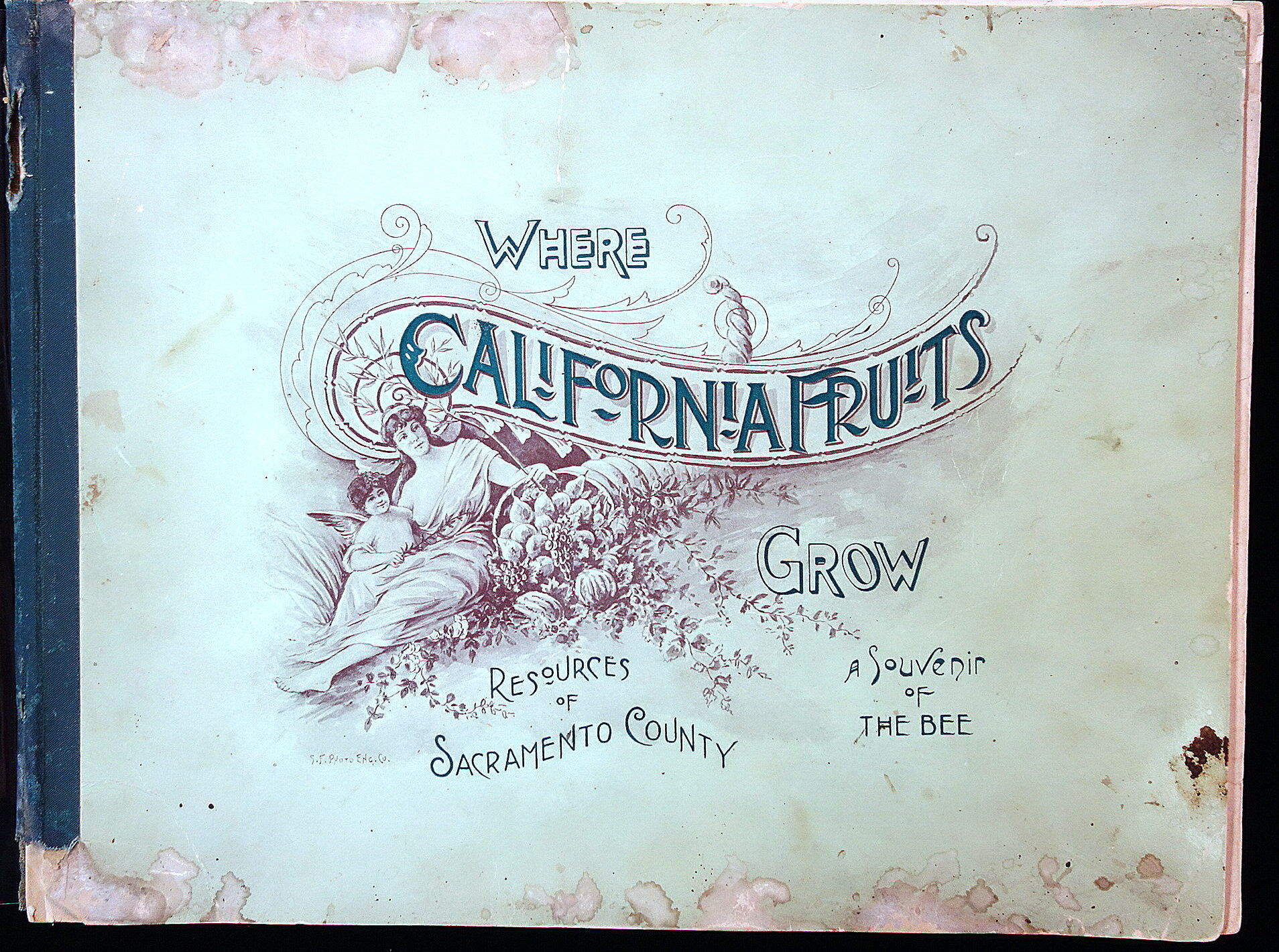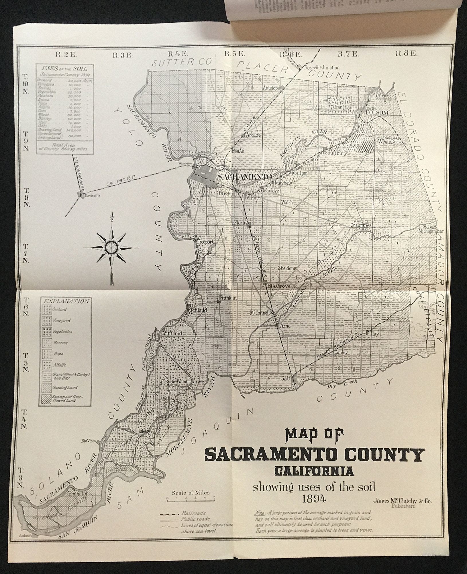 Sacramento, CA: H. S. Crocker Co, 1894. 3" intact tear edge of map. Water stains to cover and title page with some residual lower margin first few pages of the book. Cover and free endpaper pulled away from staple binding. Back strip wear.. 196pp. Soft covers. Cover and title page illustrations by S.F. Photo Eng. Co. Large format book with images from photographs throughout both in-text and full page. Fold-out 22" x 18" agricultural map showing uses of the soil in 1894. Crops included Orchards, Vineyards, Vegetables, Berries, Hops, Alfalfa, Grain, Grazing Land and swamp and Over-flowed land. Information on the city and the county including discussions by district within Sacramento. A lot of attention to agrarian activities. Index and Index of Illustrations. Concludes with full page advertisement for The Evening Bee including a photographic image of the collage of Writers and Executive Force. Measures 91/4" x 12