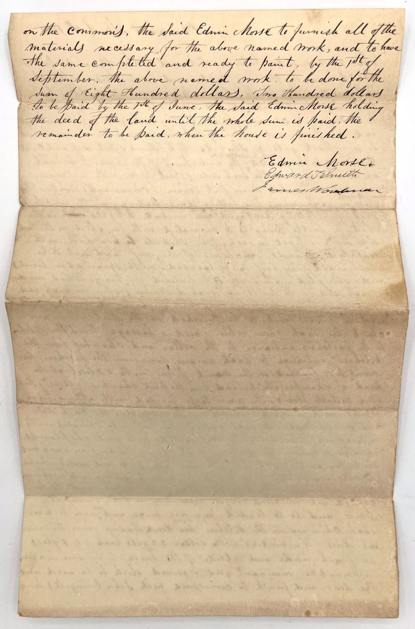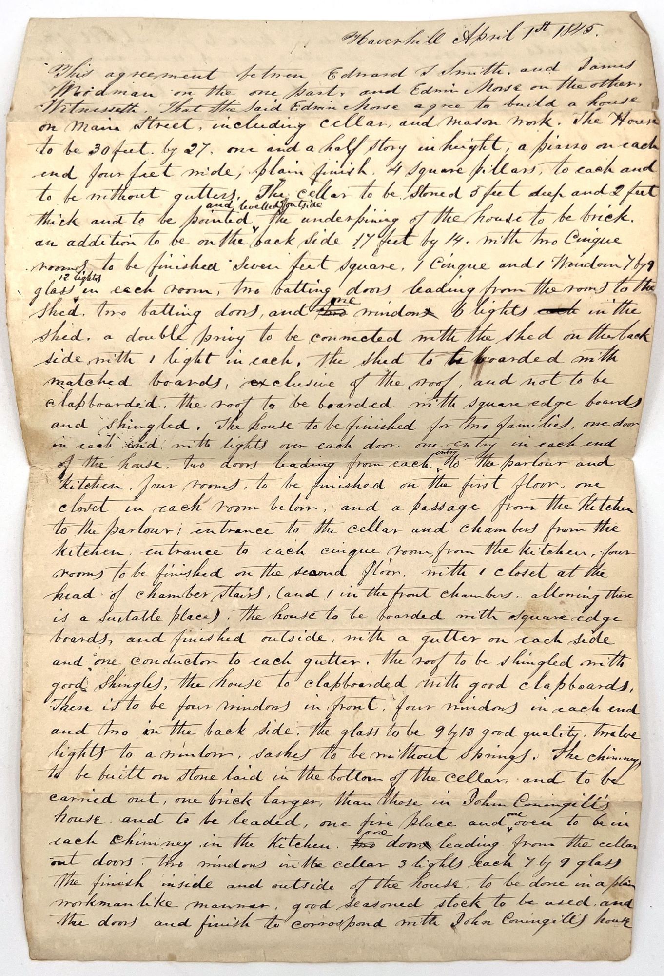 Haverhill, MA, 1845. General wear, and letter folds.. A legal agreement between three men, Edward J. Smith, James Woodman and Edwin Morse for the construction of a two family house on Main Street in Haverhill. While no state is ever mentioned in the contract, it can be supposed that it is Haverhill, MA, as according to the 1850 census there are three men with the same names living in or around Haverhill, MA. The contract fully details out the requirements of the house, from specific sizes to materials used. For example, the cellar was "to be stoned 5 feet deep and 2 feet thick and to be pointed and leveled outside, the underpinning of the house to be brick." Morse was to build the house by September 1, 1845 and front the cost of the supplies. Smith and Woodman were to pay $200 to Morse by June 1st, 1845, and the remainder, approximately $600, upon completion of the house. As collateral, Morse would hold on the land deed until such time that payment was made in full. All three men signed the contract. Single page, double sided. Measures 12 1/2" x 8