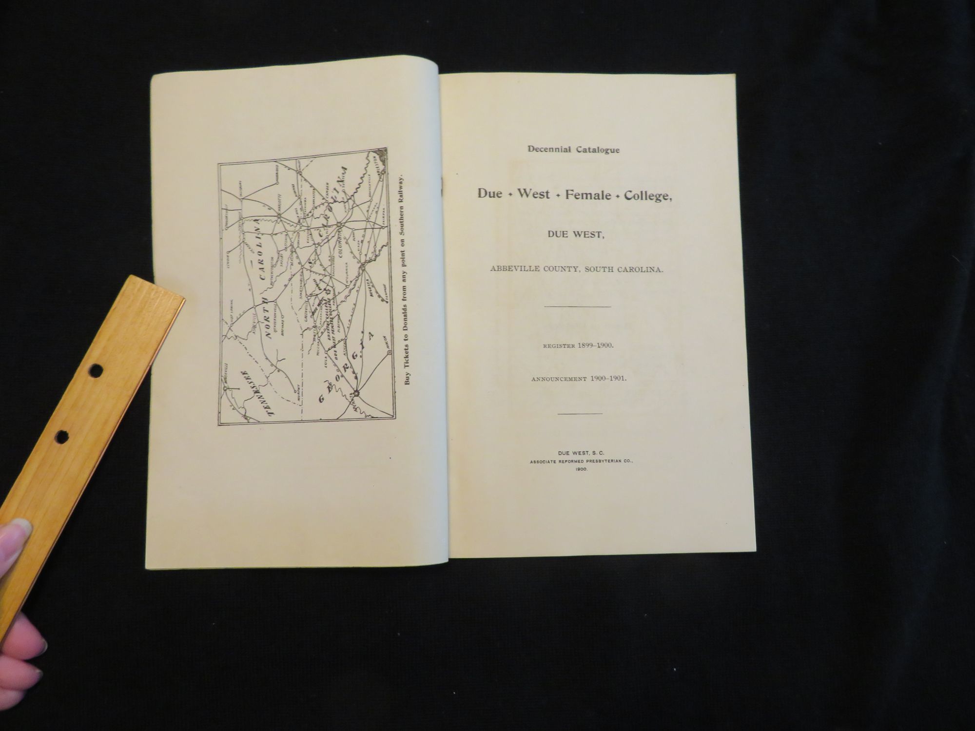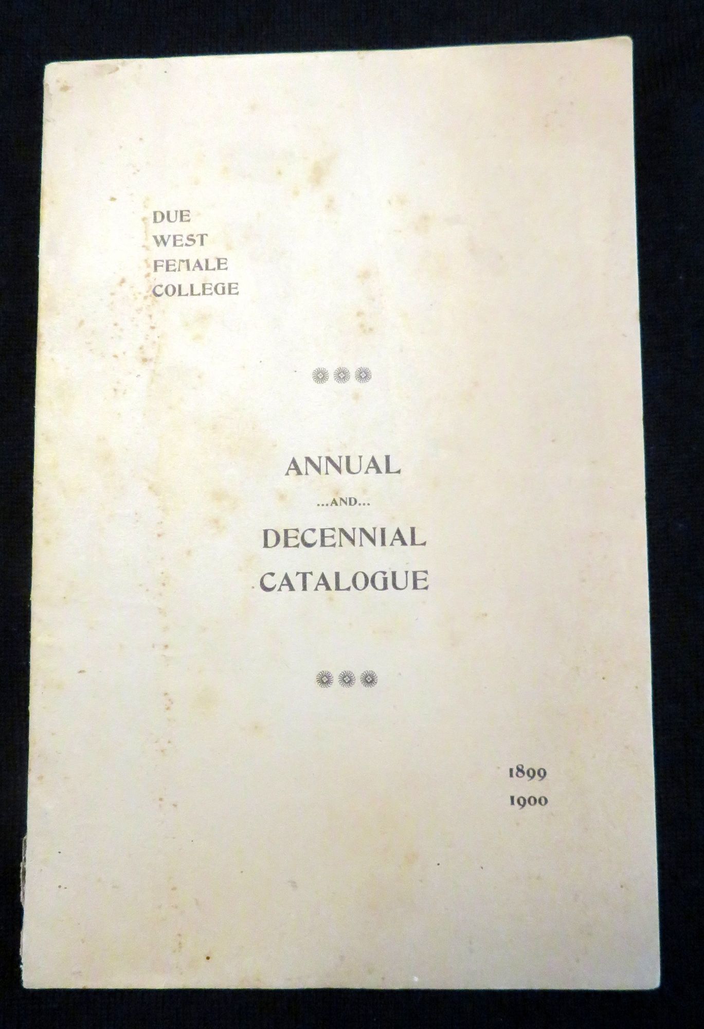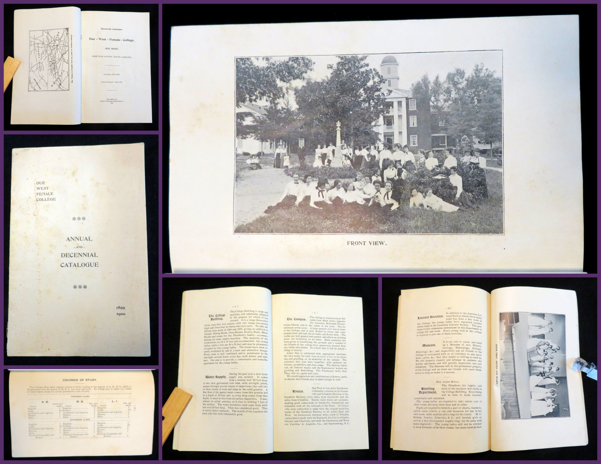 Due West, Abbeville Country, SC: Associate Reformed Presbyterian Co, 1900. General wear. Minor stains on front cover and damage to back strip.. This school catalogue is for Due West Female College, which was a private Presbyterian women's college located in Due West, SC. This catalogue not only served as its annual catalogue for the 1900-1901 school year, but also the school's decennial catalogue. Includes a school's calendar, a list of past college presidents, the names of the Board of Directors and its Officers, and the names of the Board of Visitors. It then continues on to describe the schools location, campus and buildings, water supply, directions to the campus, mail facilities, list of current faculty with a short description for each individual, list of courses and schools within the college along with a short description of both, information on social activities, medical building, religion, uniforms, local museums, boarding information, general regulations, expenses, and a register of past graduates, current students and honor roll students. The school offered four degrees: Bachelor of Arts, Bachelor of Science, Mistress of English Literature (currently considered to be a Masters in English), and a Licentiate of Instruction. The catalogue also contains five (5) black and white images from photographs of the students on campus or in one of their classes (generally theater), as well as one map of the area which includes nearby railroads. . 41 numbered pages. Printed covers. OCLC 0 (July 2020). Measures 9" x 6" The school was founded in 1859, and its original mission was to educate women to become teachers for the greater Abbeville County area. Eventually the college began to attract students from throughout the Southern United States, and was known for its 'proper' school girls. The school began to see a decline in enrollment and finances when another college in town, Erskine College, became coeducational in 1899. Eventually the two schools would agree to merge in 1925, and make it official in 1927 after the merger allowed Erskine College to receive accreditation from the Southern Association of Colleges. Due the merger, Due West Female College officially closed it doors in 1928, though Erskine College is still in existence today.