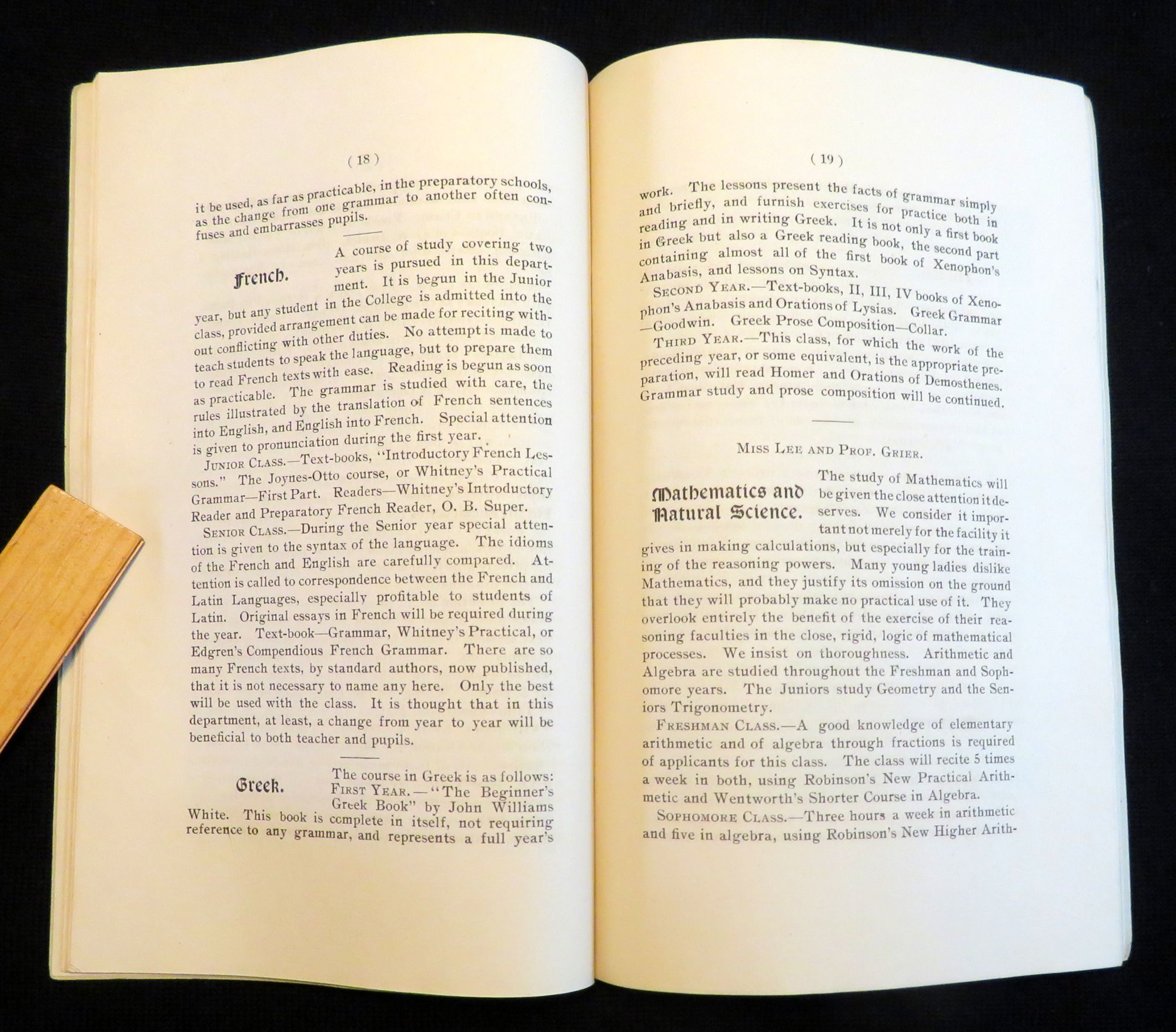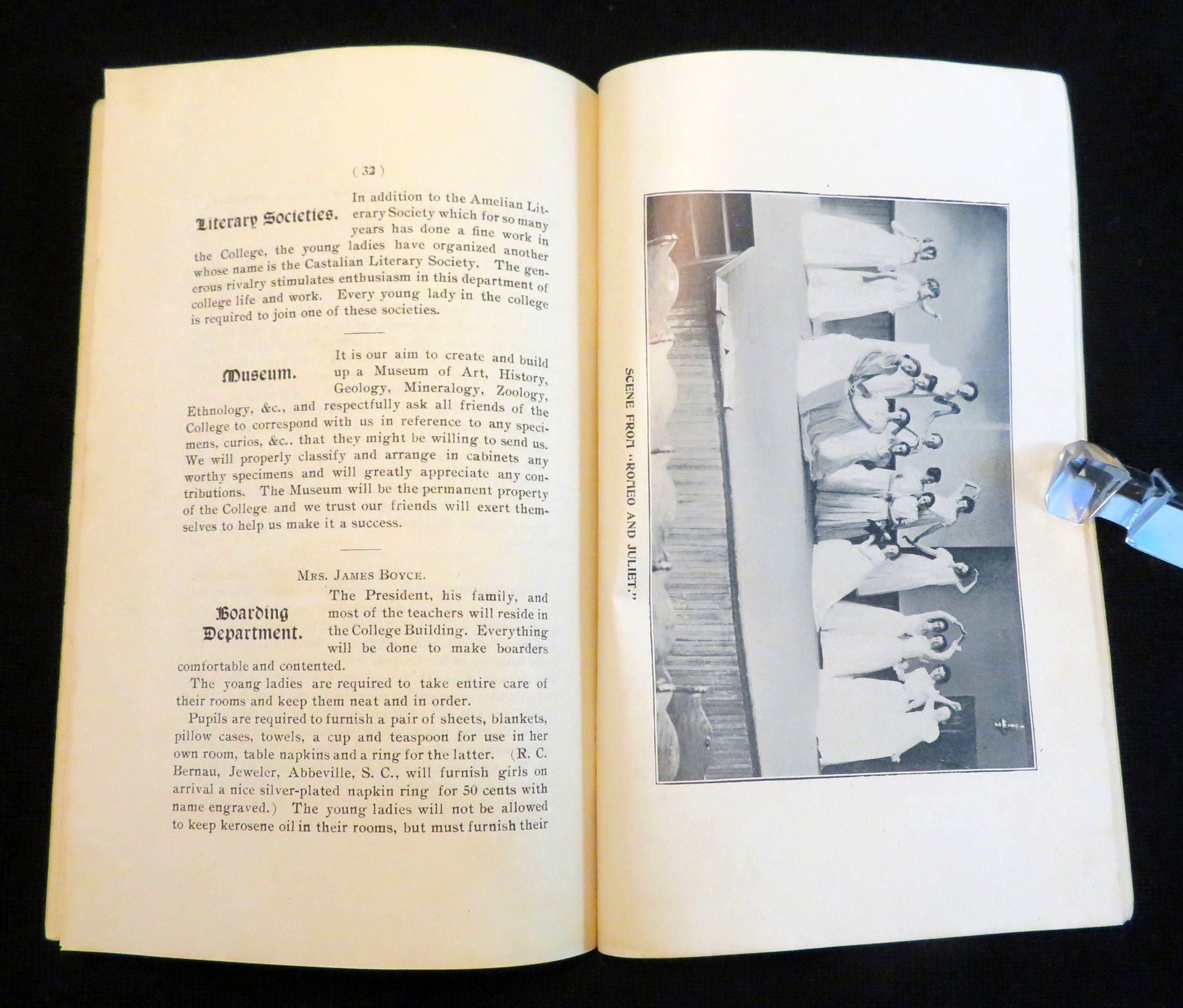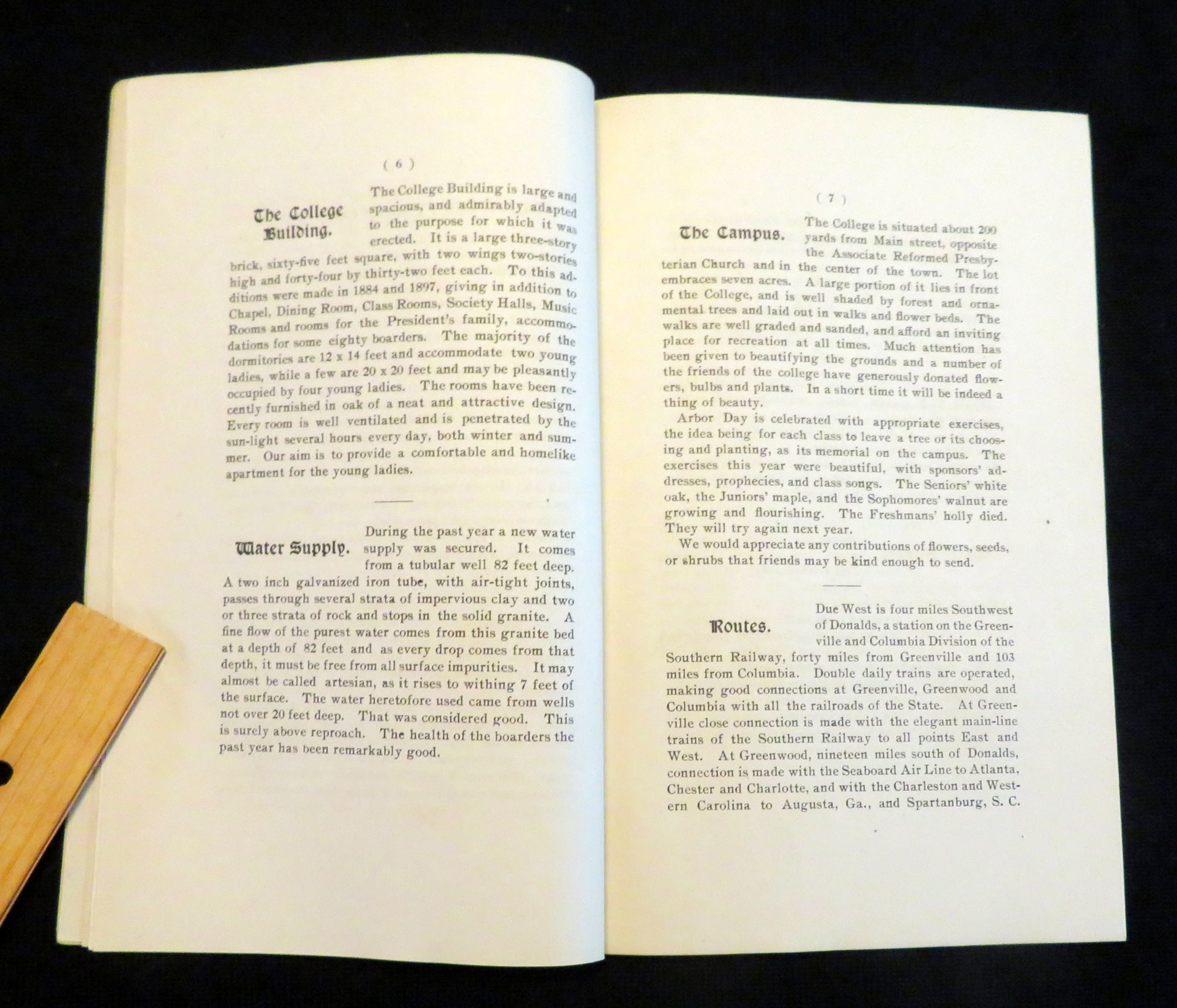 Due West, Abbeville Country, SC: Associate Reformed Presbyterian Co, 1900. General wear. Minor stains on front cover and damage to back strip.. This school catalogue is for Due West Female College, which was a private Presbyterian women's college located in Due West, SC. This catalogue not only served as its annual catalogue for the 1900-1901 school year, but also the school's decennial catalogue. Includes a school's calendar, a list of past college presidents, the names of the Board of Directors and its Officers, and the names of the Board of Visitors. It then continues on to describe the schools location, campus and buildings, water supply, directions to the campus, mail facilities, list of current faculty with a short description for each individual, list of courses and schools within the college along with a short description of both, information on social activities, medical building, religion, uniforms, local museums, boarding information, general regulations, expenses, and a register of past graduates, current students and honor roll students. The school offered four degrees: Bachelor of Arts, Bachelor of Science, Mistress of English Literature (currently considered to be a Masters in English), and a Licentiate of Instruction. The catalogue also contains five (5) black and white images from photographs of the students on campus or in one of their classes (generally theater), as well as one map of the area which includes nearby railroads. . 41 numbered pages. Printed covers. OCLC 0 (July 2020). Measures 9" x 6" The school was founded in 1859, and its original mission was to educate women to become teachers for the greater Abbeville County area. Eventually the college began to attract students from throughout the Southern United States, and was known for its 'proper' school girls. The school began to see a decline in enrollment and finances when another college in town, Erskine College, became coeducational in 1899. Eventually the two schools would agree to merge in 1925, and make it official in 1927 after the merger allowed Erskine College to receive accreditation from the Southern Association of Colleges. Due the merger, Due West Female College officially closed it doors in 1928, though Erskine College is still in existence today.