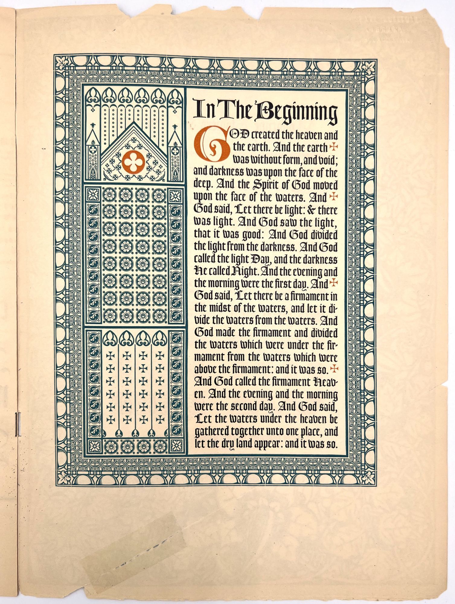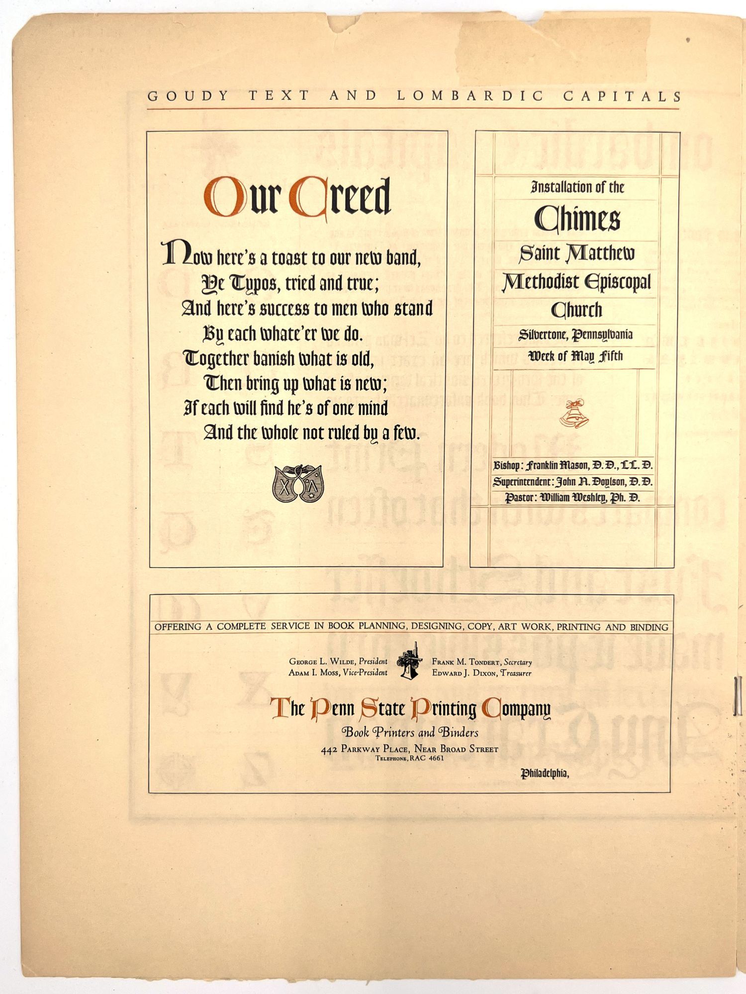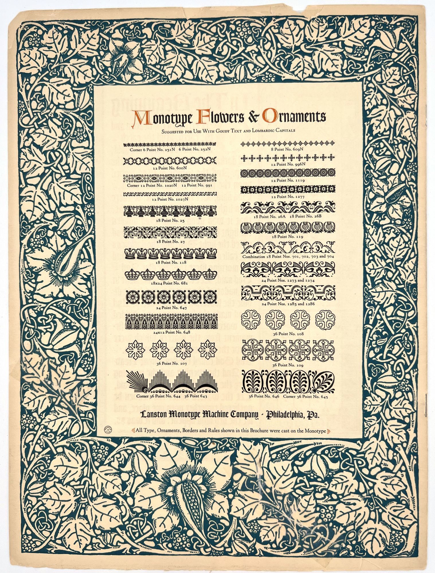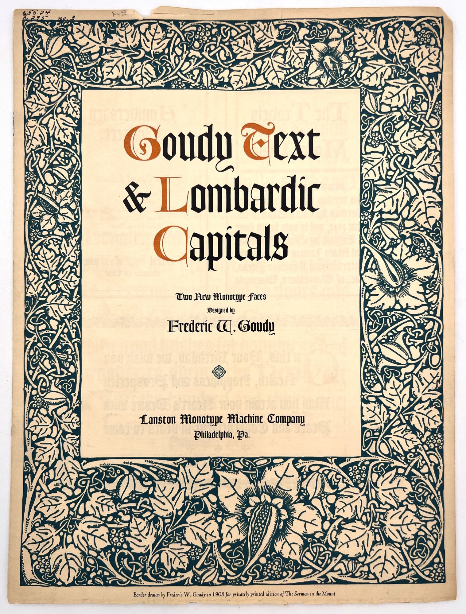 Philadelphia, Pa: Lanston Monotype Machine Company. booklet with examples of Goudy text and lombardic capitals, the back page has monotype flowers and ornaments suggested for use with Goudy text and lombardic capitals. 12" x 9" edges are worn with a few tears, some tape repair.