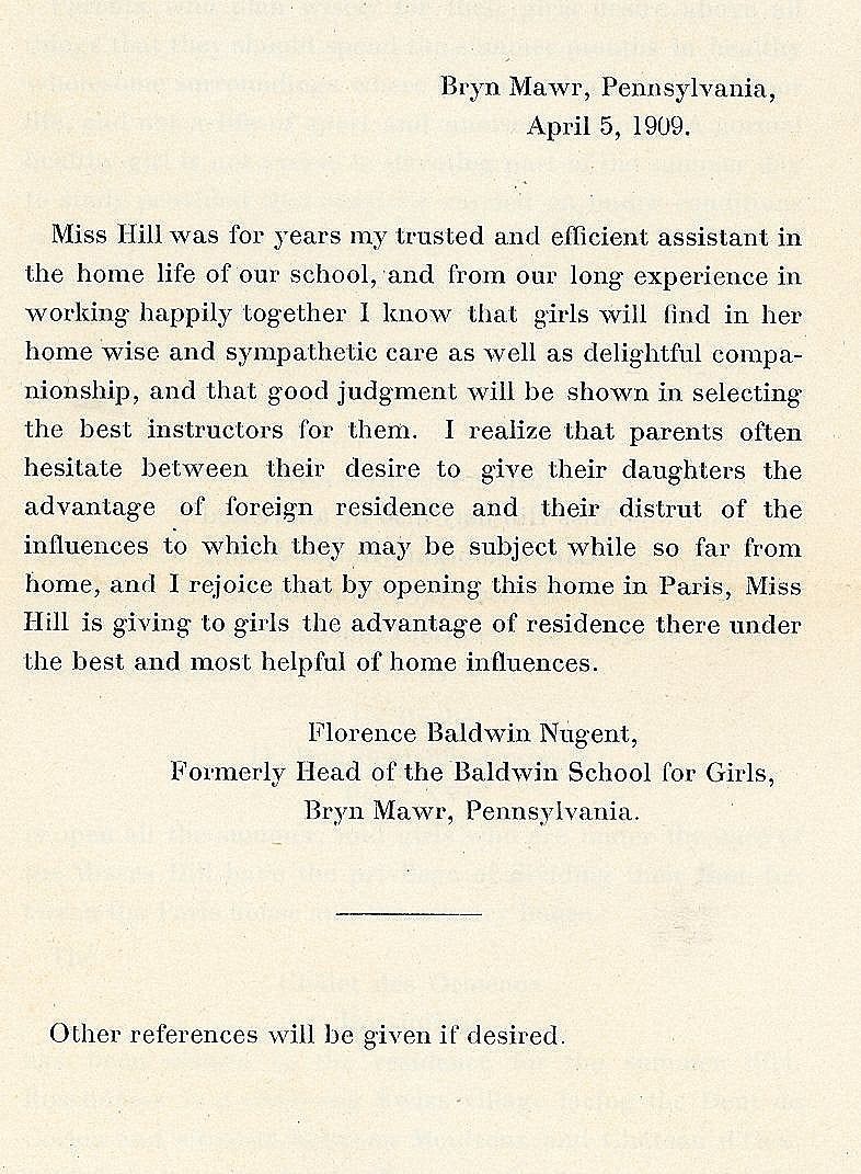 1909. A single-fold circular announcing the opening of accommodations in Paris for students wishing to spend the summer in Europe and avoid the fatigue of constant travel allowing the girls an opportunity to continue the study in subjects of interest as well as foreign life. Miss Elizabeth N. Hill, former assistant of the Head of Baldwin School for Girls and Miss Leila D. Hill opened La Ruche in Paris and a companion country home Chalet des Ormeaux in Rossinieres, a charming Swiss village. Girls will be coached in English, History, English, Literature, Latin and Algebra...For six hundred and fifty francs a month for four summer months including instruction in French, chaperonage, and residence either in Paris or the country. Measures 8 1/4" x 5 3/8