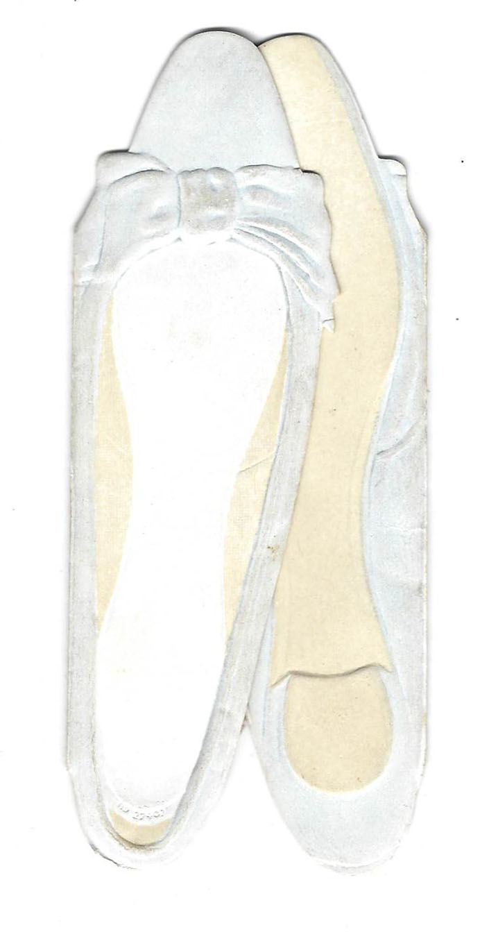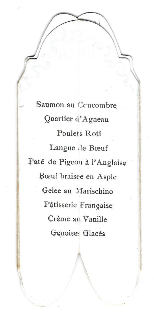 [France], 1910. Very good to near-fine. Minor toning, dust soiling, rubbing.. An elegantly rendered embossed menu, die-cut in the shape of a pair of ballet slippers. Includes ten (10) dishes on the back including Salmon with cucumber, Beef tongue, and Vanilla cream.