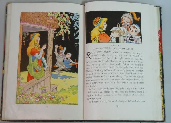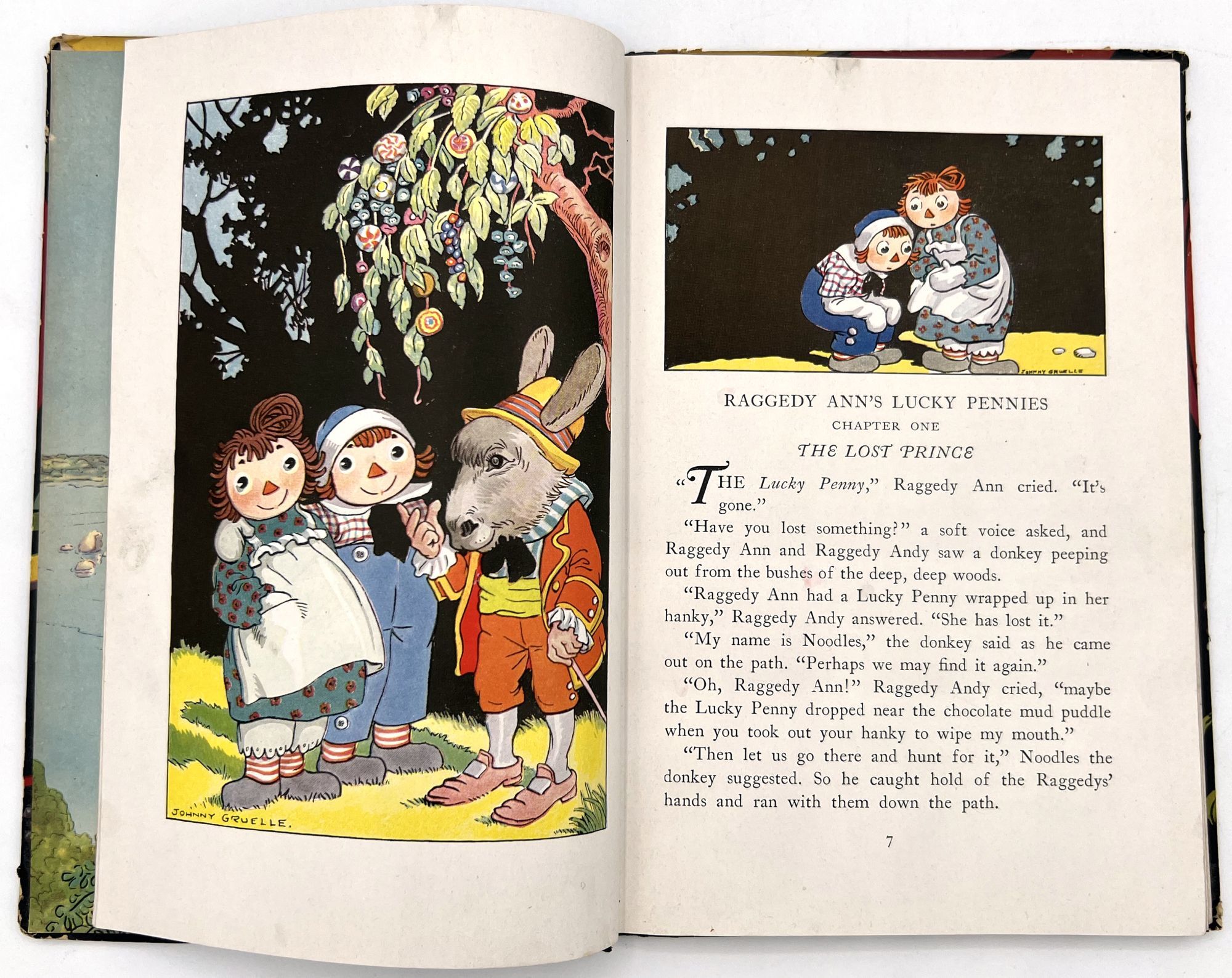Chicago: M. A. Donohue & Company, 1932. light page wrinkling with surface scuffs. Edge wear on covers.. 93 pp cloth backed pictorial boards. Copyright John B. Gruelle, Norwalk, CT. Pictorial end papers. Profusely illustrated with vibrant partial to full page illustrations.