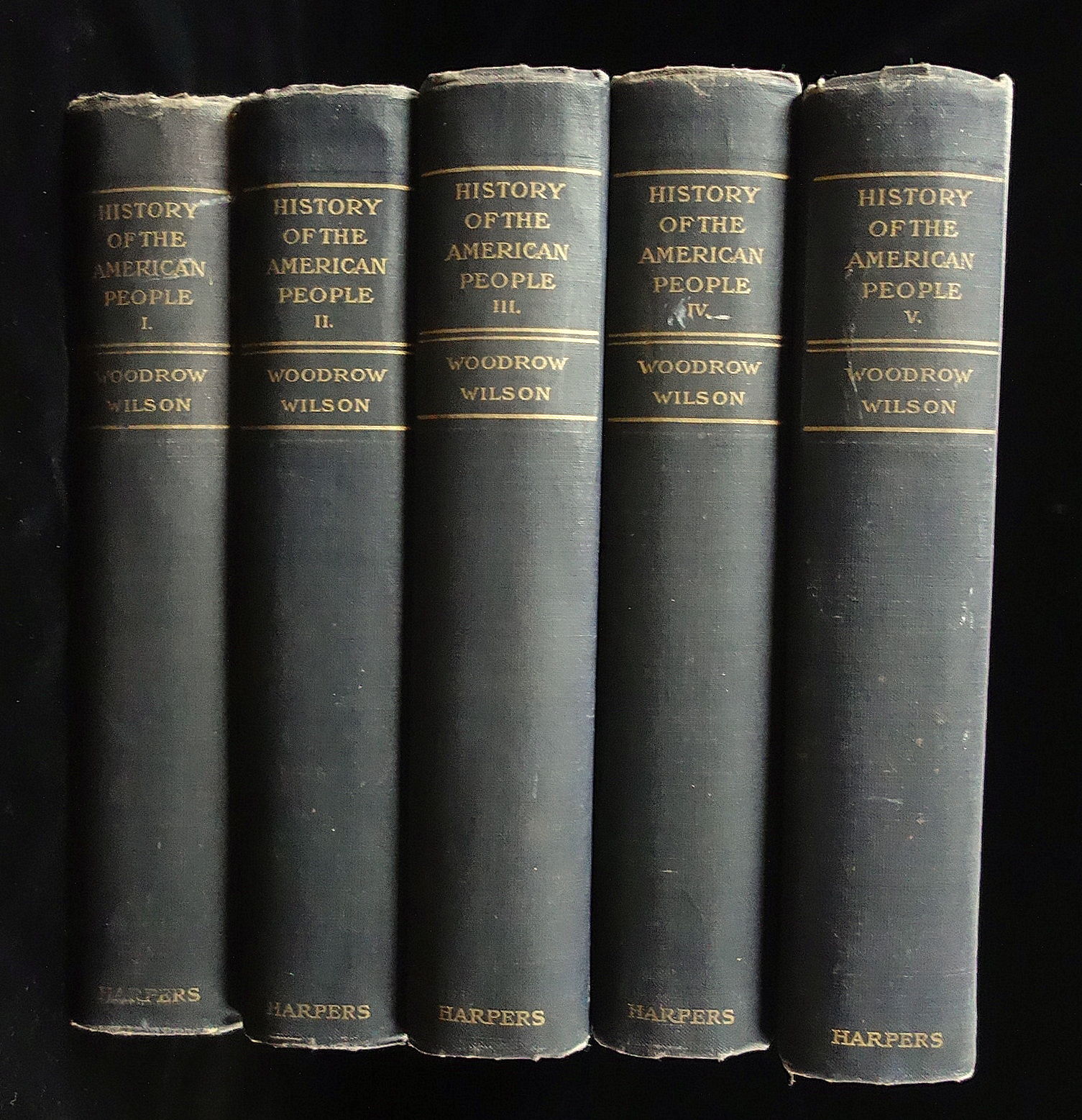 New York: Harper & Brothers, 1902. 5 volume set. Illustrations, plates, portraits, maps (some folded and in color), plans, facsimiles. The following are the topics cover in this series by volume: Volume I - The Swarming of the English, Volume II - Colonies and Nation, Vol III - The Founding of the Government, Vol IV - Critical Changes and Civil War, and Vol V - Reunion and Nationalization. This series was written by Thomas Woodrow Wilson (1856-1924) before he served as the 28th President of the United States (from 1913 to 1921) and received his Nobel Peace Prize in 1919. At the time of publication Wilson was a well-known lawyer and an academic, as a professor of history and politics, and president of Princeton University. It was during his tenure at Princeton that he penned this five-volume history of the United States, and the series reflects many of his ideas and biases that he later brought to national politics. Includes content, notes on illustrations, bibliographical references and index. Measures 8 1/2" x 5 1/2" Edge wear. Minor water stain on the towards the top third of volume one. Minor foxing throughout, with the exemption of in Volume One on the frontispiece, interleaf, and title page where the foxing is moderate to heavy.