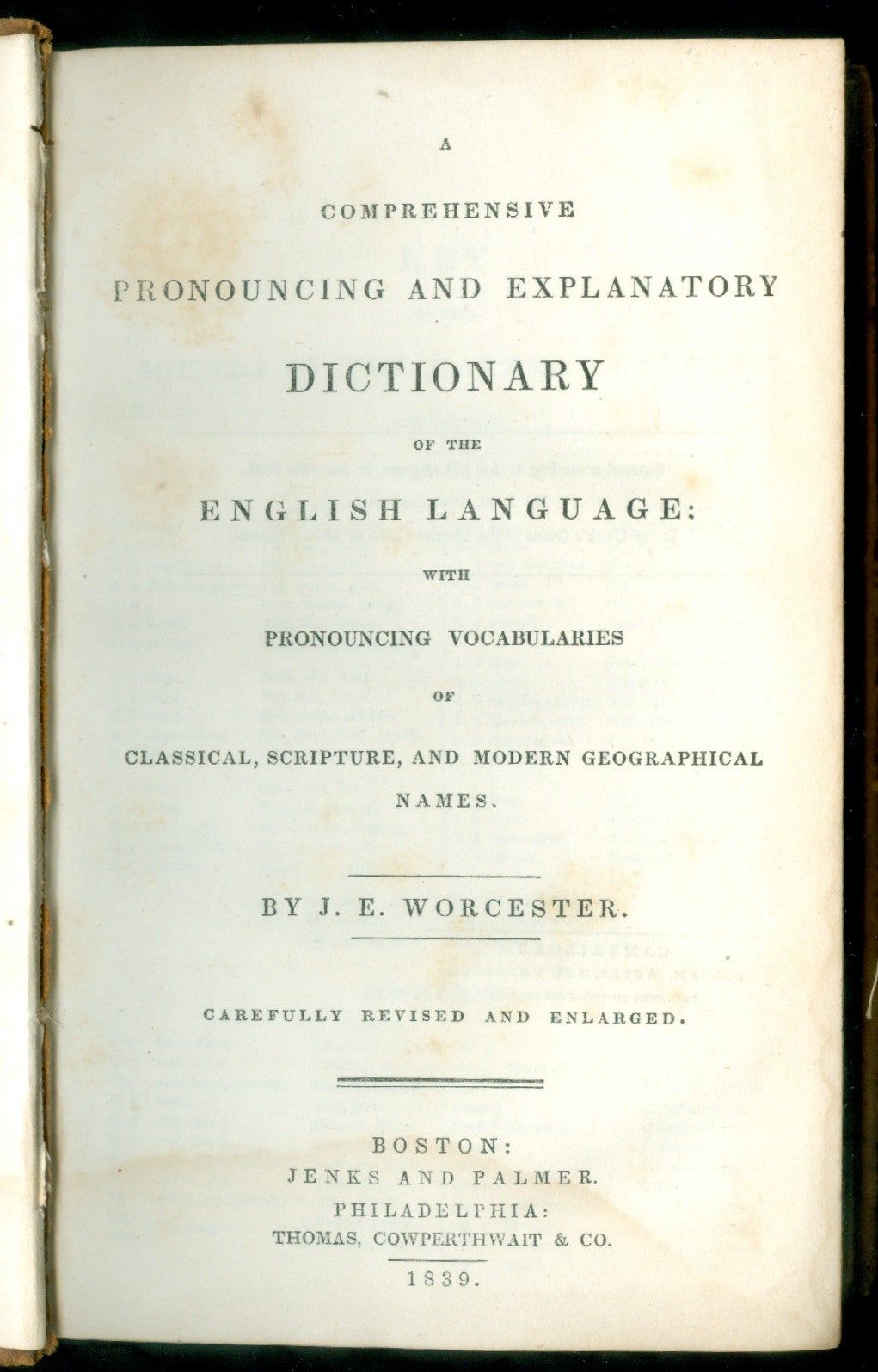 Boston: Jenks and Palmer, 1839. 424 pp. hard cover with black Worcester's Dictionary on back strip. Lexicon in two (2) columns. Front cover detached but present. Edge wear and scuffing. Minimal toning. Inscribed E. P. Delano, Providence, Dec. 1839. on blank free end paper.