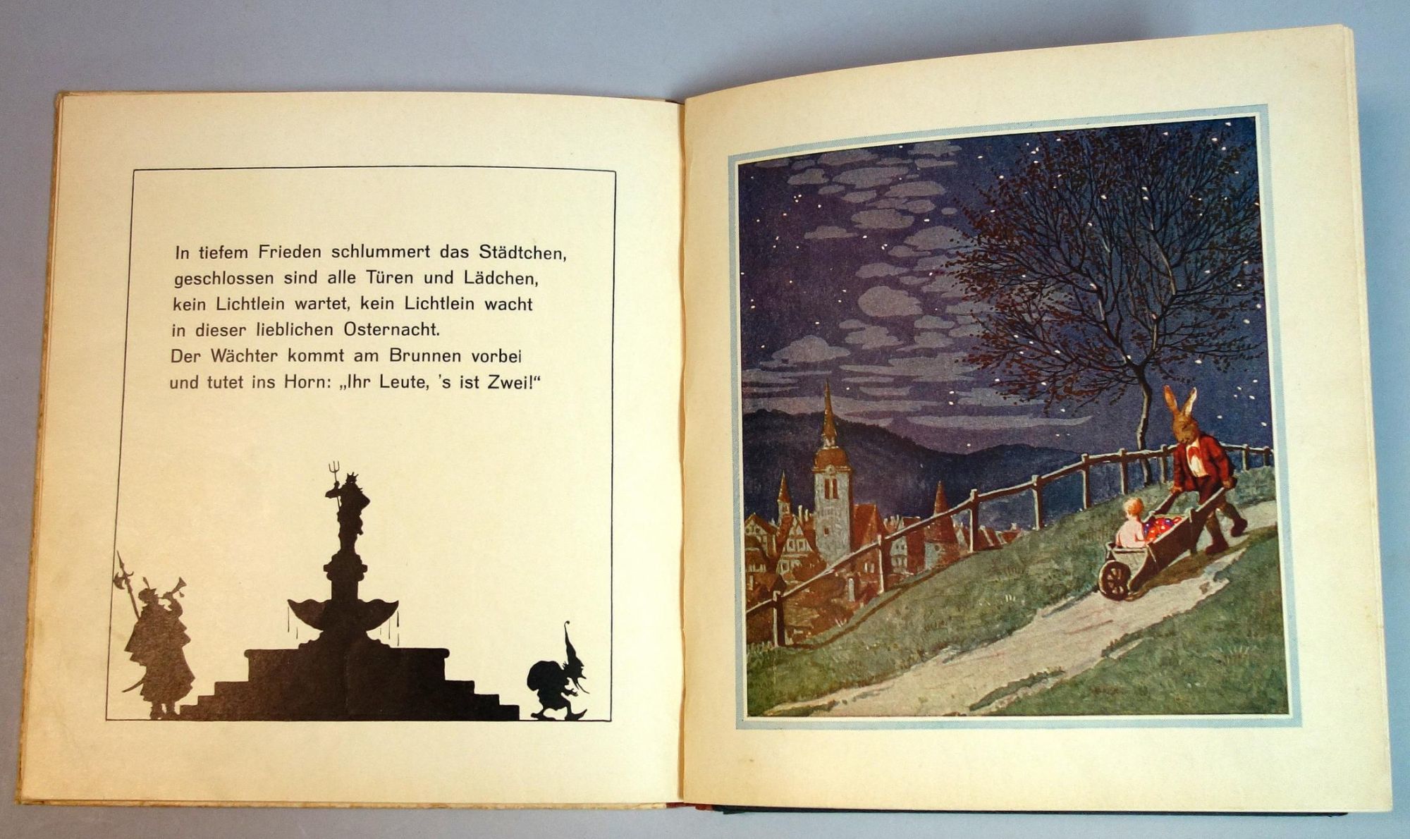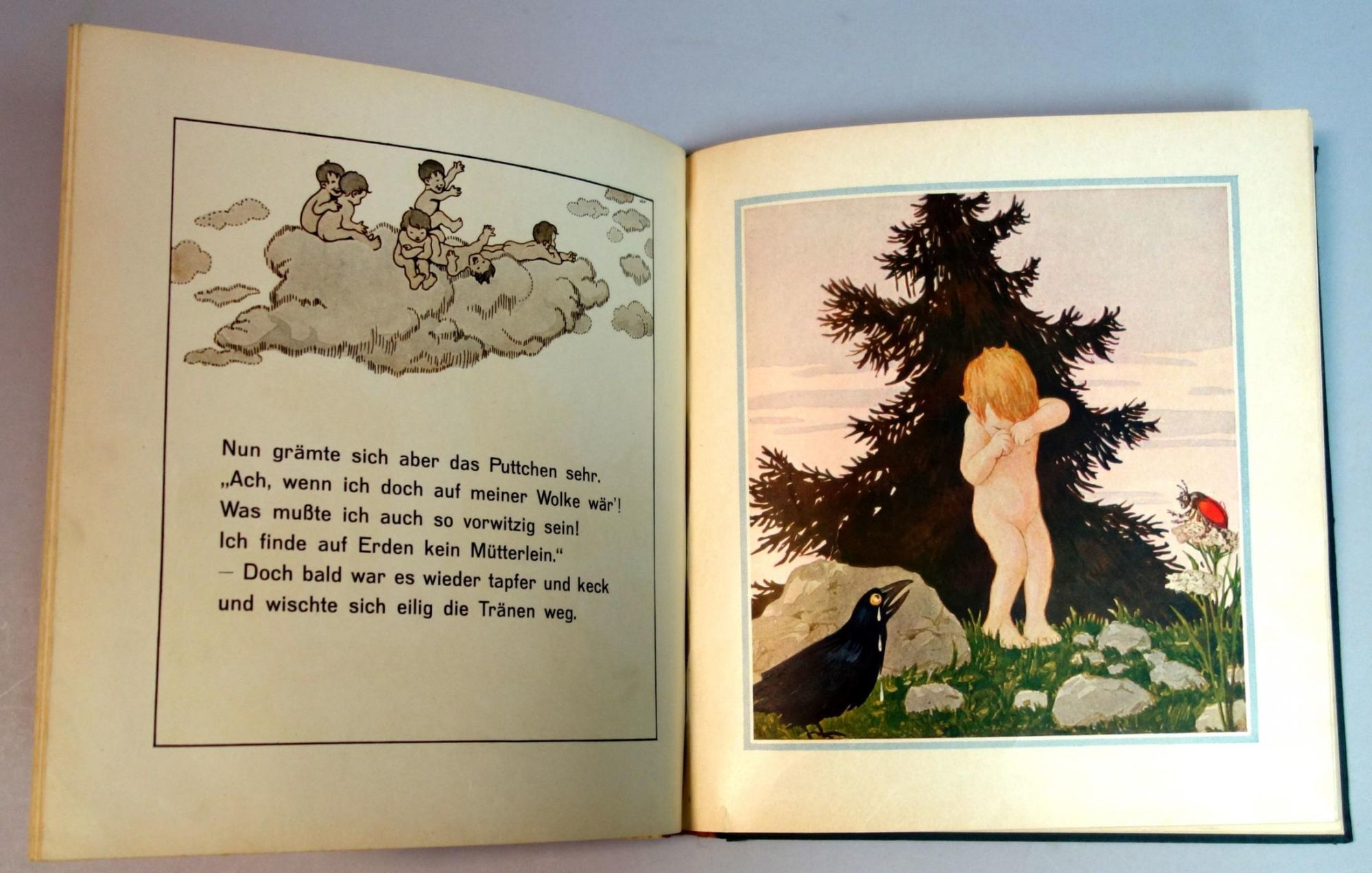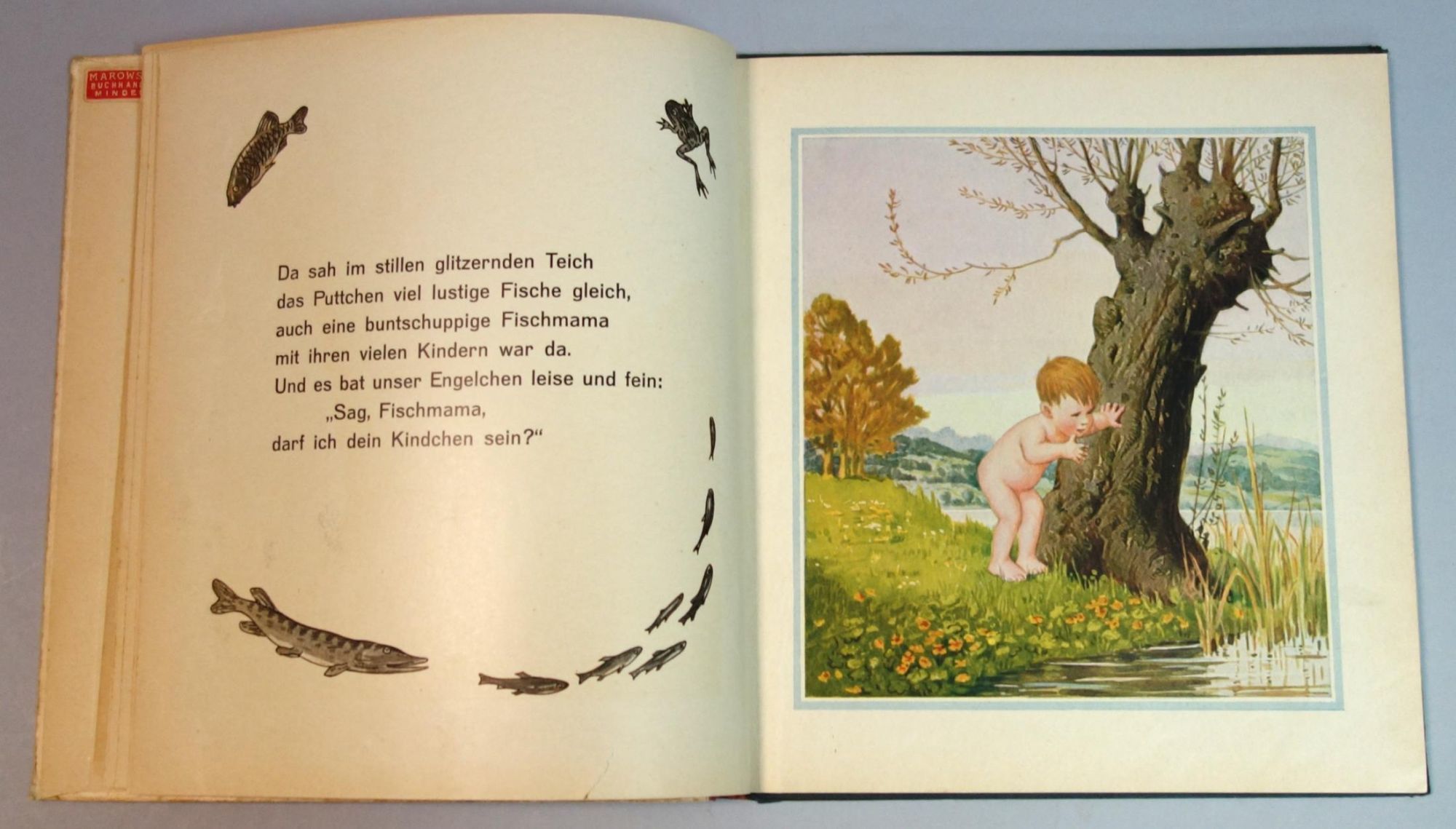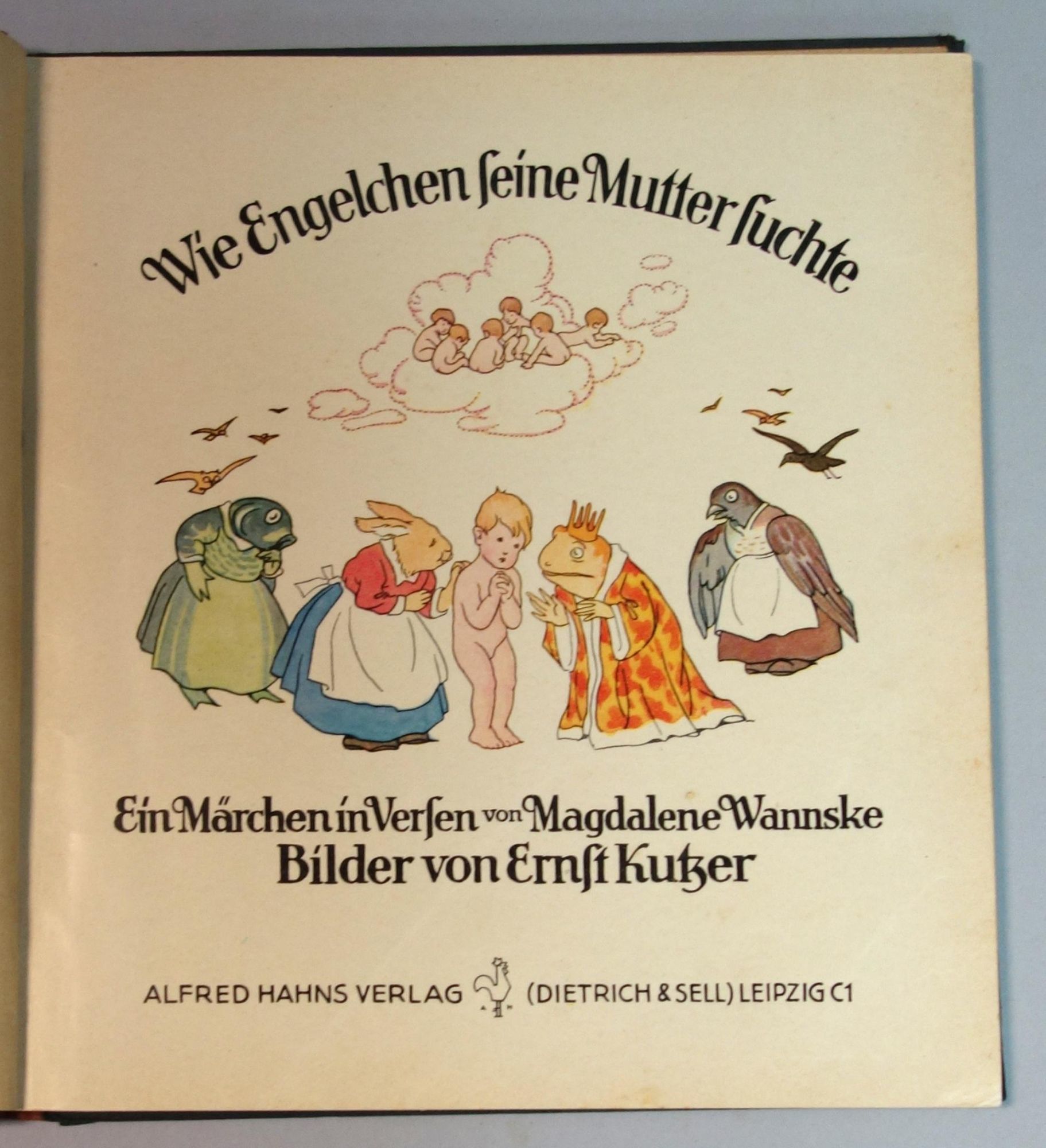 Leipzig: Alfred Hans, 1927. Intact tear; one page. Cover wear.. 40 unnumbered page German language story with applied litho covers. Full page color and in-text illustrations in color and sepia tone. It is a fairy tale in verse about a young child looking for his mother. His journey introduces him to anthropomorphic frogs, birds and rabbits. Charming imagery. Measures 7 1/2" x 8