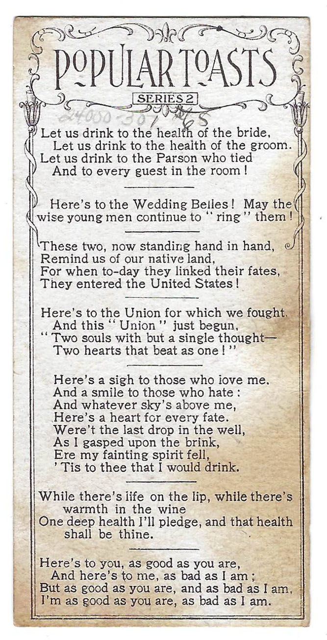 New York, New York: Emerson's Bromo Seltzer, 1892. Very good. Minor discoloration/spotting and toning.. A cleverly designed pop-up card chromolithographed by Donaldson Bros., advertising Emerson's Bromo Seltzer. Includes popular wedding and celebration toasts on the outside, and within, a gentleman with a pop-up arm raises his glass alongside the slogan: "Let us have wine and women, mirth and laughter, sermons and Bromo Seltzer the morning after." Chromolithographed bifolium card (4" by 2") with pop-up mechanism inside. Marked as "Series 2", though we have been unable to identify other examples of such cards.