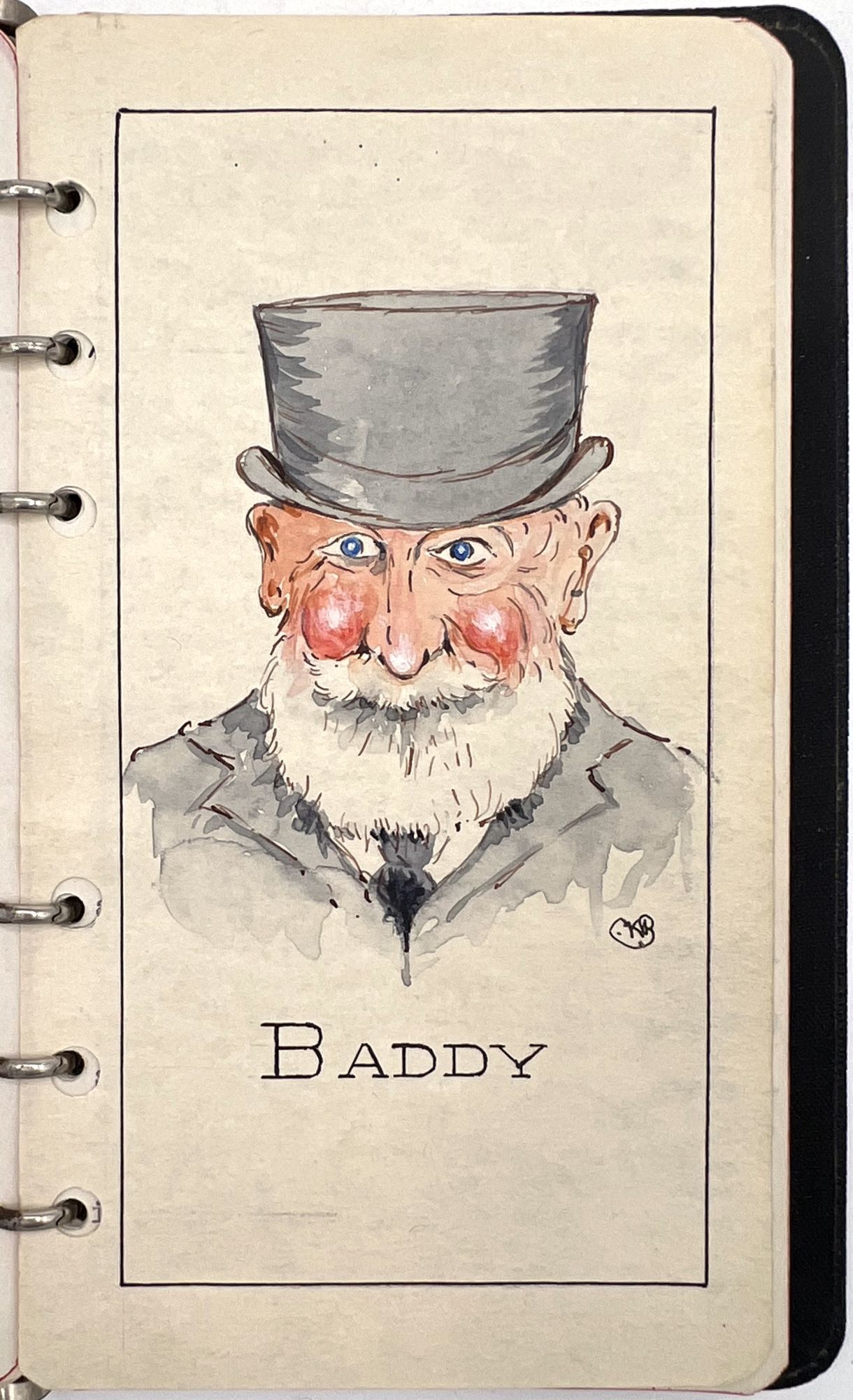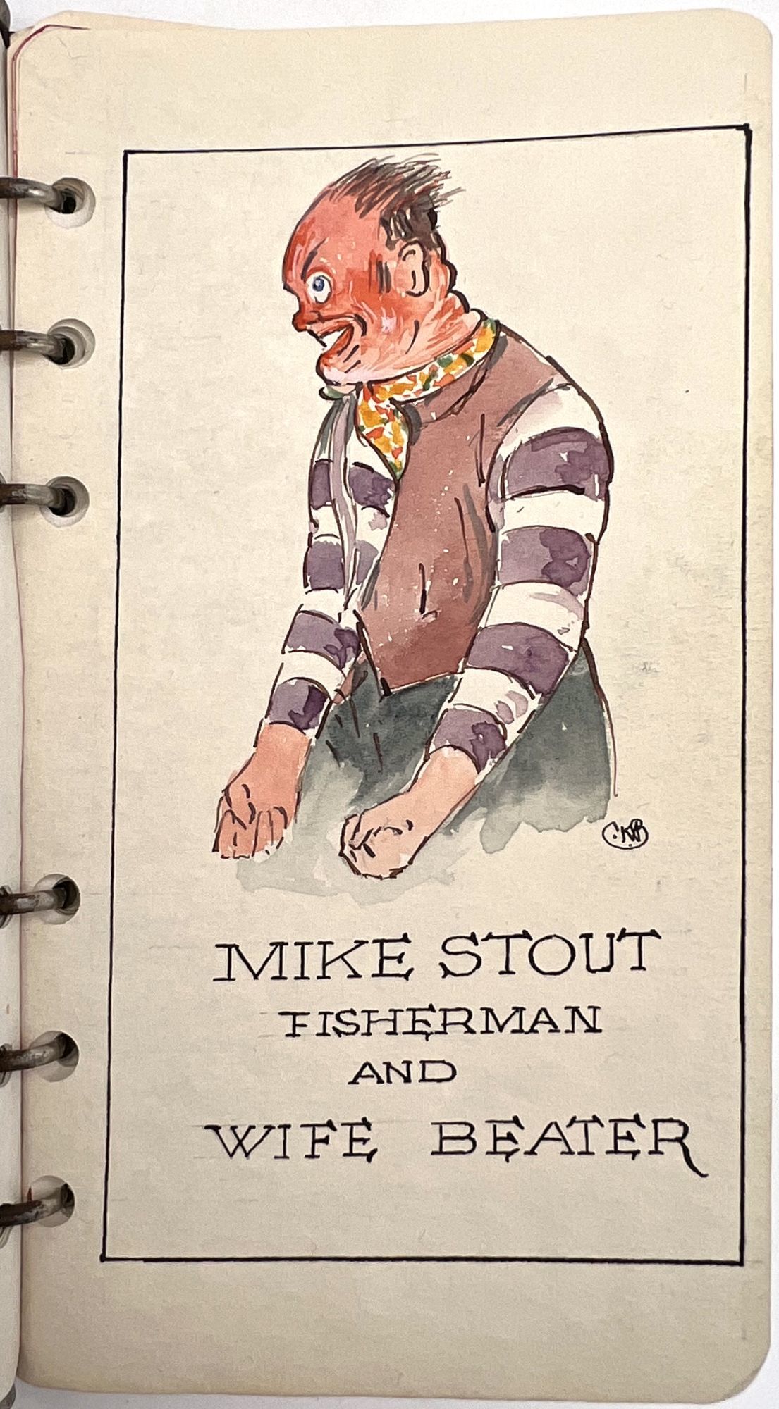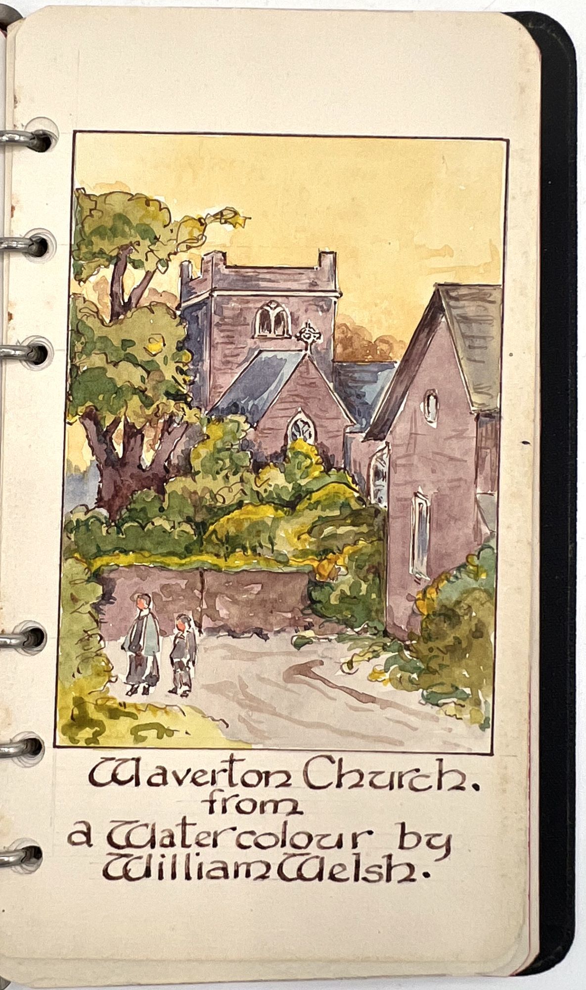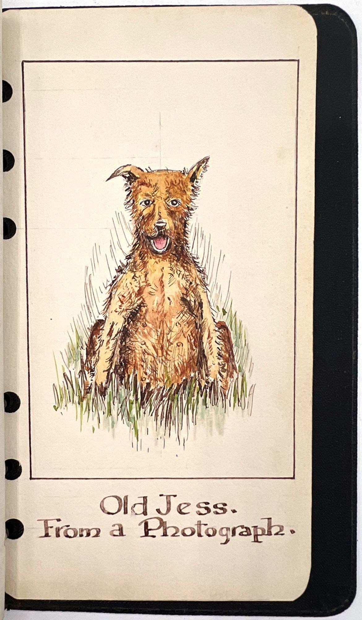 The watercolors include Mike Stout, Fisherman and Wife Beater, Waverton Church from a watercolour by William Welsh, The Shocked "Pastor", Baddy, Father's Coachman, John Huxley, A view of Woodbine with Daffodil's taken from a Photograph., The Old Town Crier, La Vinia, Wardell making his bow and Old Jess (the dog) From a photograph.