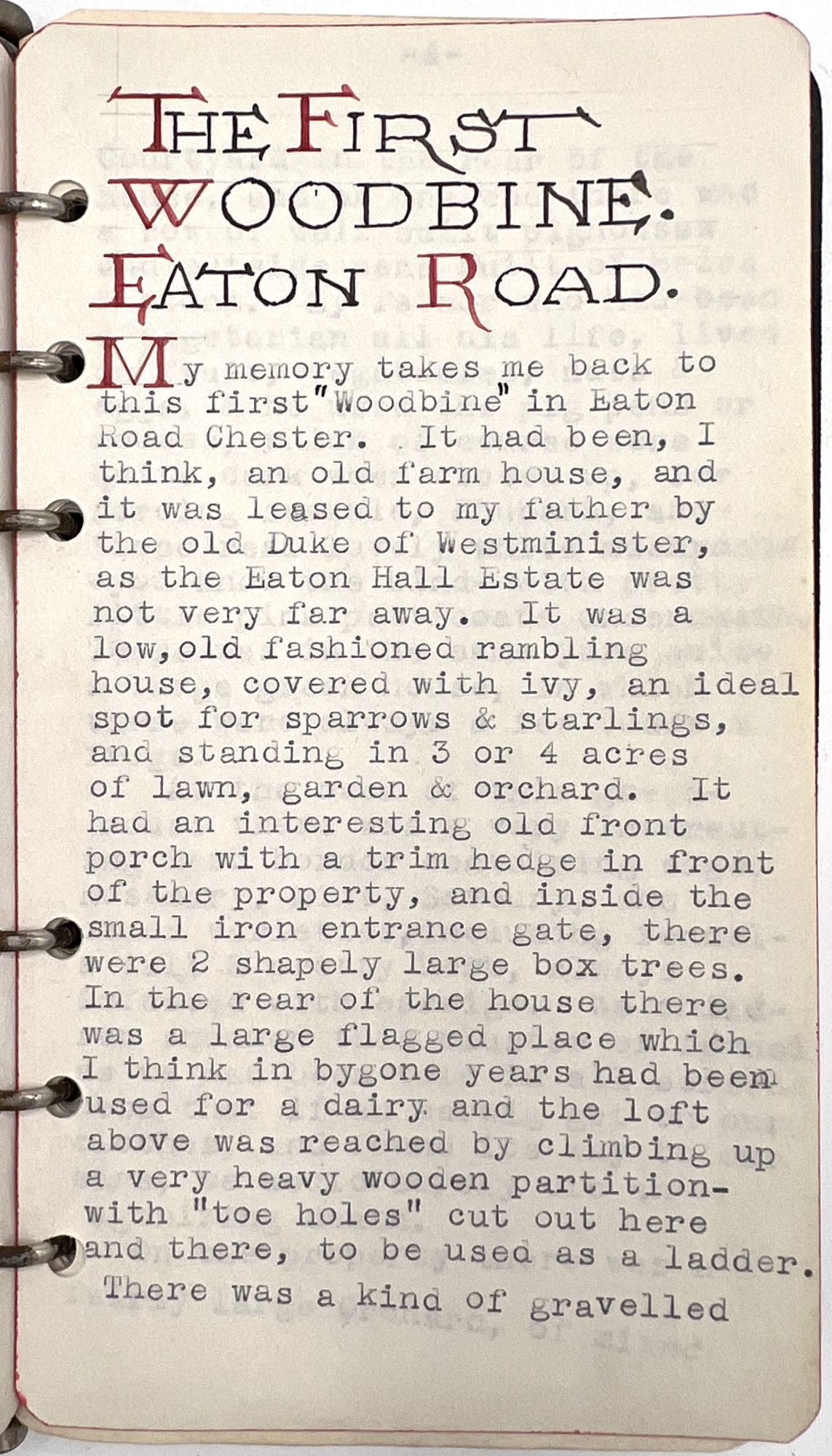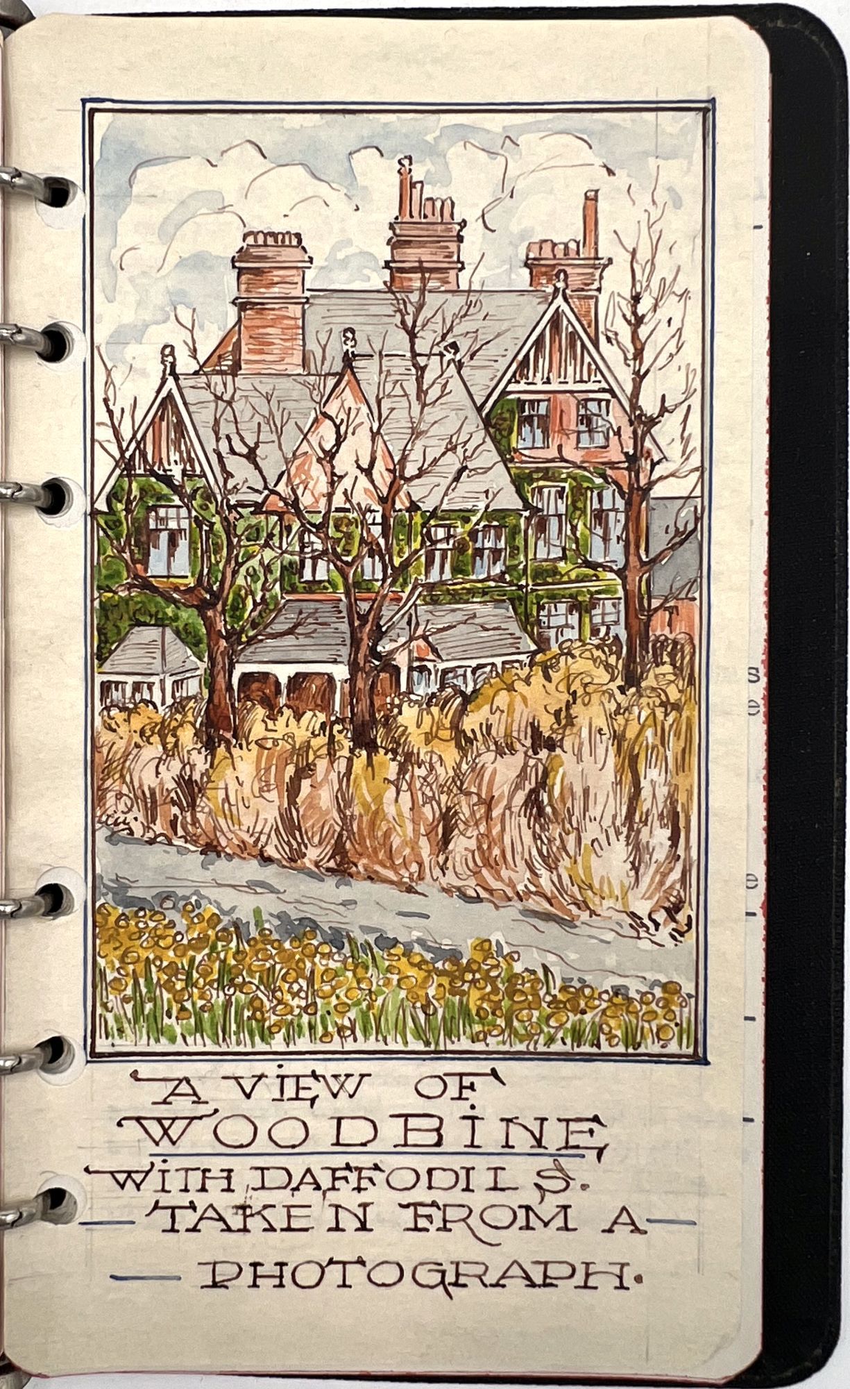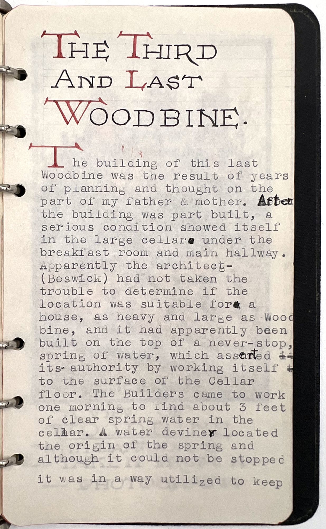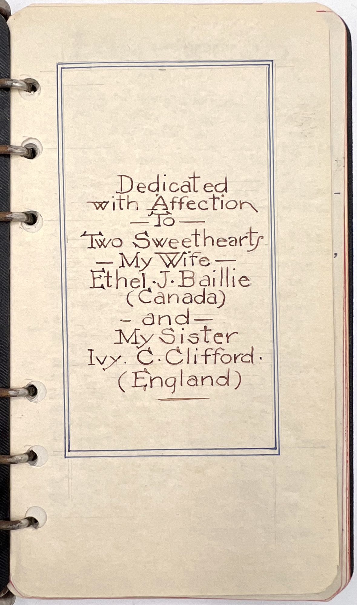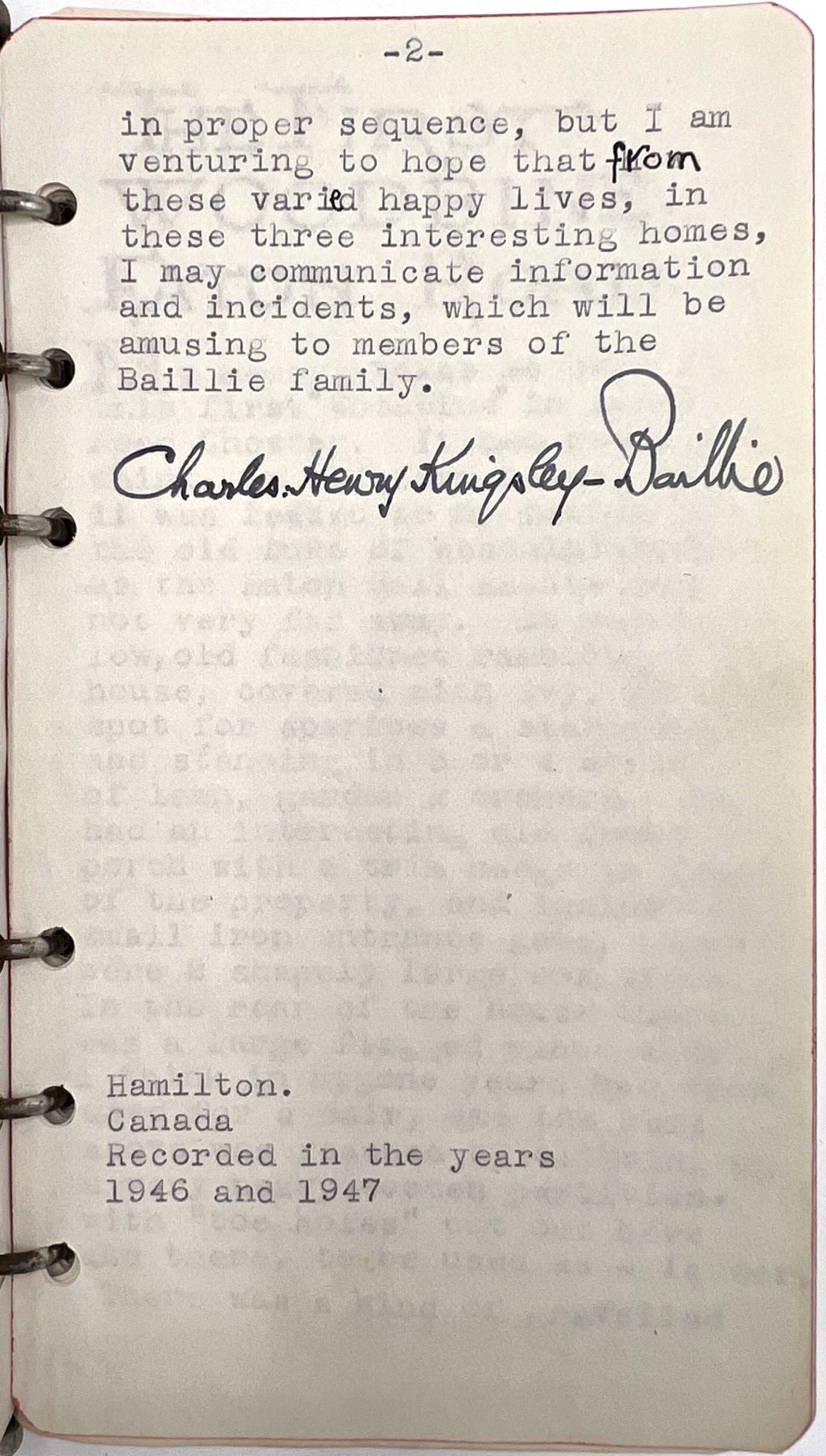 Hamilton, Canada, 1947. Very good.. Housed in a contemporary box with the watercolor monogram (IC) for his sister Ivy Clifford. When opened one finds a 55 pp. typewritten autobiography of the childhood recollections of Charles Henry Kingsley-Baille. Dedicated to his wife, Ethel and his sister Ivy. Kingsley-Baille had moved to Canada as a young adult. The foreward describes the occasion for writing the memoir being the death of his wife's grandmother and the regrets of her granddaughter on not having recorded her life's recollections. Signed by the author at the end of the Foreward. Written in three parts with 11 relevant watercolors. Charles was the third son of Edmund John Baillie, a successful nurseryman, the three parts centering on the three Chester (England) houses the family lived in, all named Woodbine. The story concludes with the death of his father in 1897. Although he refers to it as an autobiography, the author remembers local characters, scenes and events as his family grew ever larger. His "father interested himself in several societies - the Chester Society of Natural Science, the Kingsley Memorial Society, the Ruskin Society, the Archaeological Society of Chester, and several others. He was most active in promoting the erection of the Grosvenor Museum in Chester, which was made possible by the generosity of the Duke of Westminster, who donated the building site, and started the fund with a cheque for £10,000". Charles also remembers an original watercolor by Ruskin given to his father by the artist which hung above his mother's desk, as well as other pictures and letters of Ruskin and "an immense brown and white decorative panel by Walter Crane". Among the other works owned was an immense picture by Dame Clara Knight and one of a Pomeranian dog "by an artist friend of father's - Arthur Boddington - a very strange man - and a confirmed agnostic.