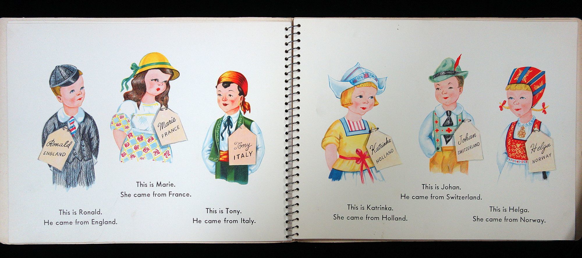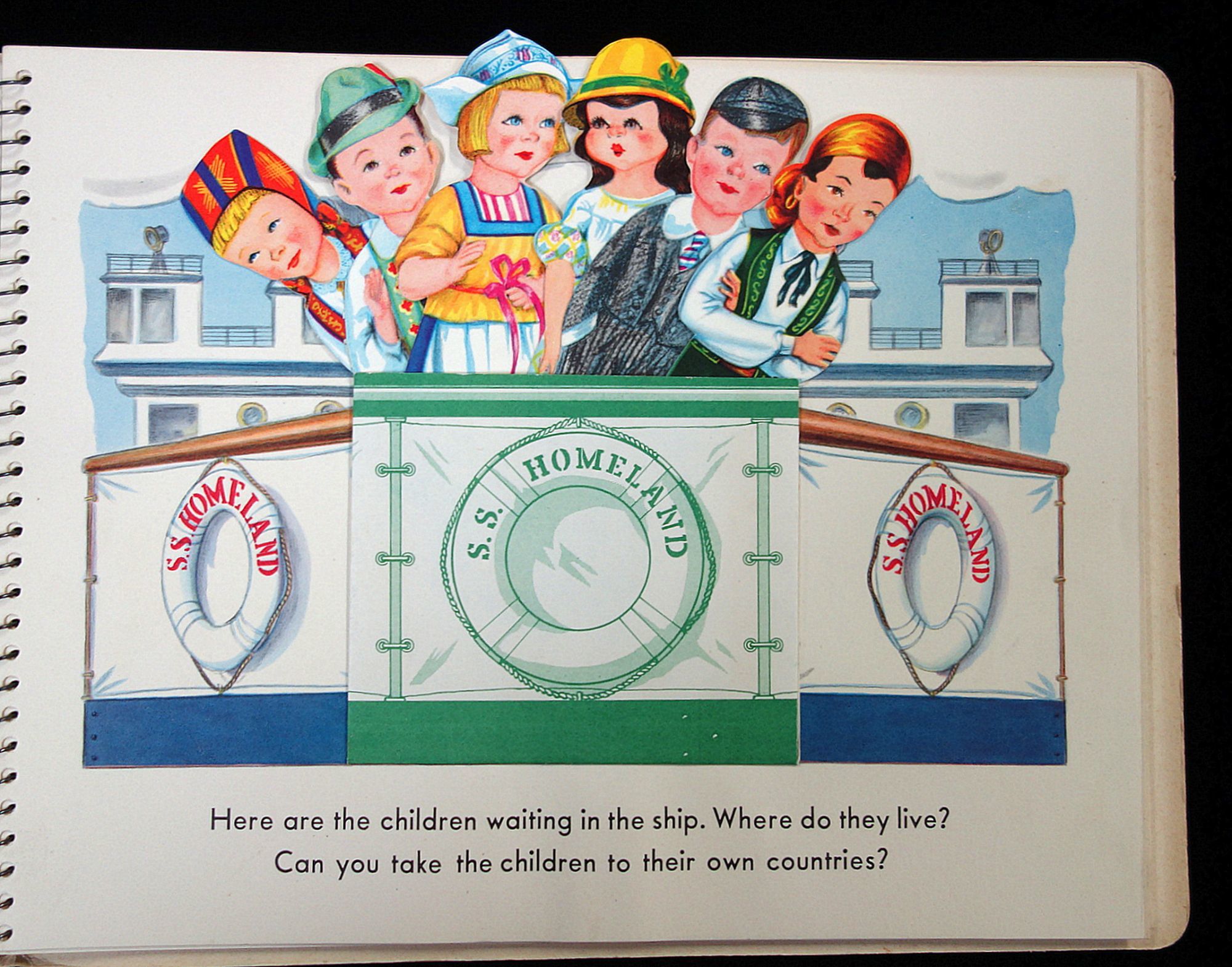 United States: Dorothy K. Werblow, 1951. The book is in good condition. There is some wear around the rings of the binding from use, but is still strong. It has all six of the cut outs and the slots in the maps are in good condition as well.. Take the Children is an unique, interactive story, that involves the reader in a game. 24 pages. It is representative of Dorothy N. Knights signature style. Spiral bound litho on heavy paper covers. The book begins with six children from different lands boarding the ship. The children are actual die-cut 5 1/4" children dressed in regional attire from England, France, Italy, Holland, Switzerland and Norway. The objective is to insert the appropriate child in the slot in the map of his or her homeland. The last two pages show the children in their appropriate countries. 7 1/2" x 9 3/4