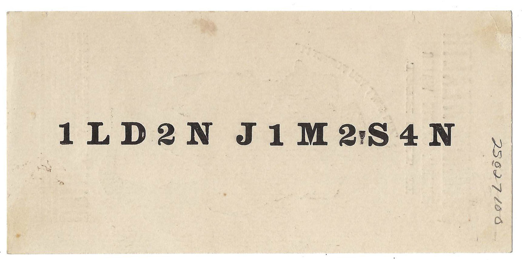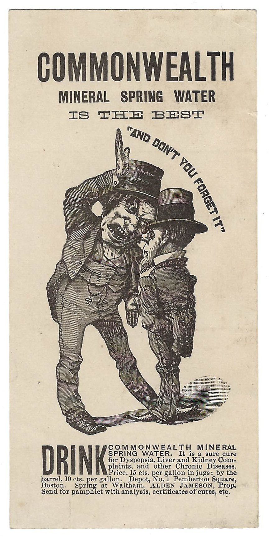 [Boston, Massachusetts]: Commonwealth Mineral Spring Water, 1900. Very good. Minor toning, one or two spots.. Advertising card for Commonwealth Mineral Spring Water, with a humorous image of two men on the recto alongside bold claims for the water's efficacy as a cure-all: "It is a sure cure for Dyspepsia, Liver and Kidney Complaints, and other Chronic Diseases". On the verso is a curious message hidden in code. Measures 5.5" by 2.5