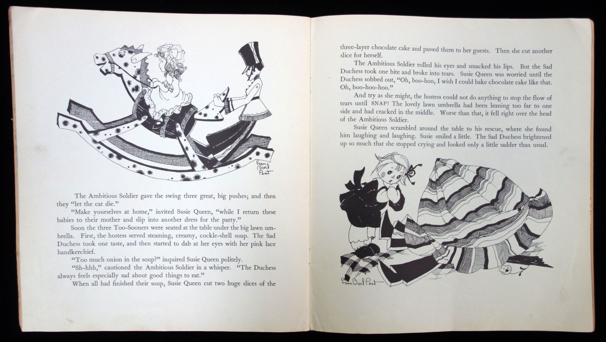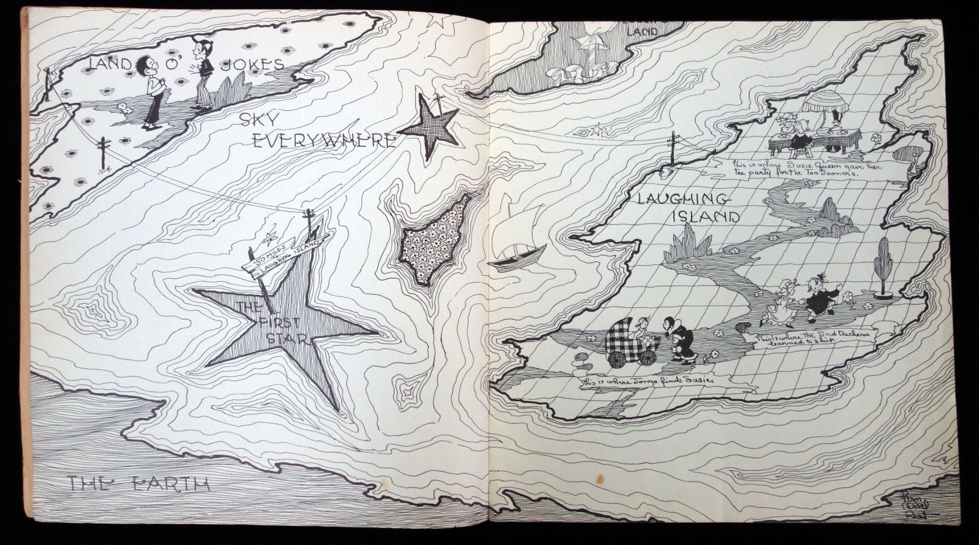 Akron. O.: Saalfield Publ. Co, 1939. Illustrated soft cover. Unpaginated. Begins with two page topographical map of Laughing Island and neighboring land masses. This is followed by the title page. Full page illustrations throughout plus numerous in-text black and white illustrations . Dear imagery of humanized dolls on their adventure. Measures 10 1/4" x 9 1/4" Penciling and ink inscription inside covers and blank free end paper Previous owner attempting to learn his street address.