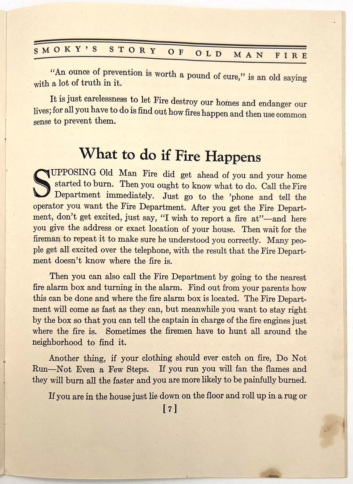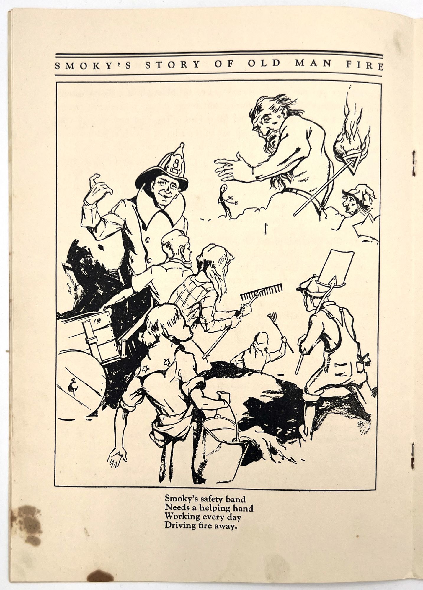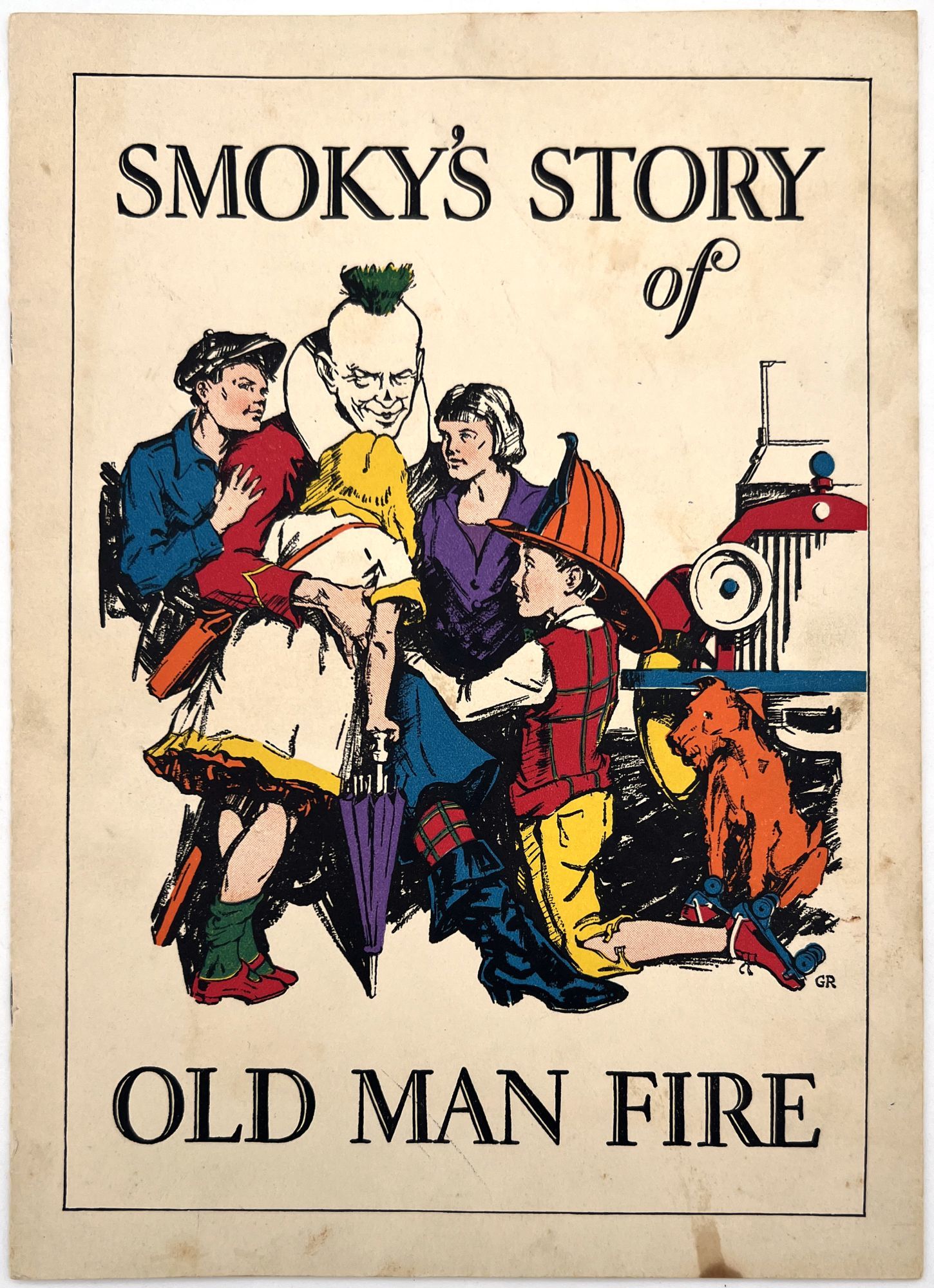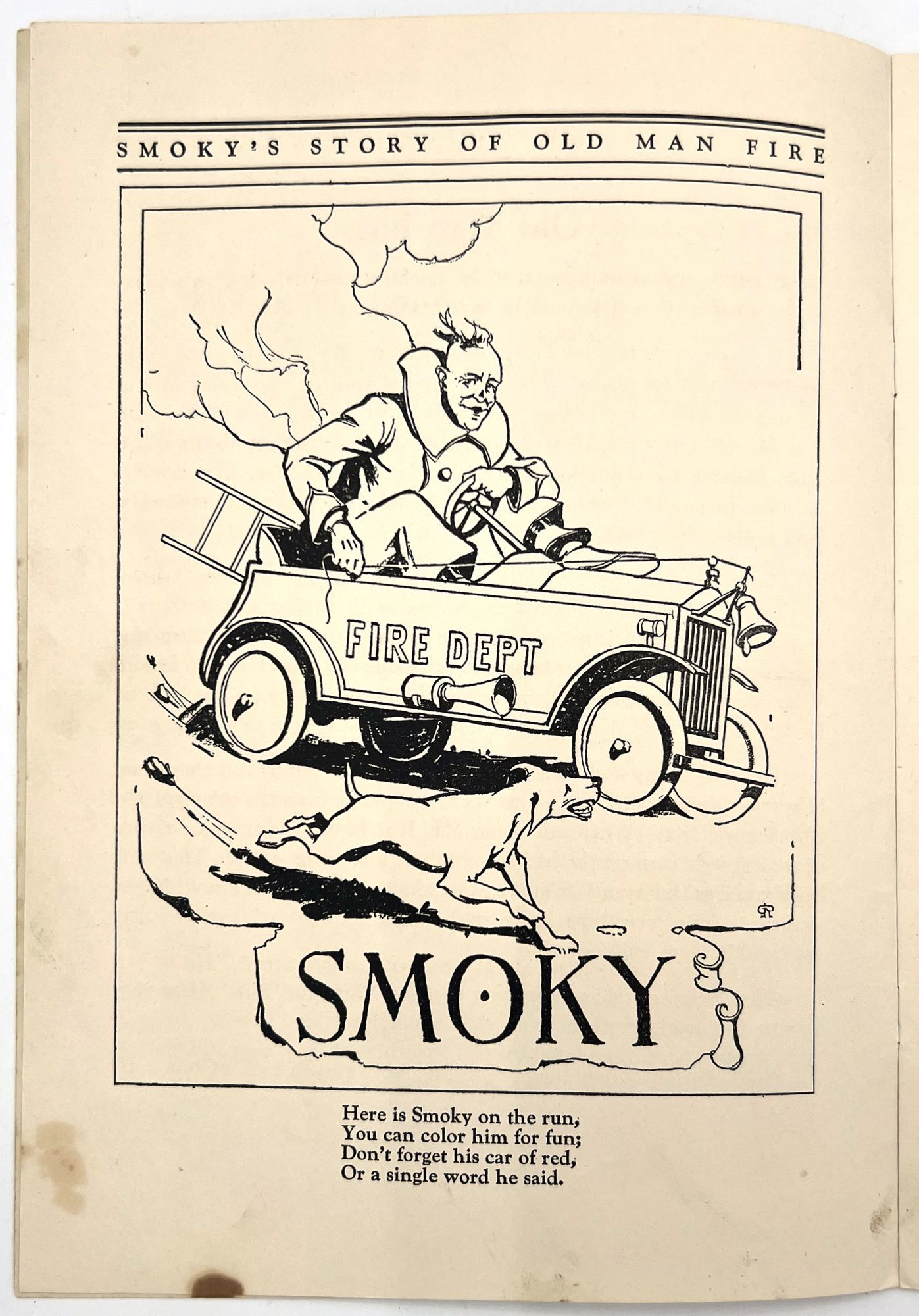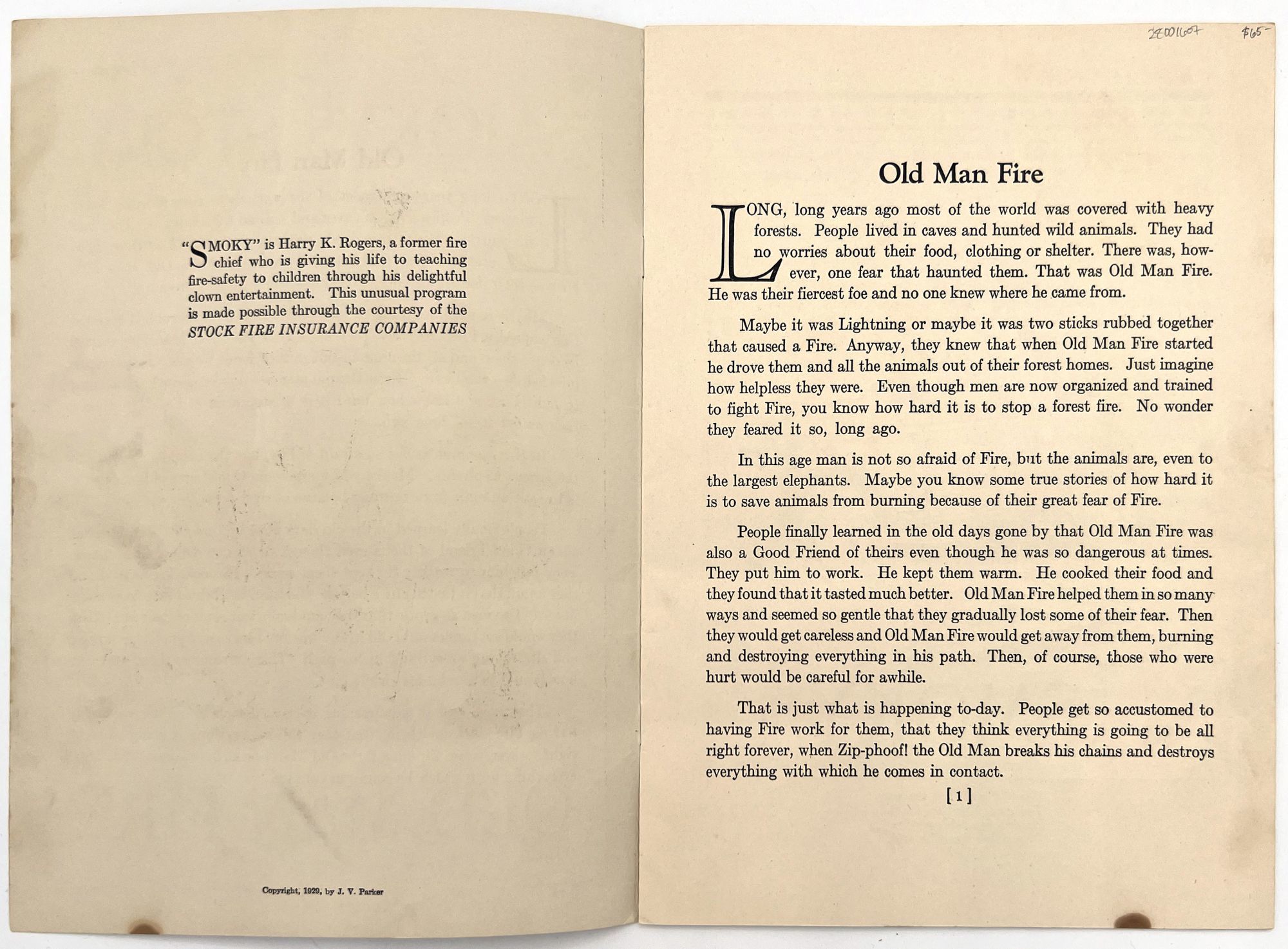 Stock Fire Insurance Company, 1929. Toning due to age. Stain on the bottom right that goes through book but does not affect the text or illustrations.. J. V. Parker. This book tells the story of Old Man Fire, and his friends (ex. Mr. Innocent Looking Match and Mr. Smouldering [sp.] Cigarette). The story starts off saying how Old Man Fire was mankind's friend. He kept them warm and cooked their food, but if they were careless he would "break his chain and destroy everything with which he comes in contact [with]." The front cover is a color illustration depicting Smoky surrounded by children. The book was given out at the end of a fire-safety course taught to children. The course is taught to the children by Smoky, the Fire Clown who was created and portrayed by Harry K. Rogers, a former fire chief.