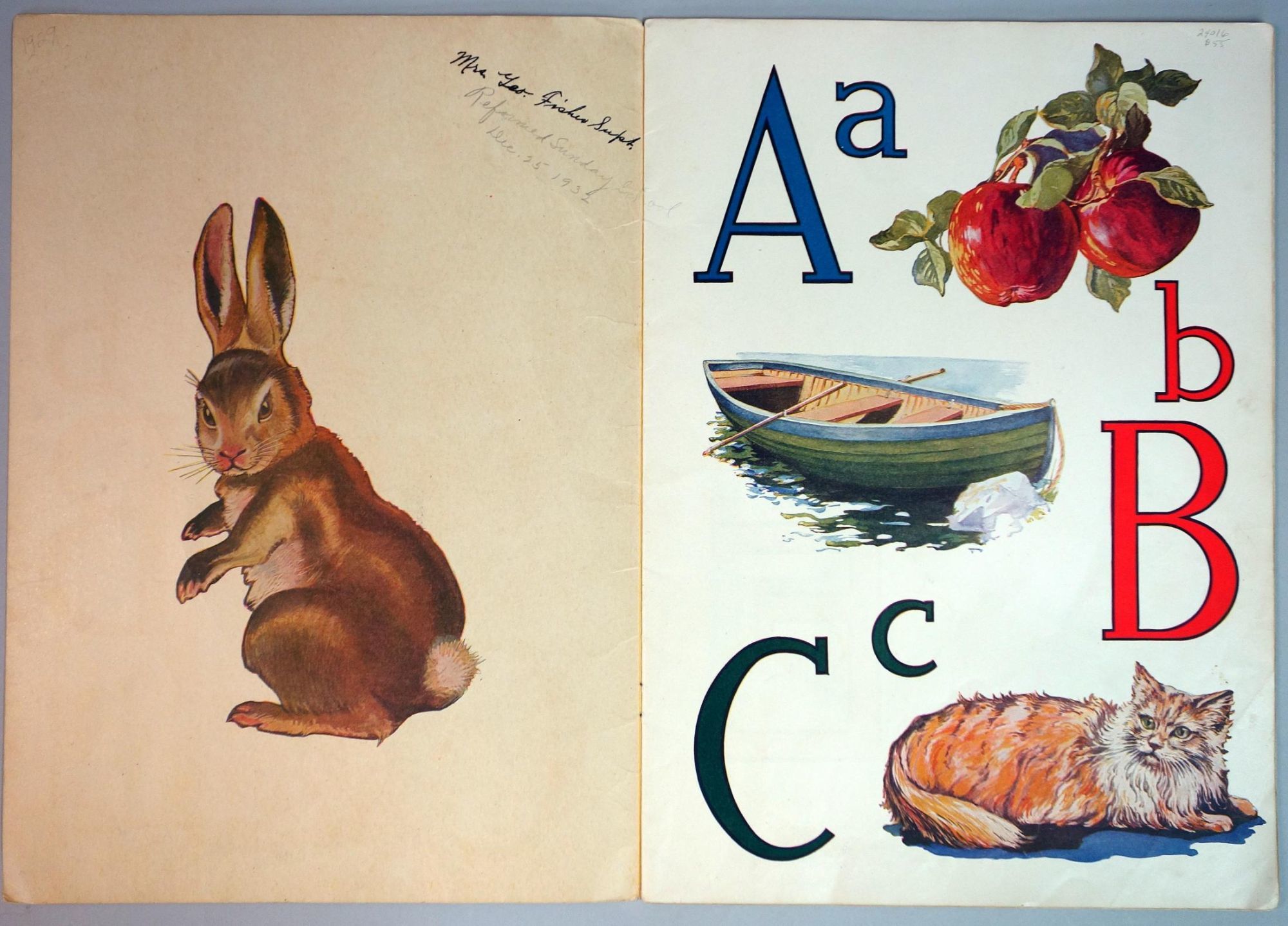 Akron OH: Saalfield Pub. Co, 1929. Moderate cover wear. Center page present, detached from staples.. No. 923. Large format ABC picture book with cover illustrations of bookseller with children curiously looking through his wares. Picture book with illustrations K for Kangaroo, S for Seasaw, Z for Zebra. Measures 10" x 14