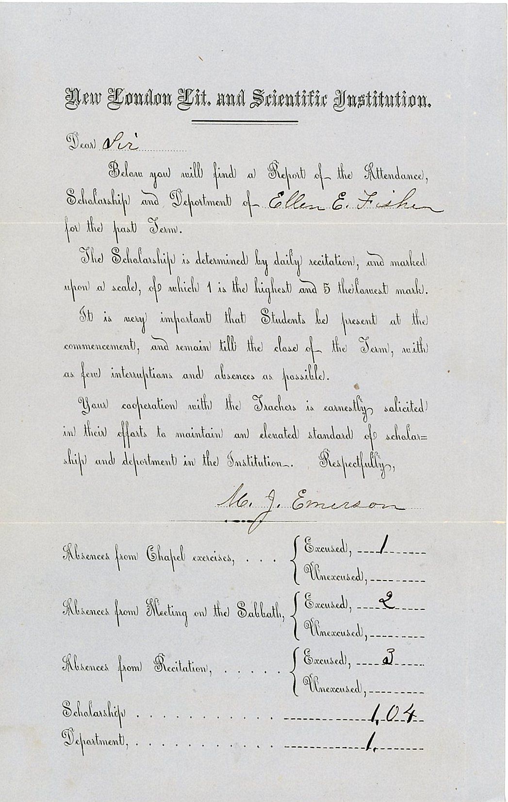 New London, CT: New London Literature and Science Institution, 1878. Letter folds.. A printed 8" x 5 1/4" form completed by M. J. Emerson for Ellen E. Fisher. The narrative discusses scholarship, attendance and cooperation with teachers. The student's information is recorded on Absences from Chapel exercises, Meeting on the Sabbath and Recitation and rated on Scholarship and Deportment. New London Literary and Scientific Institution - In 1854, the Ladies Boarding House (later called Heidelberg) was built on what is now the New London green to accommodate up to 40 female students and the female faculty. Anthony Colby also purchased the original New London town meeting house and moved it to campus, where it was renovated to provide 20 double rooms for the male students. The building is called Colby Hall. In 1870, a brick Academy building was dedicated, located on the present site of Colgate Hall. The building provided dormitory space for 100 female students as well as classrooms, laboratories, library, gymnastic facilities, chapel, dining room, kitchen and laundry facilities. It burned in 1892.