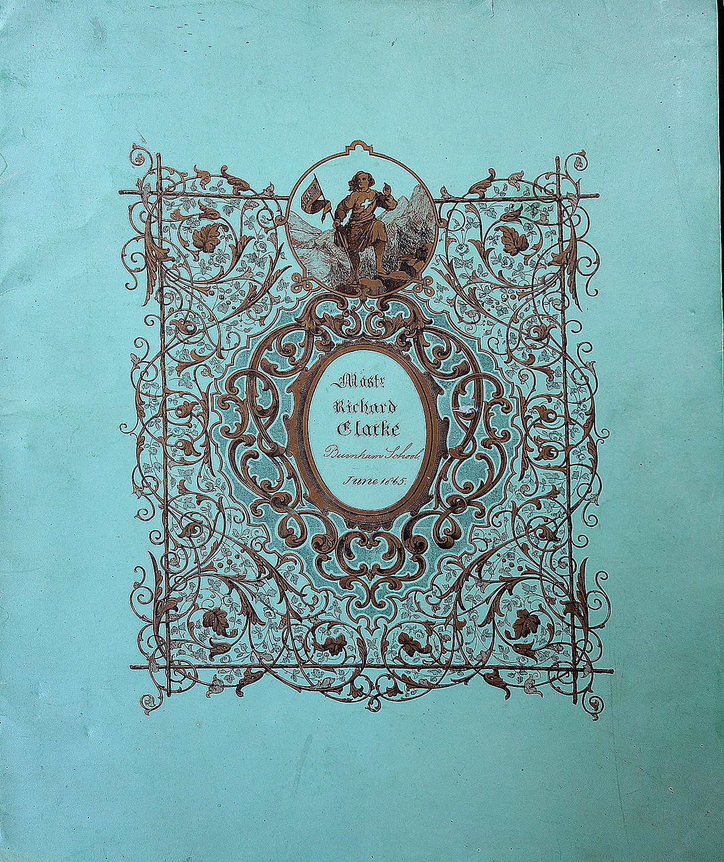 Northampton, MA, 1865. Silk ribbon binding has deteriorated to some degree. Covers detached from block.. 4 leaves. Elaborately decorated cover with gilt enhanced illustrated of boy conquering a mountain. He carries a flag reading "Excelsior". He has penned "Mastr Richard Clarke Burnham School. June 1845" in the cartouche. A large format album with decorative border designs printed in different colors with different flowers and flourishes. Master Clarke has copied four (4) verses each with some illuminated and otherwise accentuated letters. The verses are
