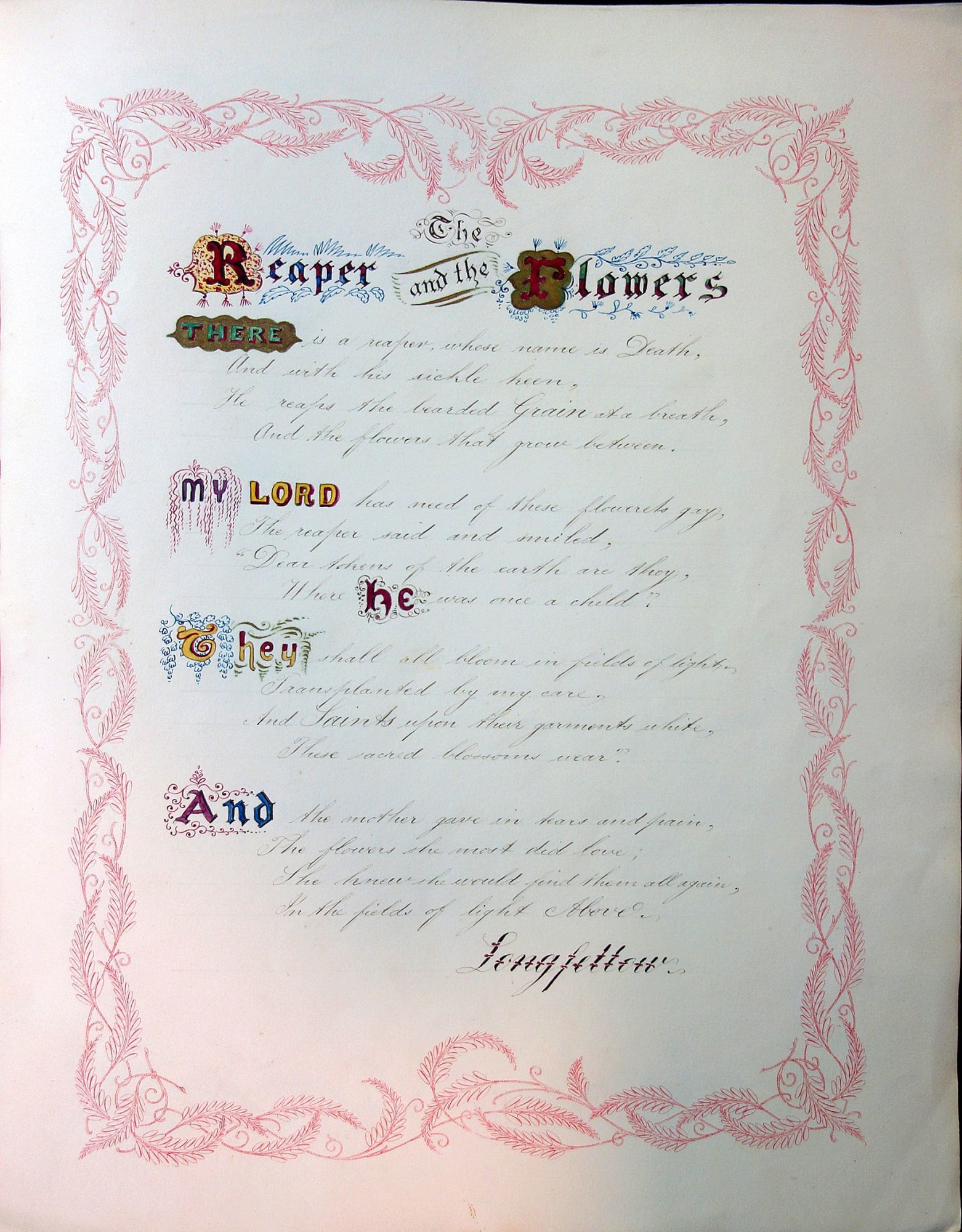 Each of the titled with a different flare - of particular note is The Moss Rose created of miniature penned moss and roses. Numerous fine accents from the weeping willow "MY" to the grape arbor "They". Special attributes have been used in lettering the poets names. Measures 17" x 13