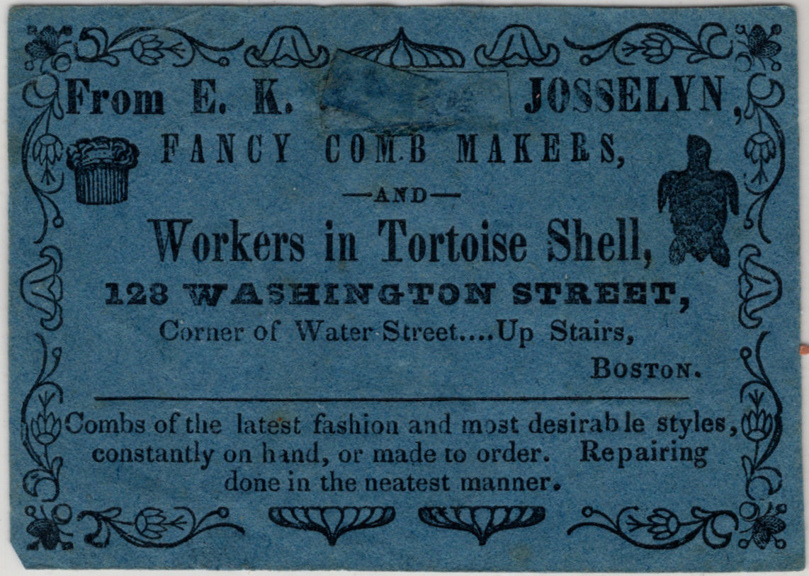 Boston, Massachusetts. Very good. Surface wear with a small cancel slip to front.. Illustrated advertising card for fancy comb makers E.K. Josselyn of Boston. Promotes their repair service, and fine work in tortoise shell. Combs "of the latest fashion". Measures approx. 2" by 2.75", verso blank.
