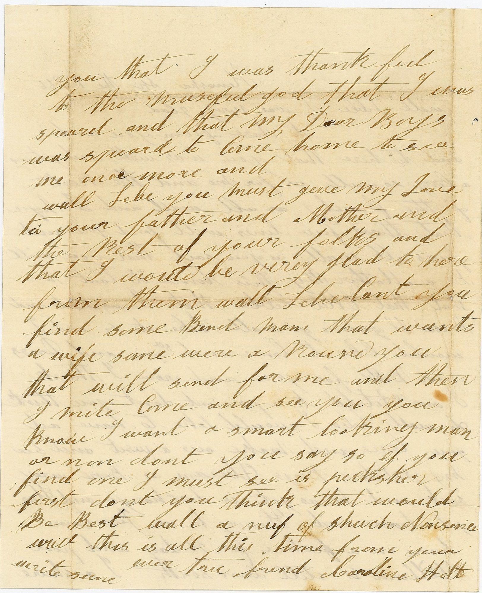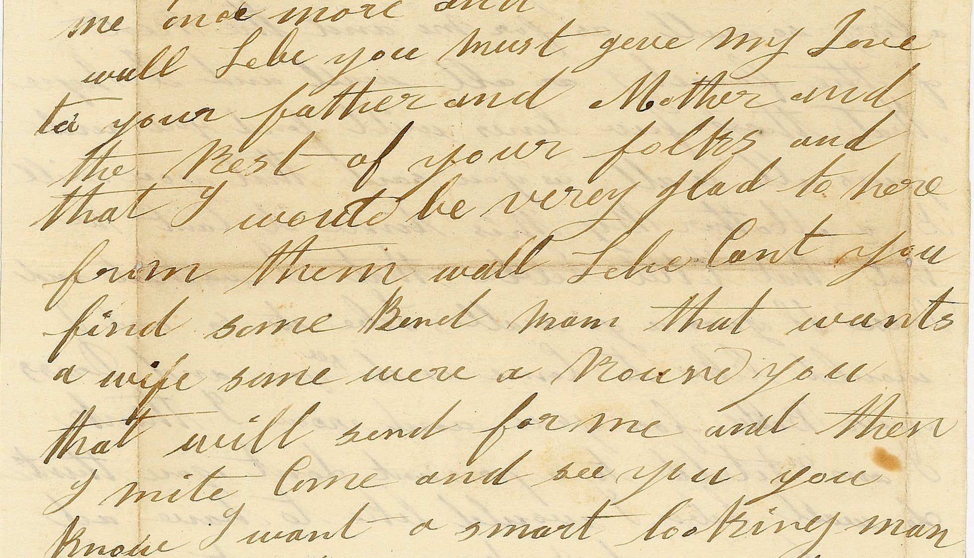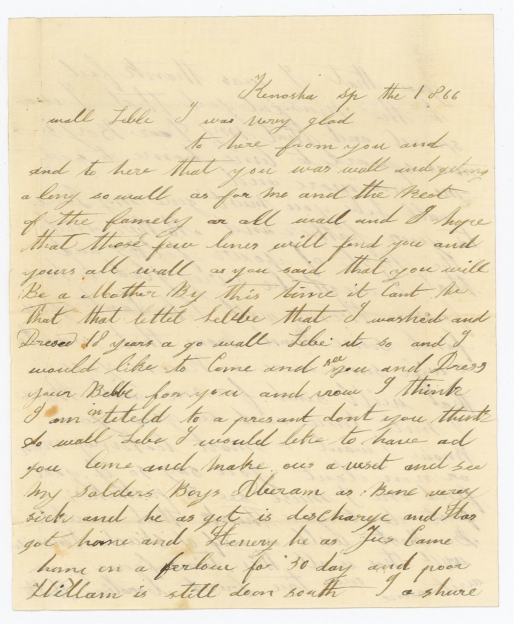 Kenosha, WI, 1866. An 8" x 6 1/2" letter sheet with letter to "Lebbe" penned on both sides. A friend or former care giver getting in touch with a dear one with information on daily life and her sons returning from the war. Of particular note is the use of colloquial phonetic spelling. The letter begins "Wall Lebbe I was very glad to here from you and to here that you was wall and geting a long so wall as for me and the Rest of the famely ar all wall and I hope that those few lines will fond you and yours all wall as you said that you will Be a Mother By this time it Cant be that that lettel bebbe that I washed and dreed 18 years a go wall Lebe it so and I would like to Come and see you and Dress your Bebbe for you and now I think i am in titeld to a presant dont you think So wall Lebe I would like to have ad you Come and make ous a veset and see my solders Boys Abram as Bene verey sick and he as get his descharge and Has got home and Henery he as Jus Came home on a ferlow for 30 days and poor William is stil doon south. .." This is only the front page of the letter; quite interesting.