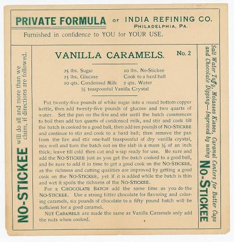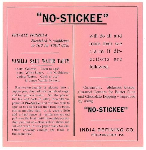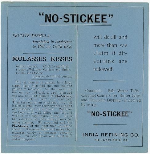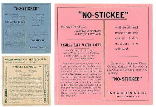 Philadelphia, PA, 1915. Good, slightly worn with a slight crease down the middle. No-Stickee is a product created by the India Refining Company, which specialized in vegetable butters. The three separate recipe cards are to advertise the No-Stickee product to use with candy, promising to not only make candy stable and cut easily, but to also prevent it from sticking to teeth. Each recipe card has a different candy that includes use of the product. One is pink, one white, one blue, and the print is on one side. Each measures 5 3/4" x 5 1/2" India Refining Co. produced a "Science in Confectionary" booklet which included recipes that were altered for the use of their product. The three recipe cards seem to be taken from or inspired by the booklet.