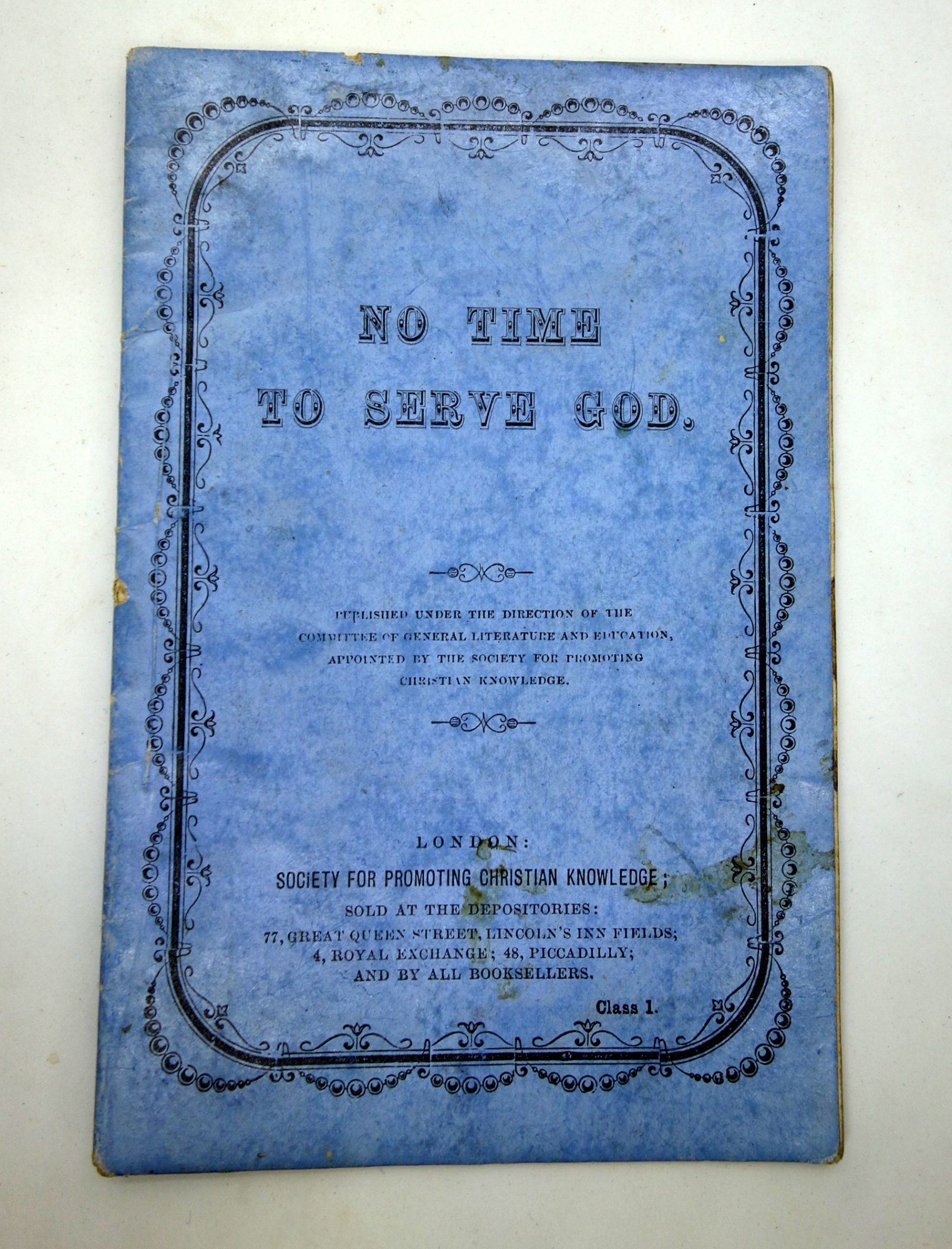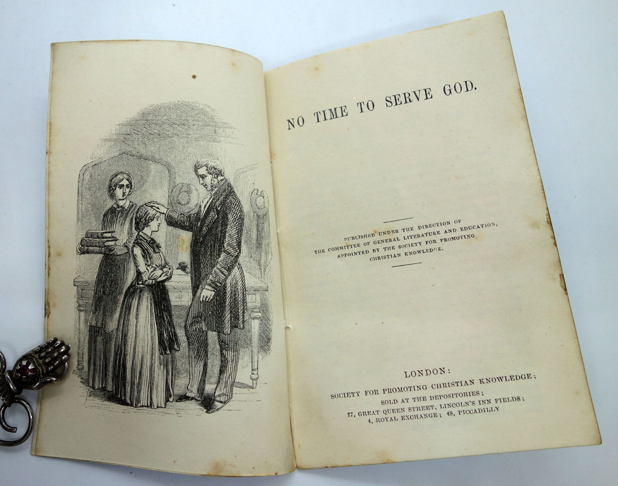 London: Truscott, Son & Simmons. Stains from unknown substance on the front and back cover, light wear on the spine. Printed under the direction of the committee of general literature and education, appointed by the Society for Promoting Christian Knowledge". 18 pages, bound in blue paper wrapper with decorative border; engraved frontisepiece. Inscription dated 1864. Tells the story of a young woman learning to prioritize God above all things. Includes unusual footnote on page 14: for the line "Dreadful! dreadful! he did not serve God, and he is dead!"(asterisk), the corresponding note says "Fact". 3" x 5". OCLC-0 (Aug, 2018).