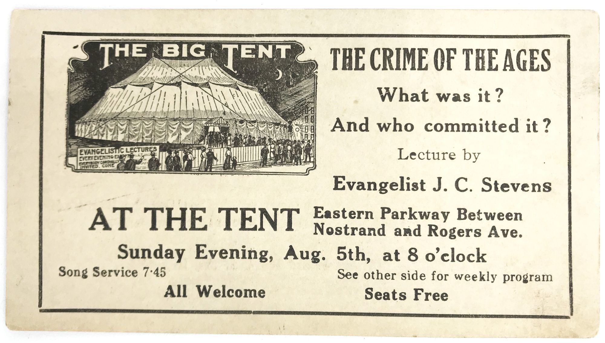 [Brooklyn, New York]: J.C.. Stevens, 1917. Fine.. Advertising card for a free lecture by evangelist J.C.. Stevens given in Brooklyn on August 5th, 1917, "At the Tent". J.C.. Stevens evangelized in the late 1910s, offering free public lectures with titles such as "Is the Great War the Last the World Will Ever See?" (Brooklyn Eagle, 10 Aug 1918) and "What is the Mark of the Beast and His Number 666?" (3 March, 1917). Brooklyn seems to be his most frequent venue, though we have identified at least one of his lectures as taking place in Michigan.