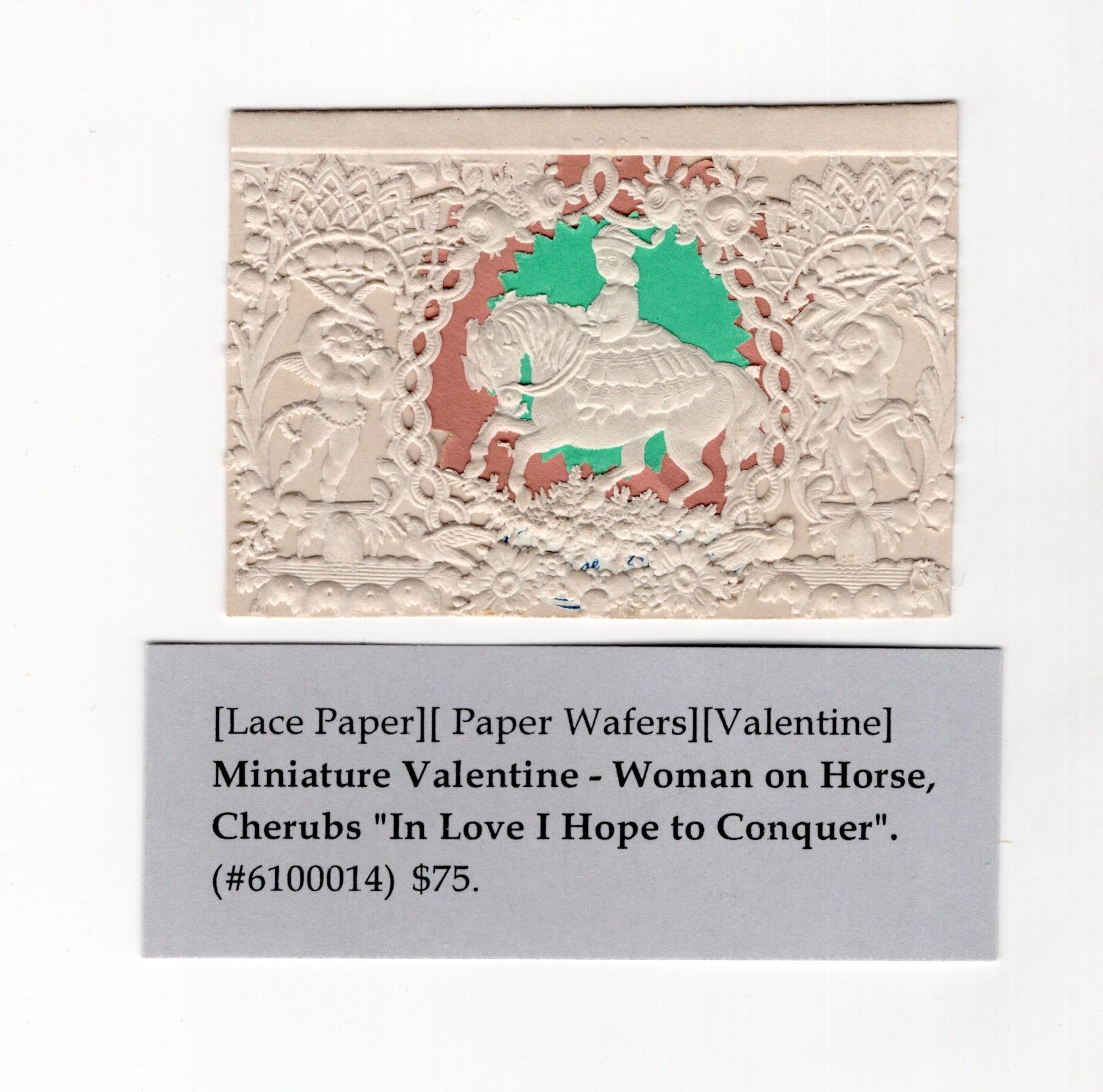 London, 1850. Very good to near-fine. Light toning. Lace paper in excellent shape.. A charming miniature 32mo valentine made from decorated paper peeking through pictorial lace paper. Image on the lace paper depicts a woman on a horse flanked by cherubs. When the lace paper is lifted, a small chromolithographed scrap reads "In love I hope to conquer". Bifolium measuring approx. 2" by 2.75