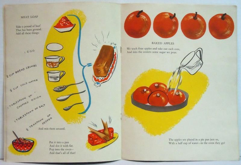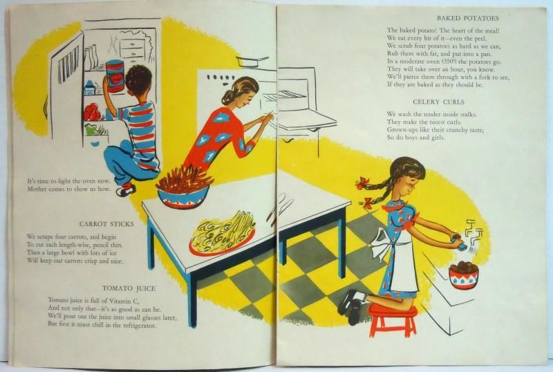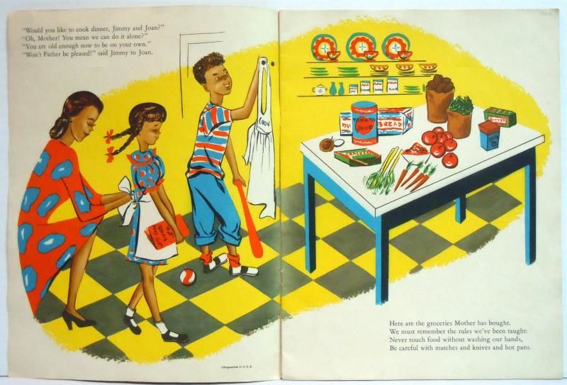 Children's Press Inc, 1946. light surface wear. Chicago: Children's Press Inc, 1946 light surface wear 12 pp linen book with illustrated covers Full color picture book with basic instructions for children on cooking a meal including ingredients, preparation information on setting a table Measures 9 1/2" x 13